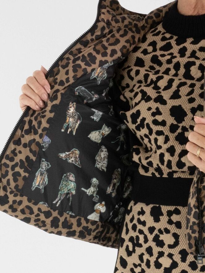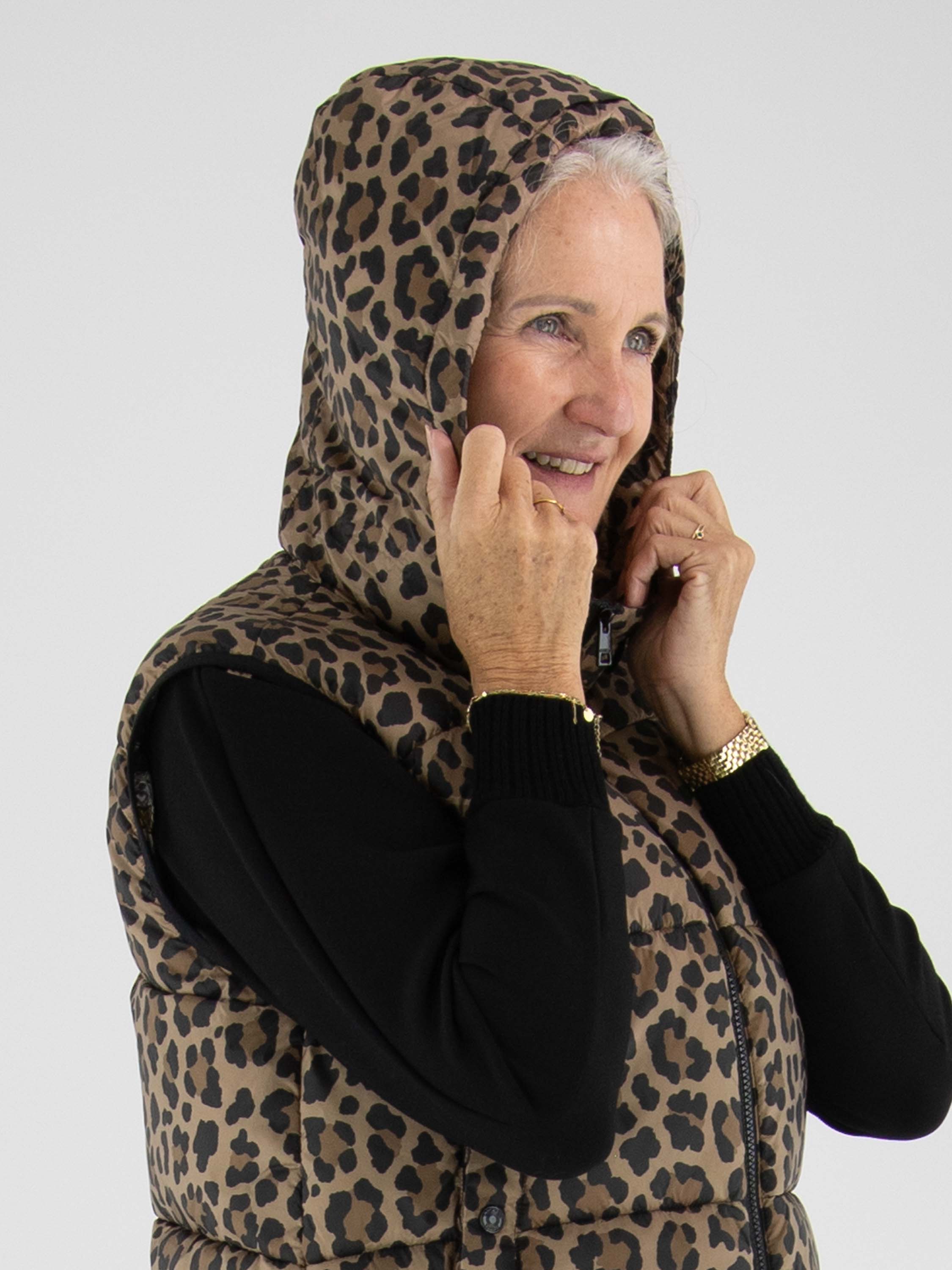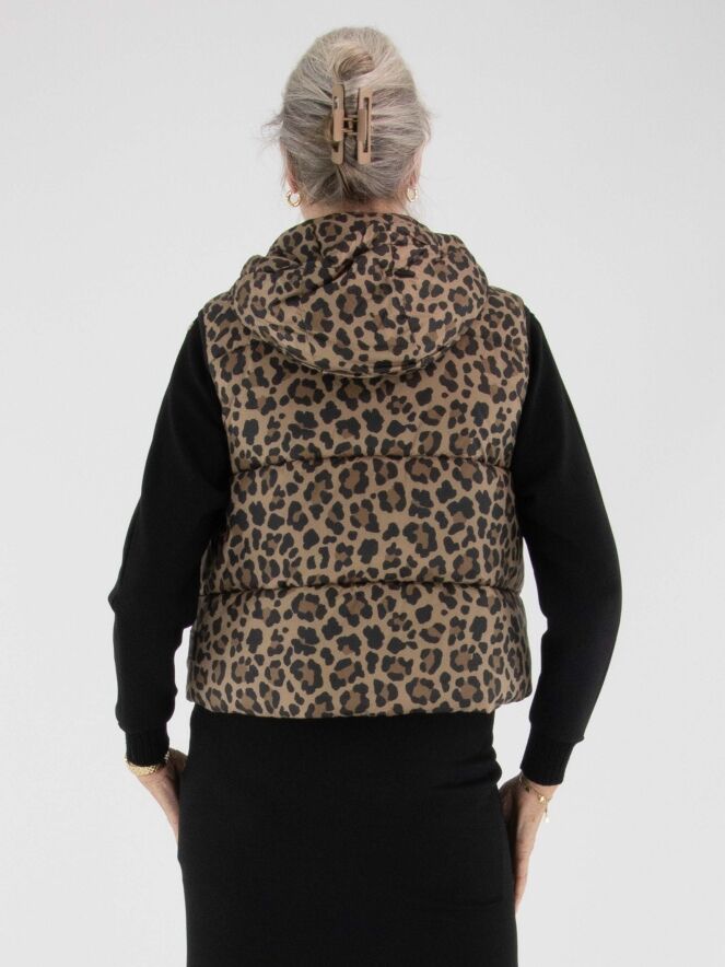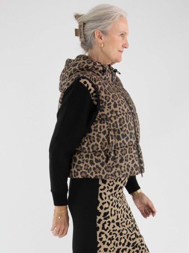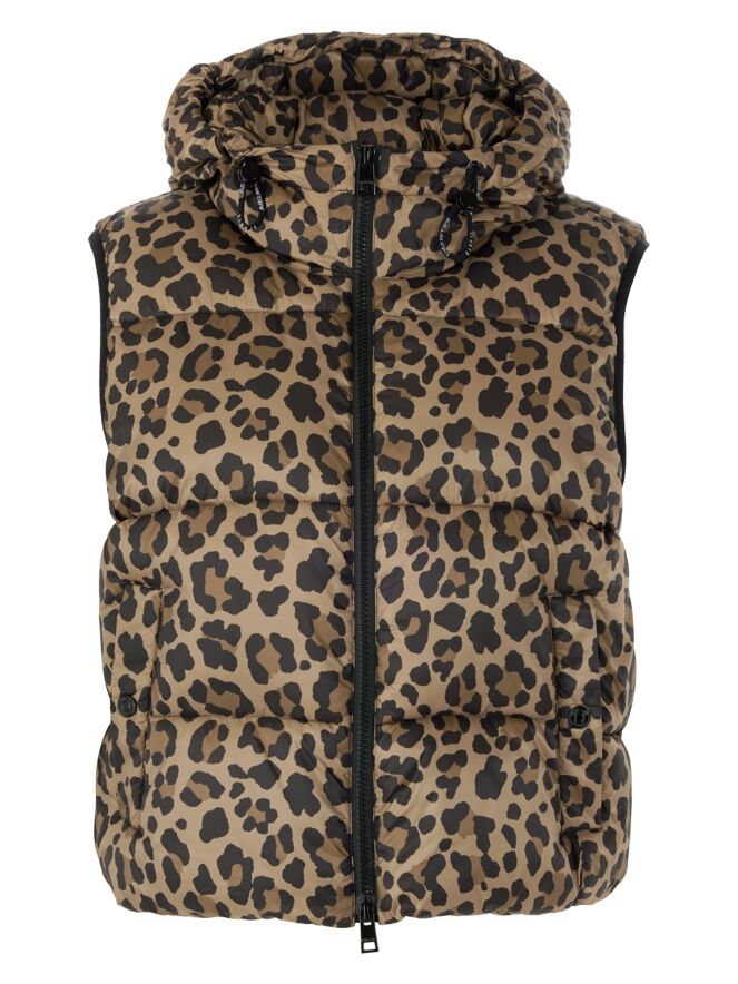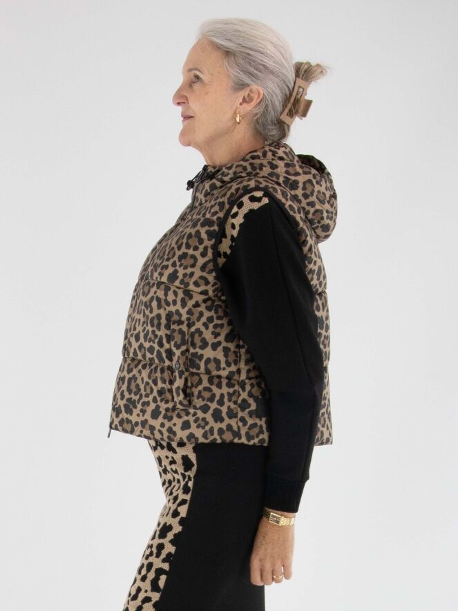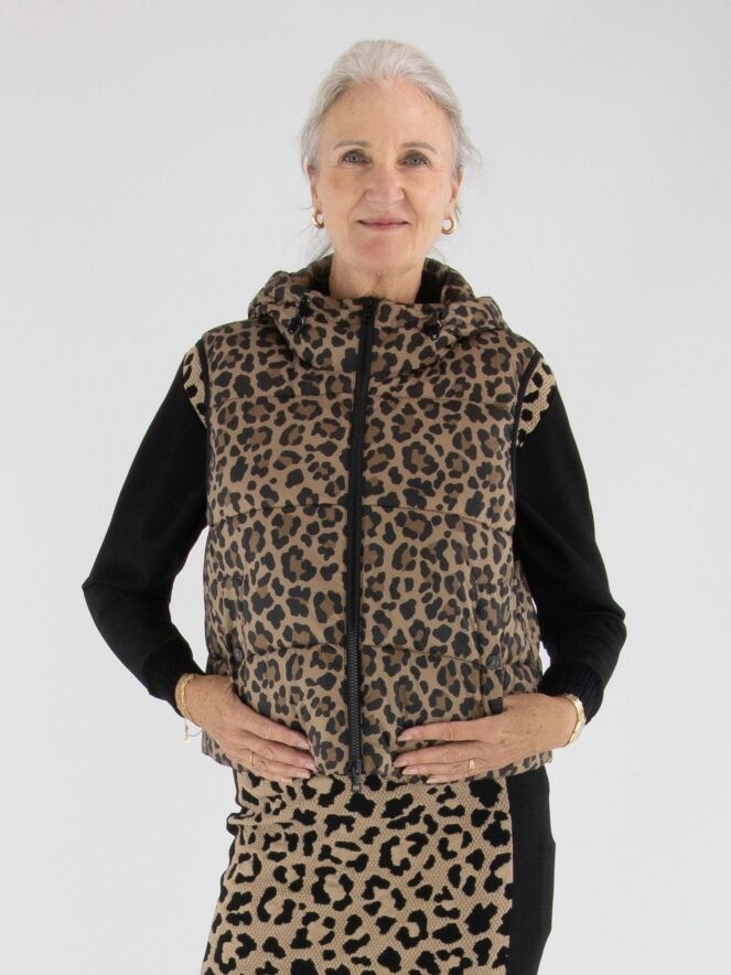 Eine kurze Weste von Marc Cain im Leopardenprint in Braun und Schwarz. Am Rand der Kapuze befindet sich ein Kordelzug in Tunnelverarbeitung, der individuell angepasst werden kann. Die Weste ist mit einem Reißverschluss und Seitentaschen mit Druckknopfverschluss ausgestattet. Diese Weste kann bei 30 Grad gewaschen werden.