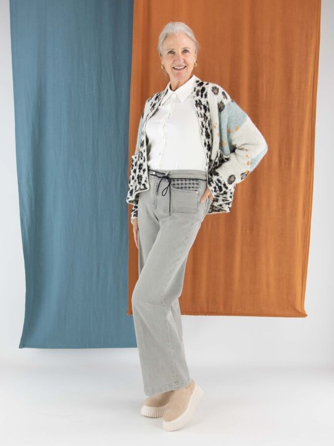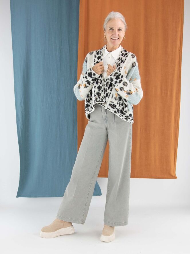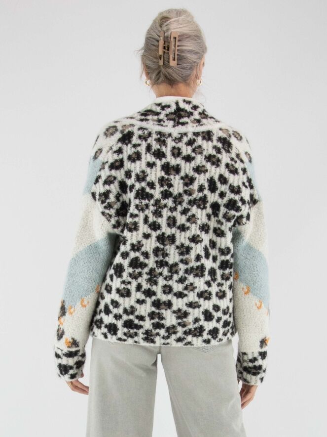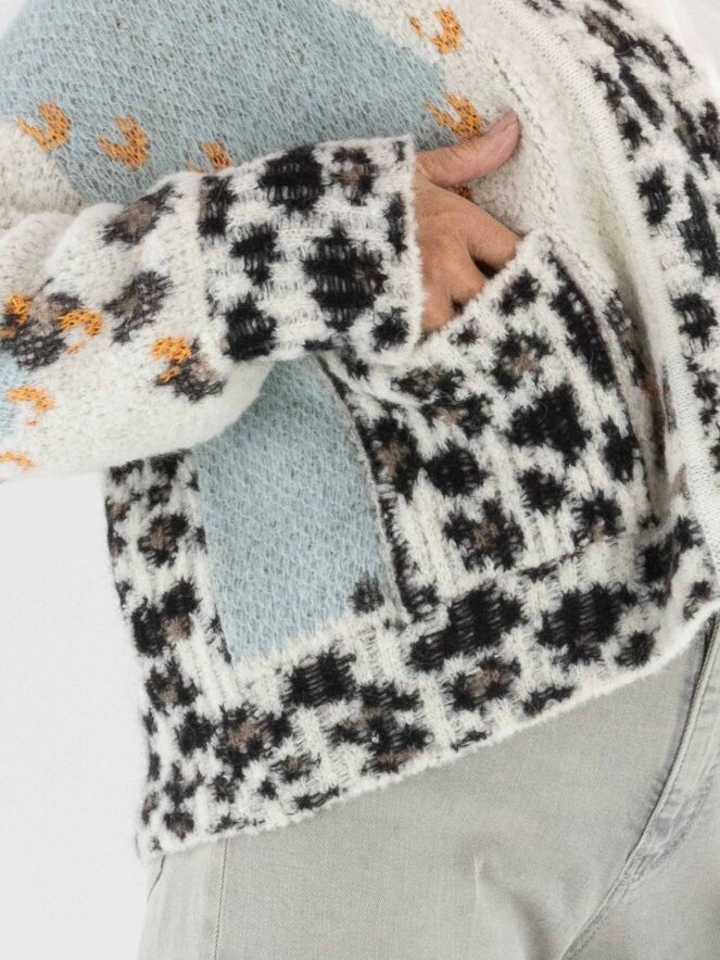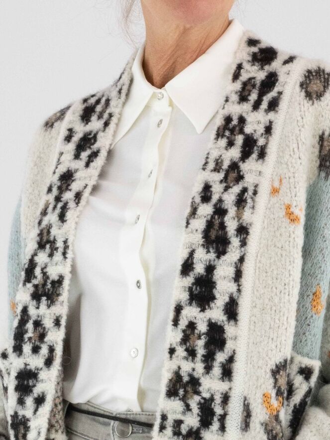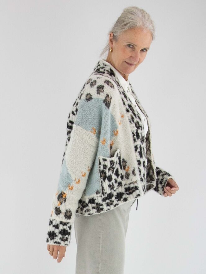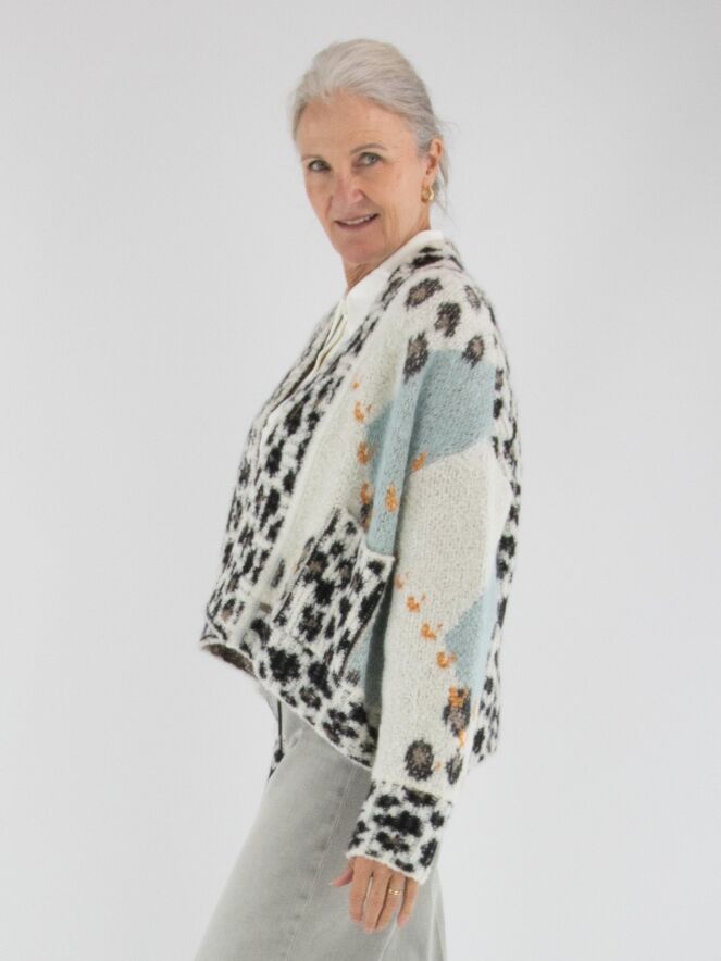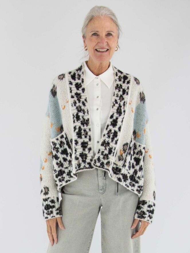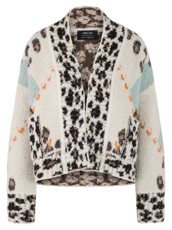 Eine stilvolle Strickjacke von Marc Cain mit einer feinen Argyle-Musterung auf der Vorderseite in Türkis-, Braun-, Orange- und Cremeweiß-Tönen. Entlang des Kragens setzt ein verspielter Leo-Print einen Akzent. Die Rückseite ist komplett im Leo-Muster gestrickt, was für einen markanten Kontrast sorgt. Die Jacke hat keinen Verschluss und kann per Hand gewaschen werden.