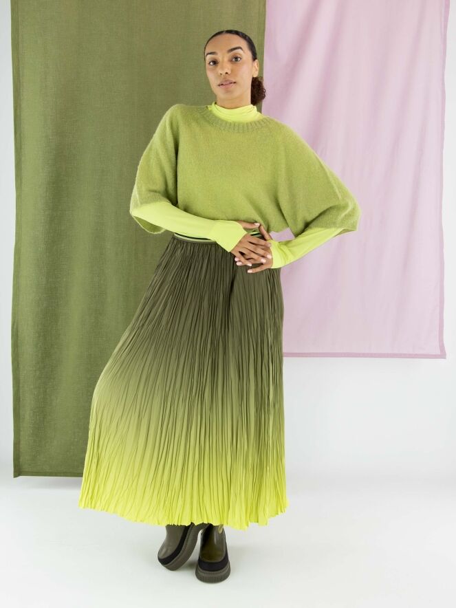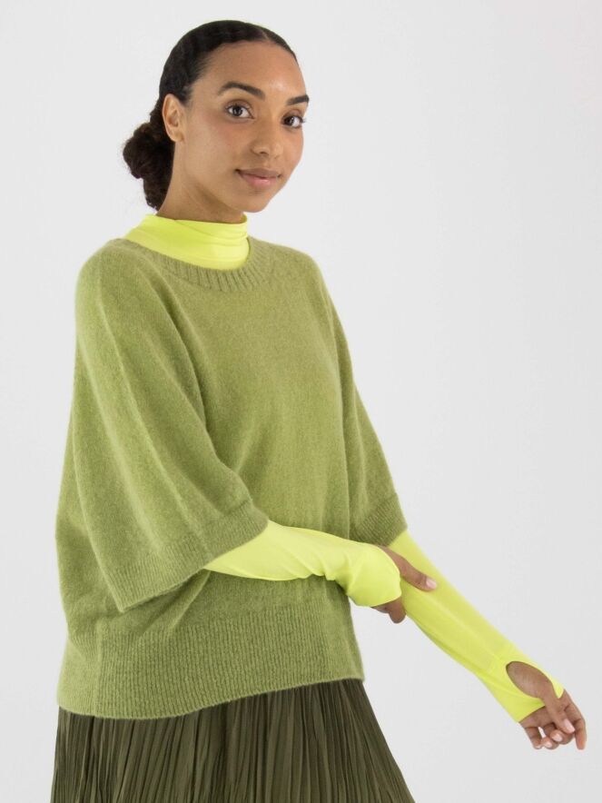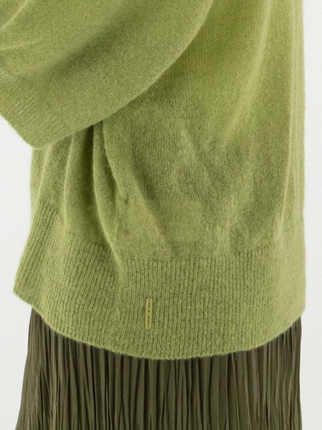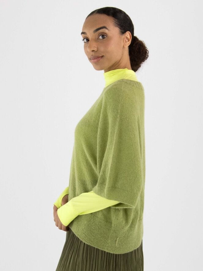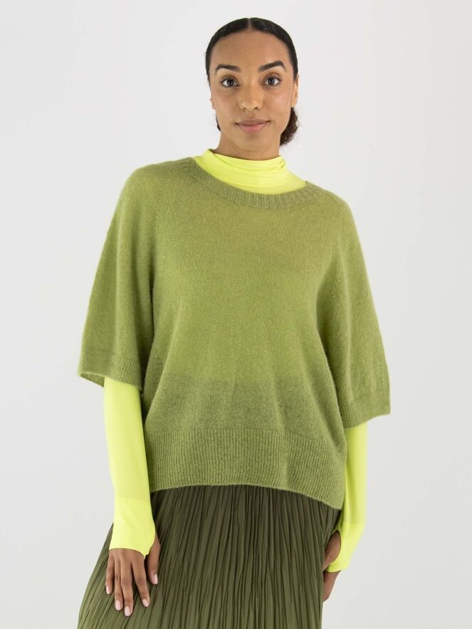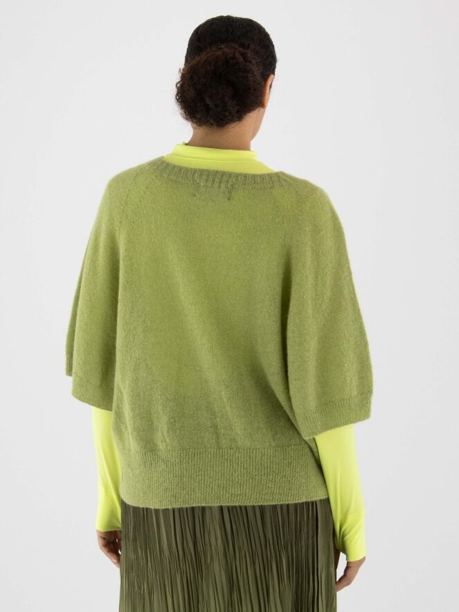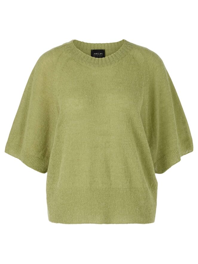 Melierter Pullover von Marc Cain in Pistaziengrün. Der Pullover hat einen runden Ausschnitt und kurze Ärmel. Dieser Pullover sollte von Hand gewaschen werden.