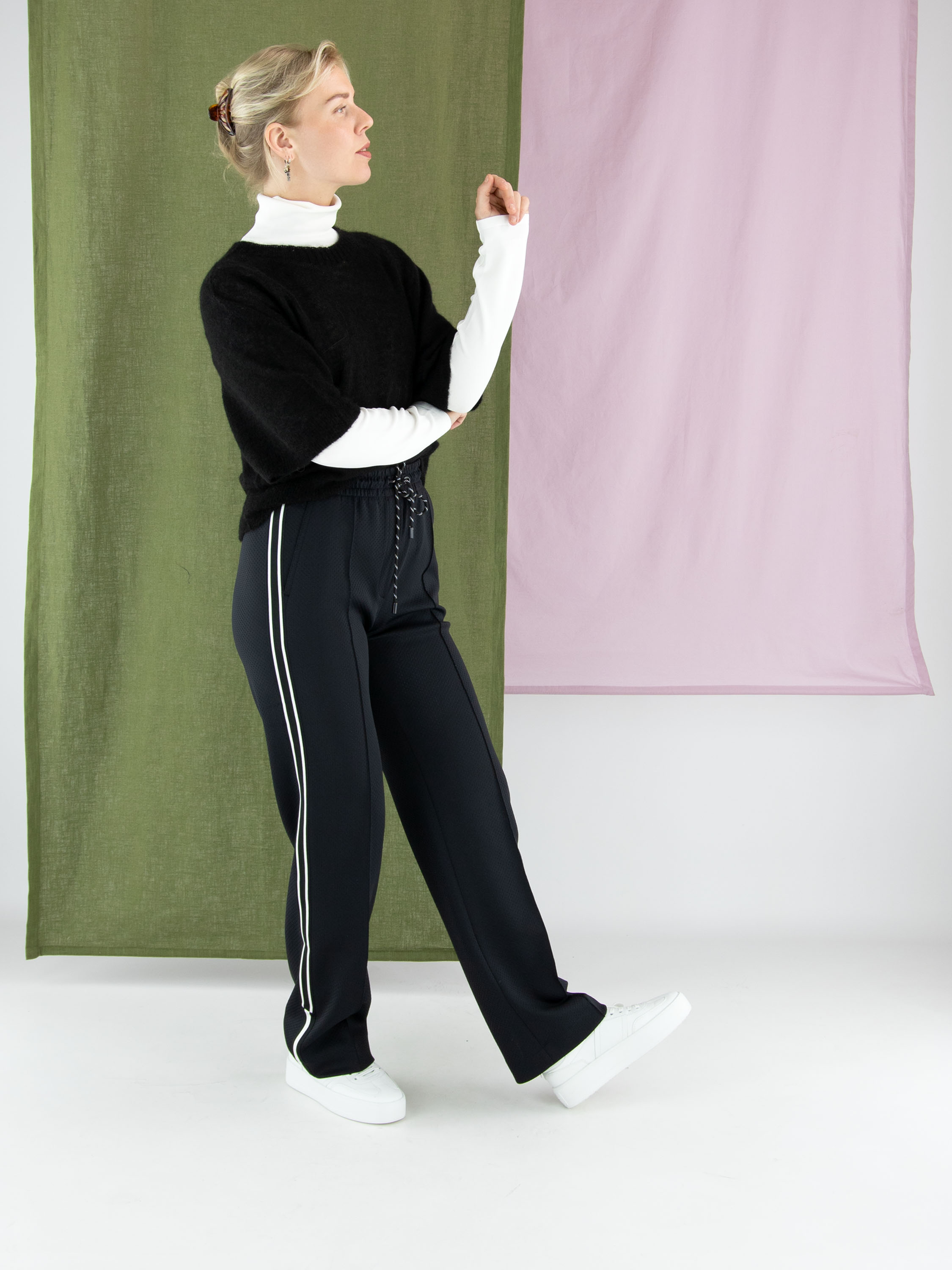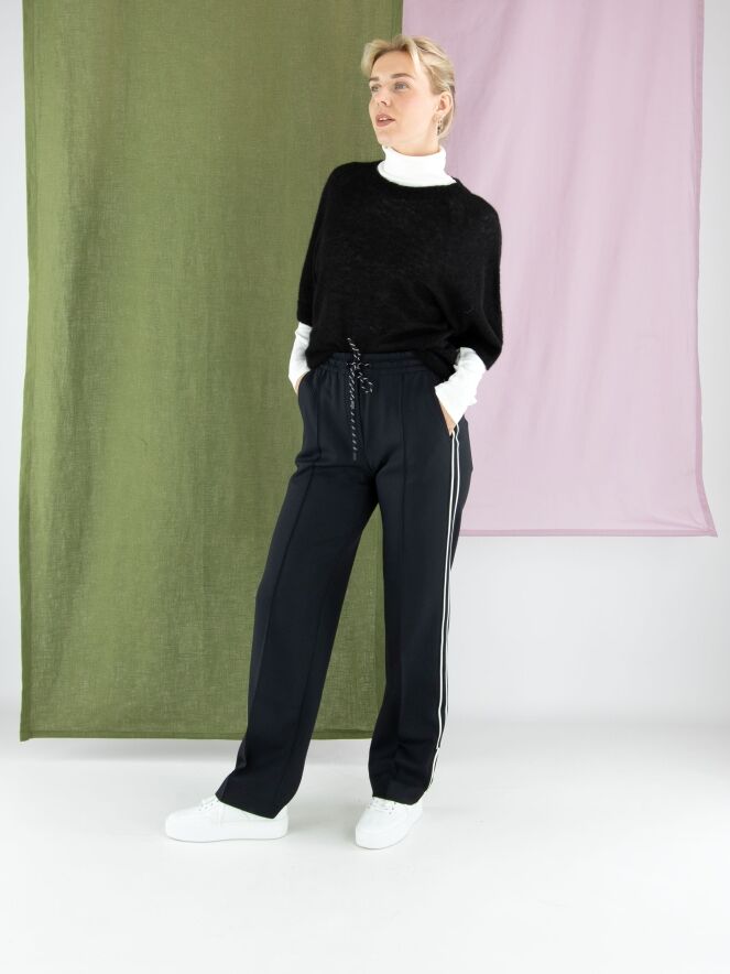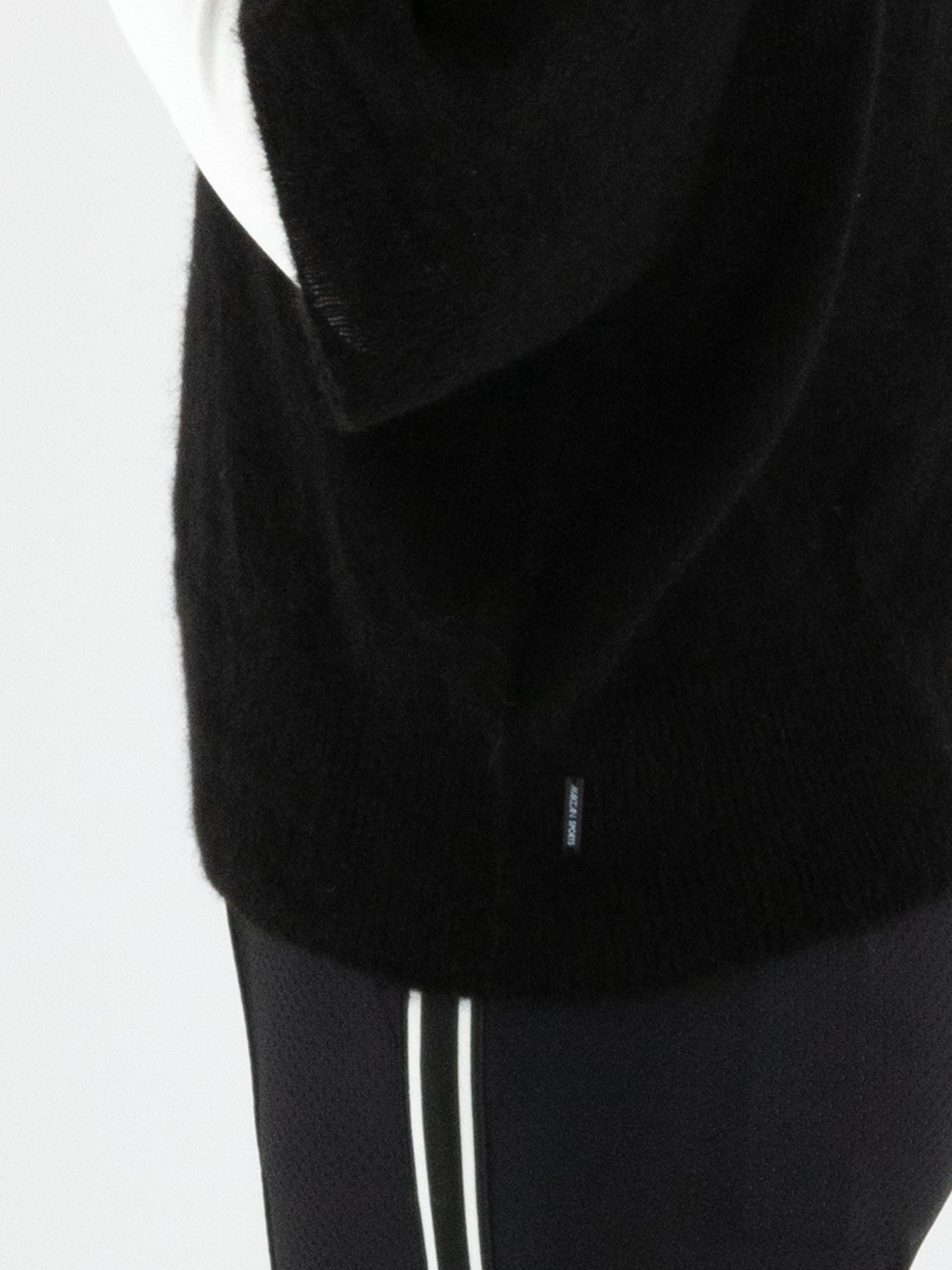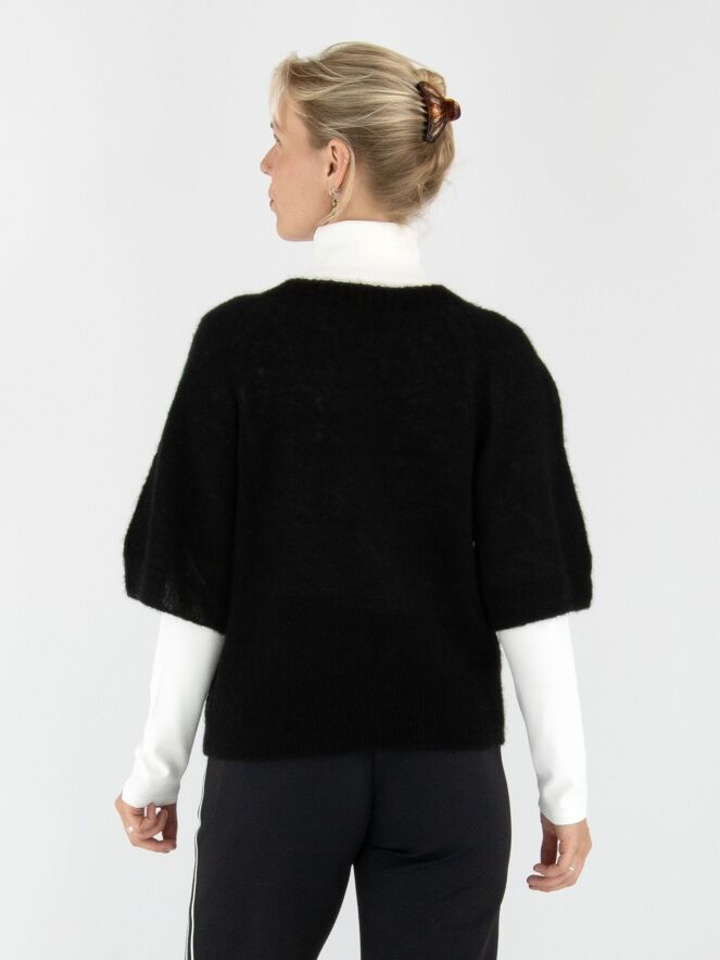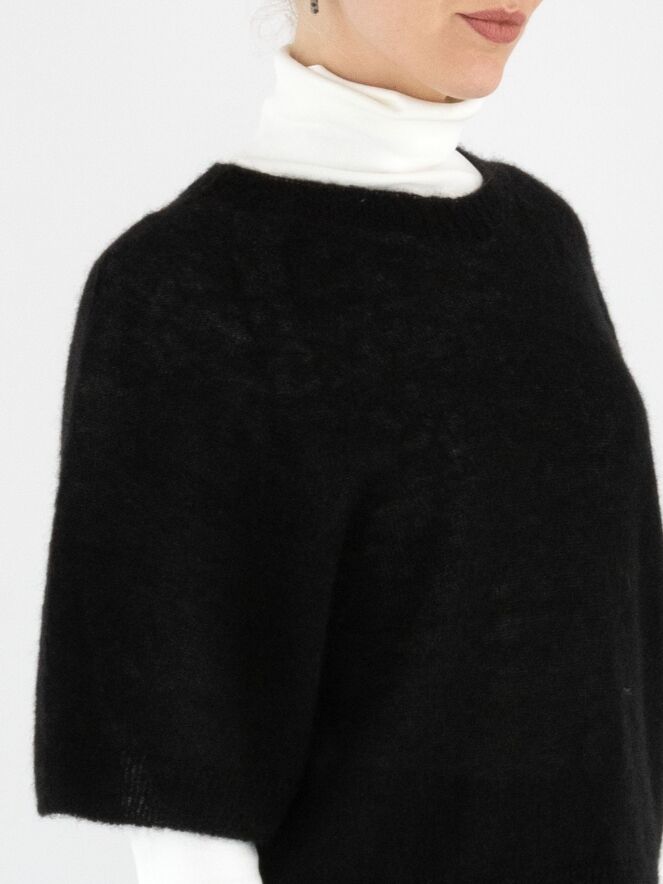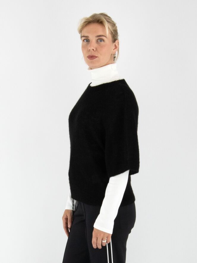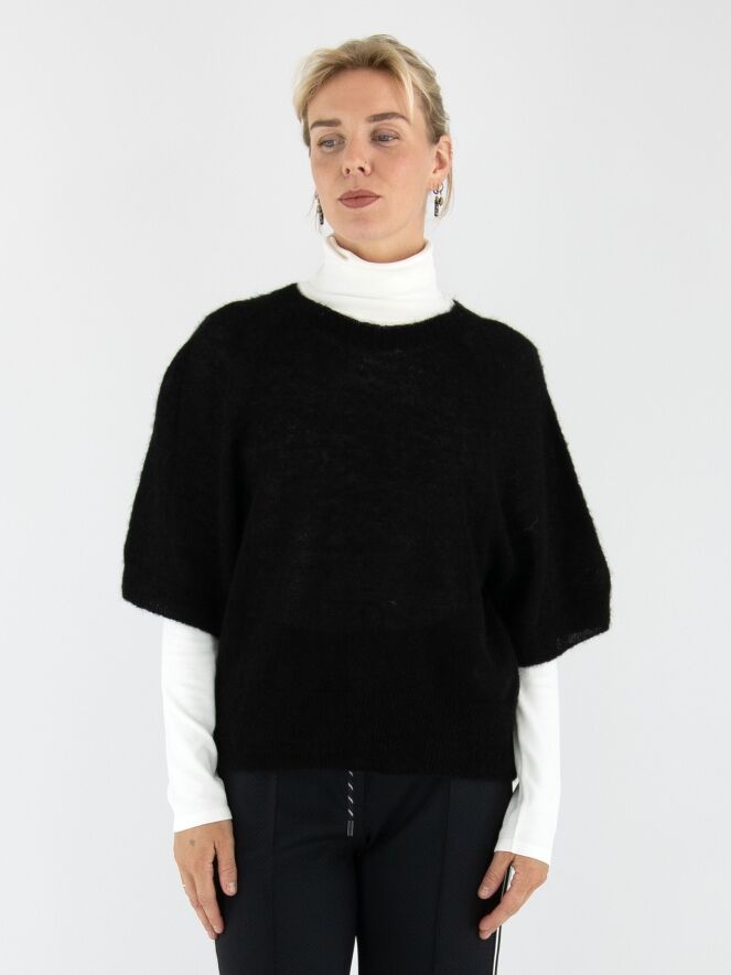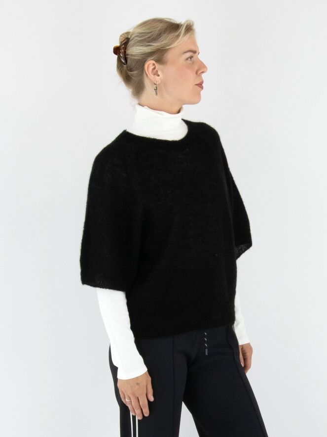 Ein luxuriöser Pullover von Marc Cain in Schwarz. Er hat einen runden Ausschnitt und kurze Ärmel. Dieser Pullover sollte von Hand gewaschen werden.
