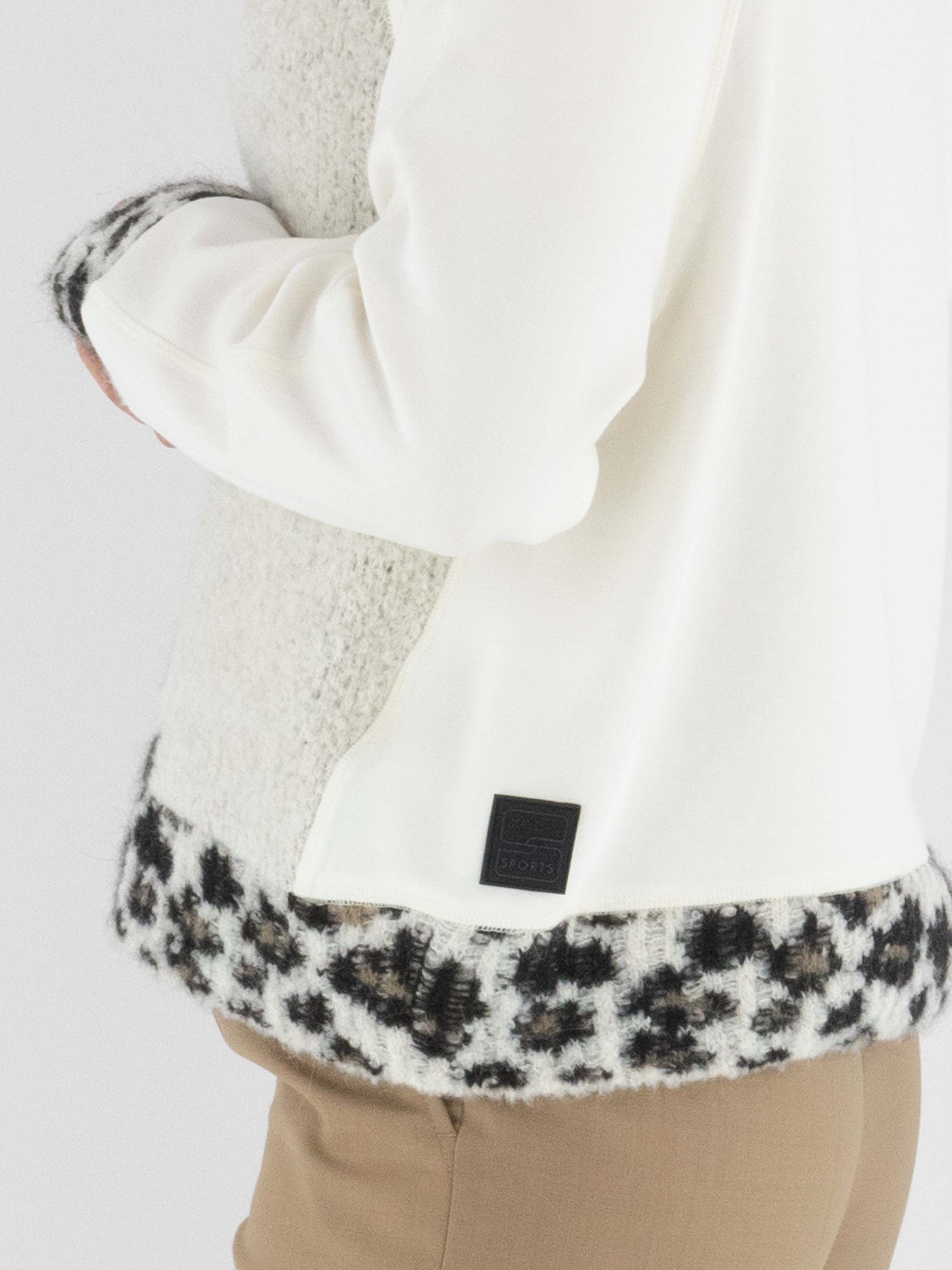 Ein Pullover von Marc Cain mit einem vergrößerten Argyle-Muster auf der Vorderseite in Türkis, Cremeweiß, Orange und Schwarz. Die Rückseite und die Ärmel sind aus einer weichen, unifarbenen Scuba-Qualität gearbeitet. Breite Biesen im Leo-Print an den Ärmelabschlüssen und am Saum setzen einen markanten Kontrast. Dieser Pullover kann per Hand gewaschen werden.