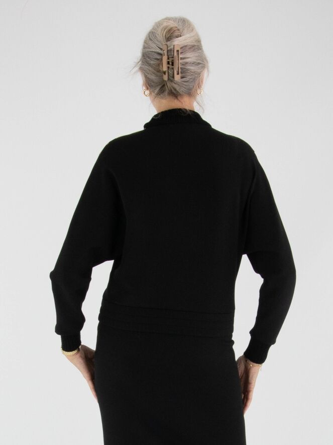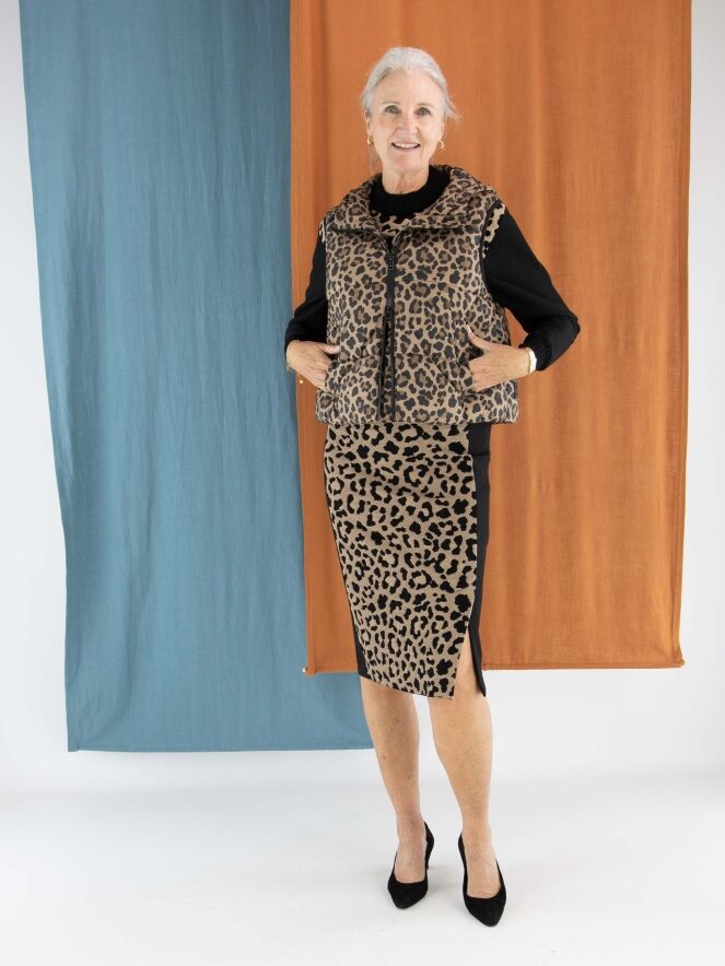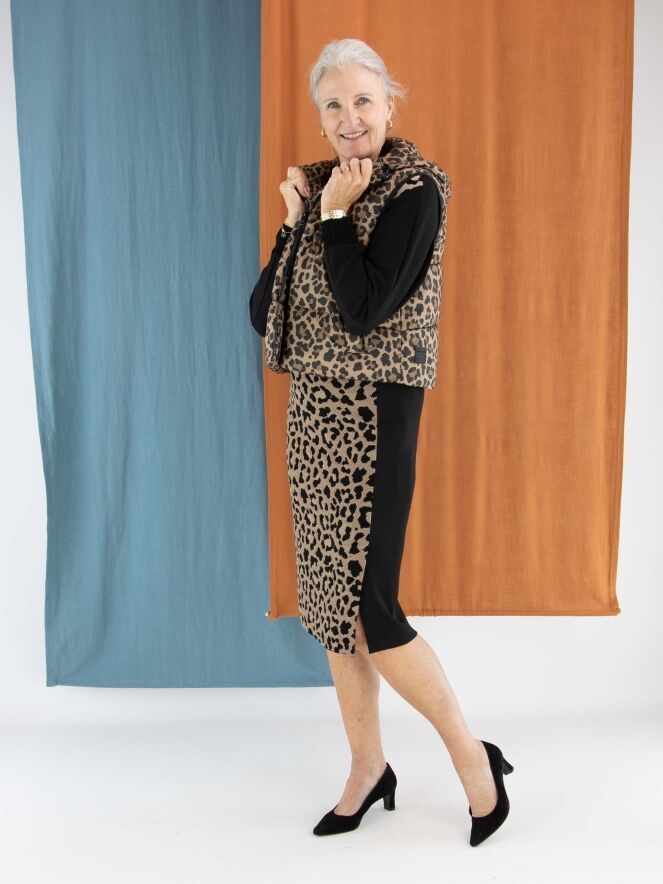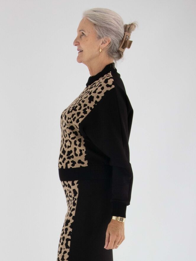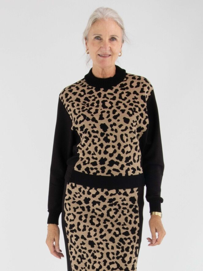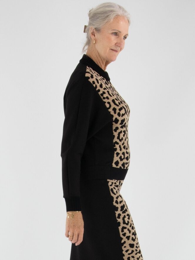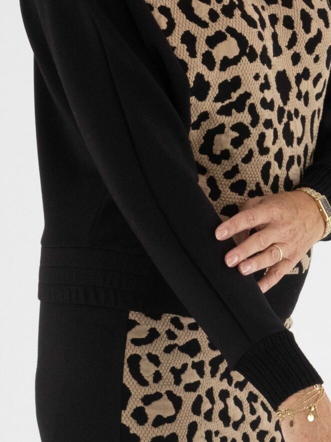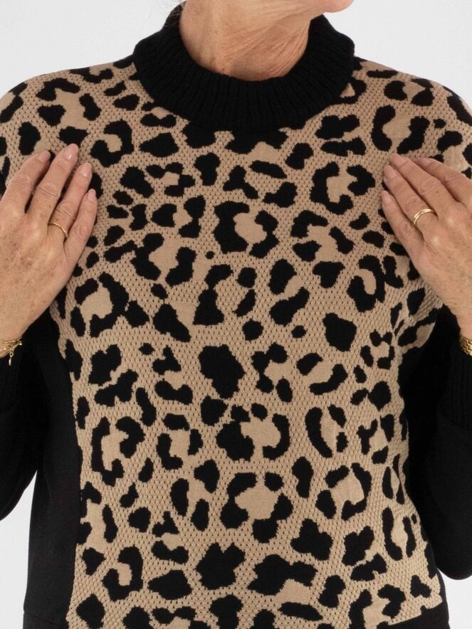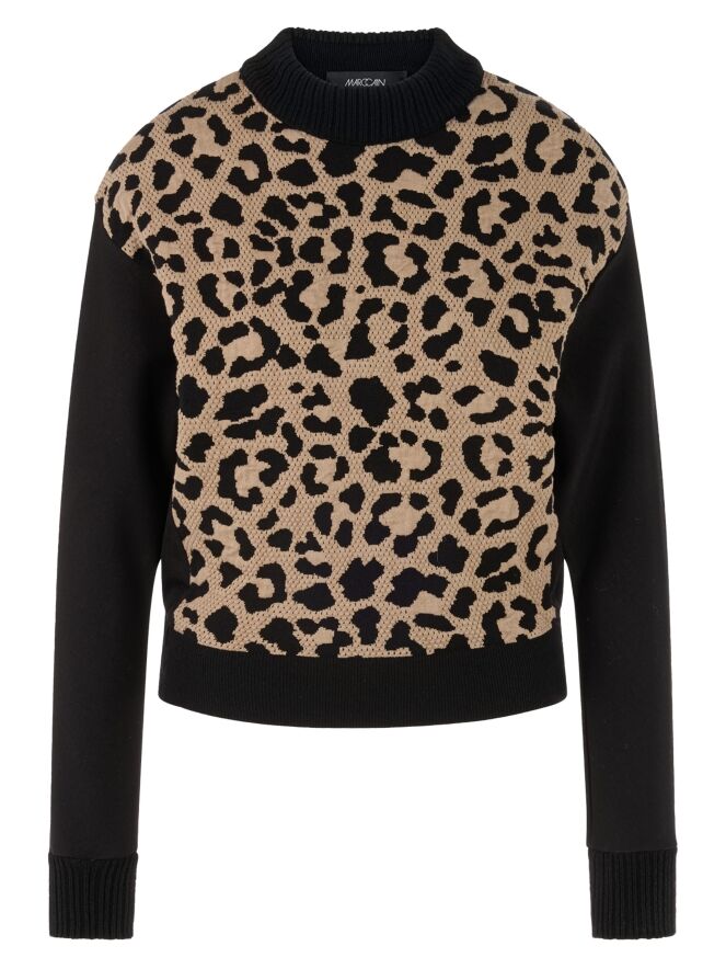 Ein Pullover von Marc Cain mit einem Leopardenmuster in Camel und Schwarz auf fein perforiertem Stoff auf der Vorderseite und einer unifarbenen Scuba-Qualität auf der Rückseite. Der Rundhalsausschnitt und die Ärmelabschlüsse sind mit gerippten Strickbündchen versehen. Am Saum befindet sich hinten ein plissiertes Gummiband und vorne ein feines Strickbündchen. Dieser Pullover kann bei 30 Grad gewaschen werden.