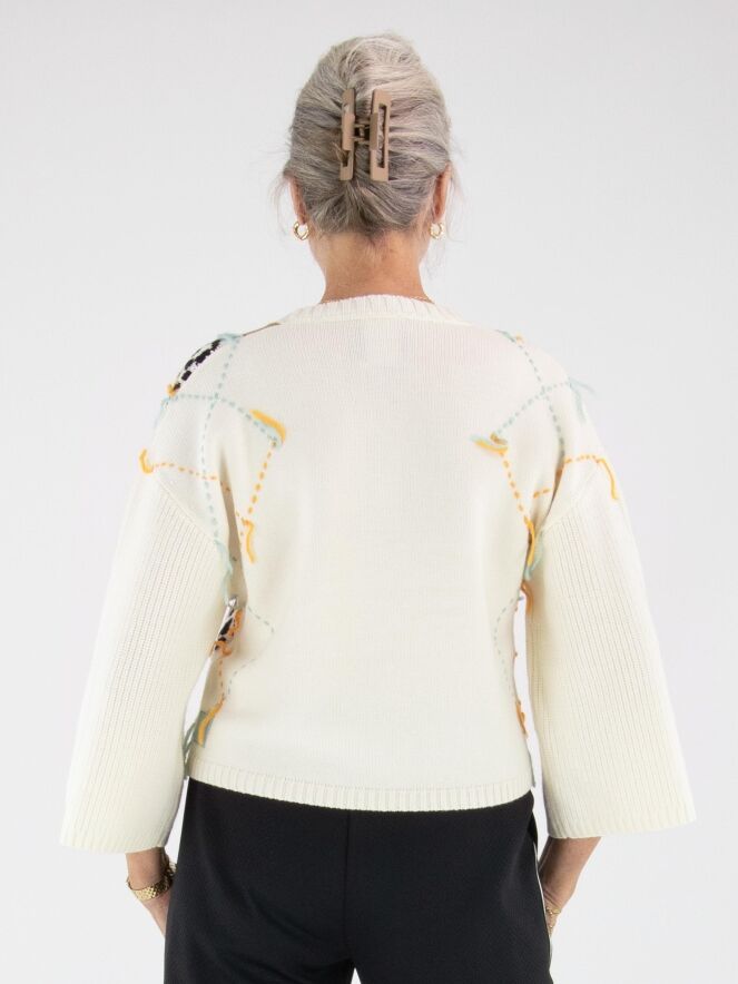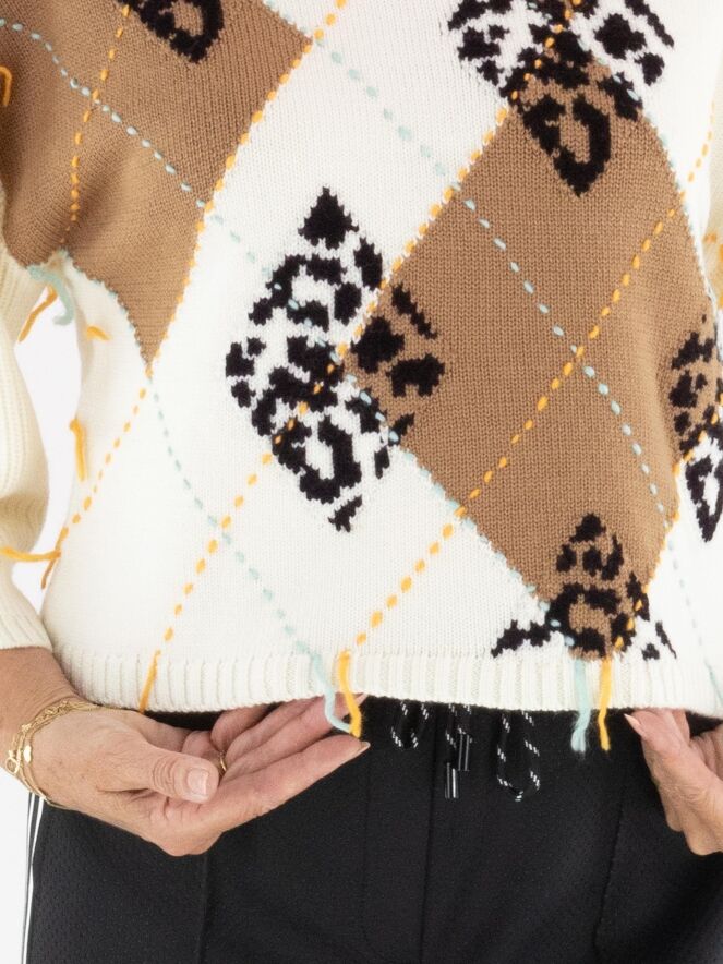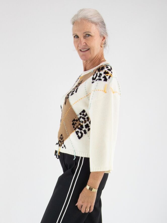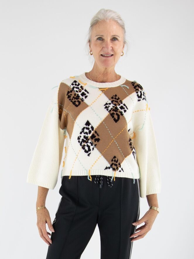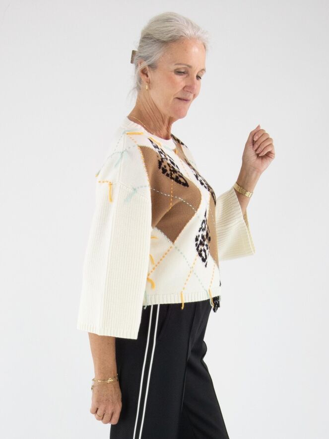 Dieser Pullover von Marc Cain ist auf der Vorderseite mit einem klassischen Argyle-Muster in den Farben Camel, Schwarz, Türkis und Orange auf cremeweißem Hintergrund gestaltet. Die Rückseite ist in einem einfarbigen Cremeweiß gehalten. Die halblangen Ärmel sind weit geschnitten und verleihen dem Modell eine moderne Note. Dieser Pullover kann von Hand gewaschen werden.