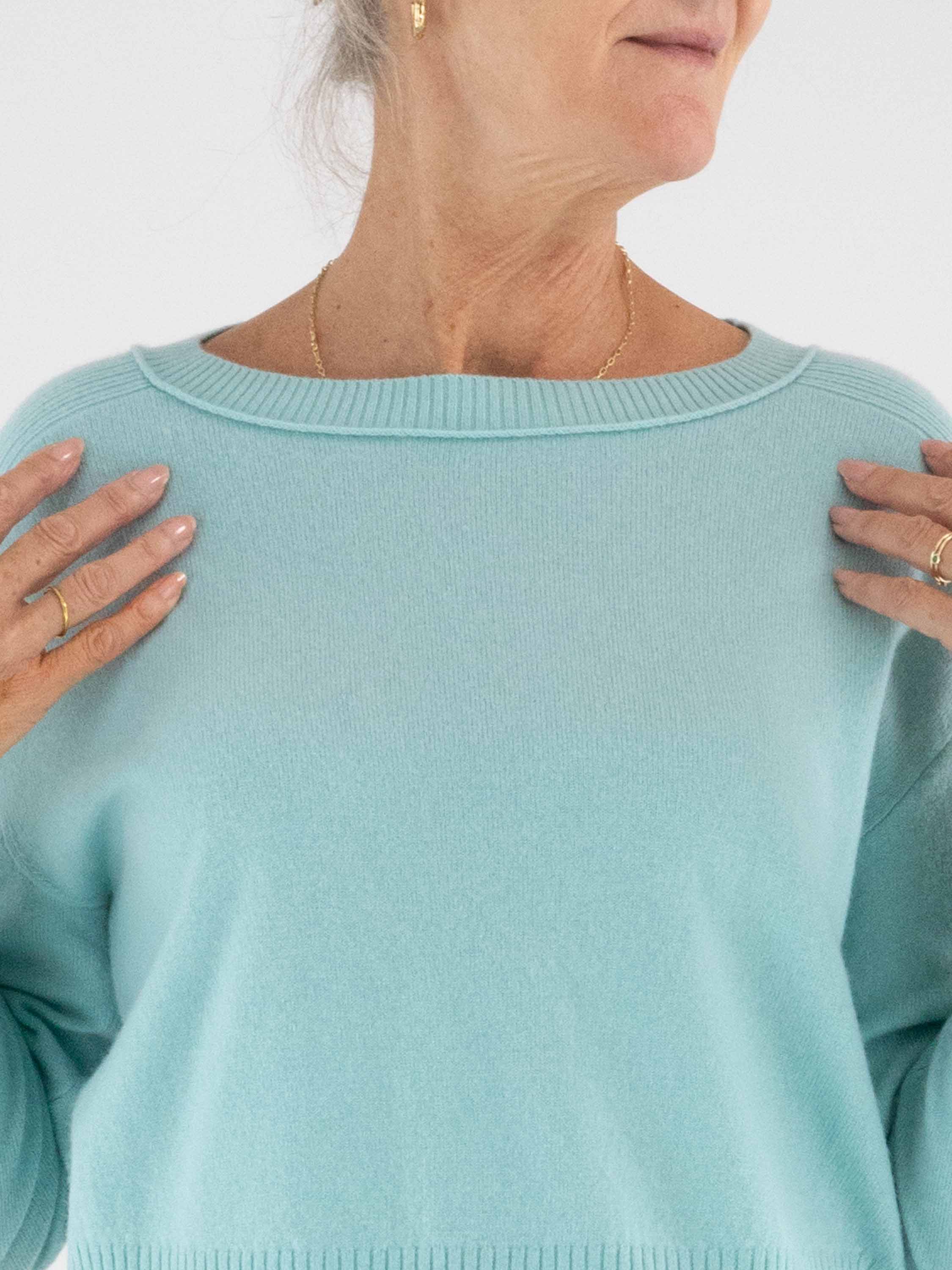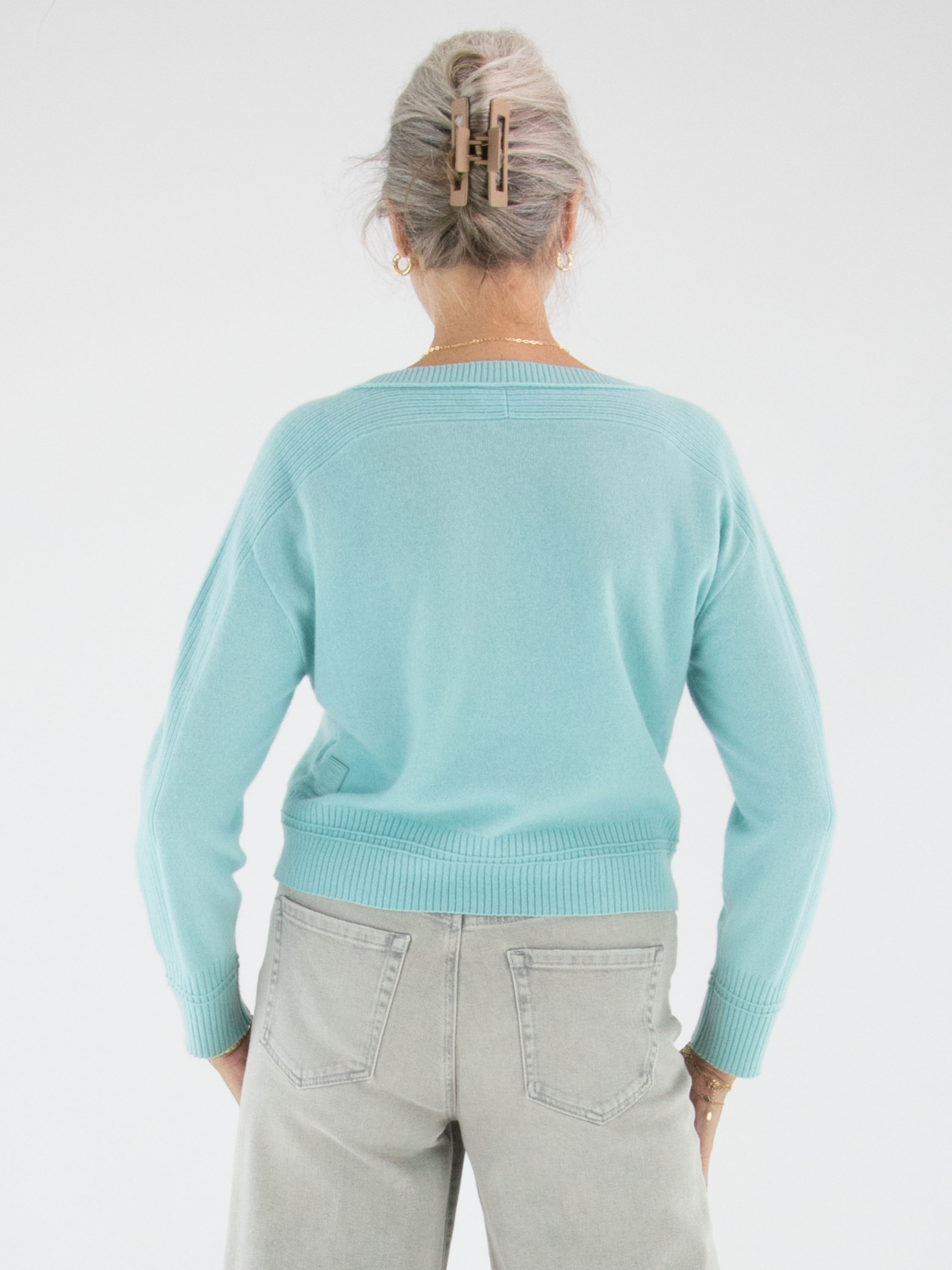 Ein Pullover von Marc Cain in einem frischen Türkiston. Der Rundhalsausschnitt, die obere Partie und die Abschlüsse der Ärmel sowie der Saum sind in fein gerippter Qualität gearbeitet und verleihen dem Modell eine dezente Struktur. Dieser Pullover kann per Hand gewaschen werden.