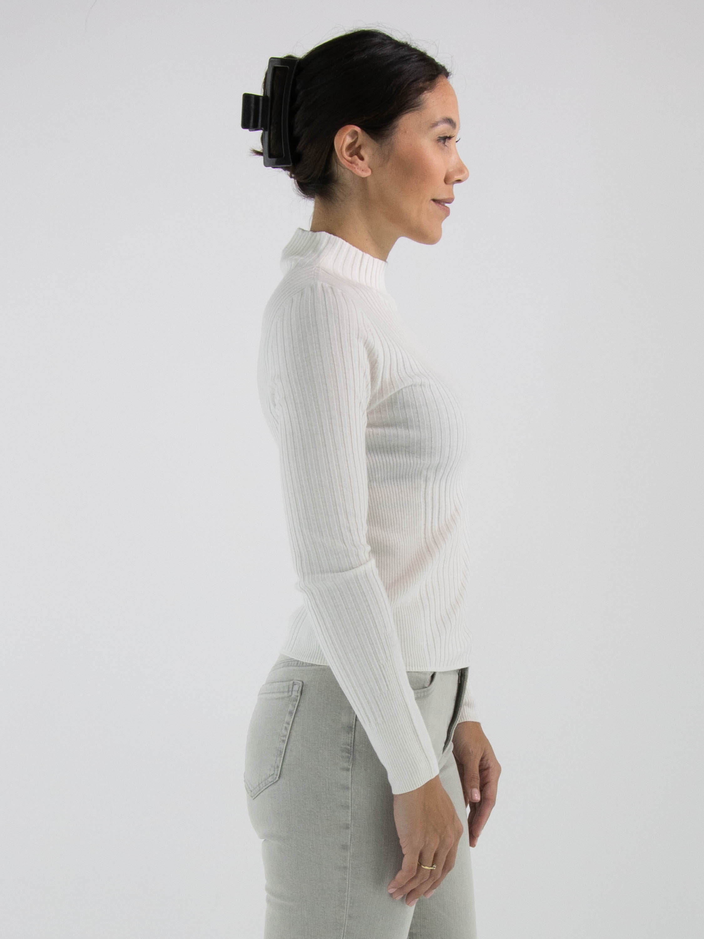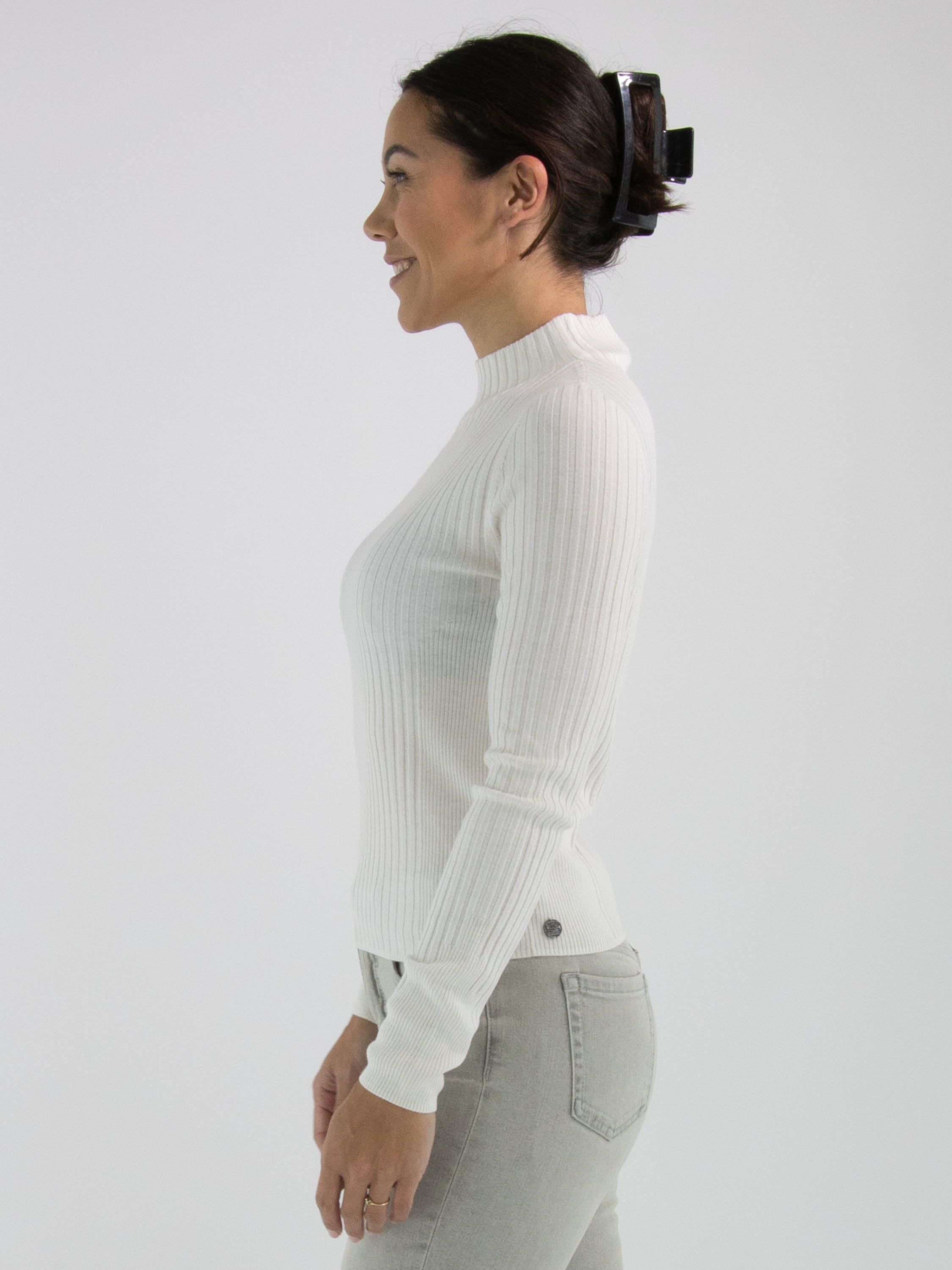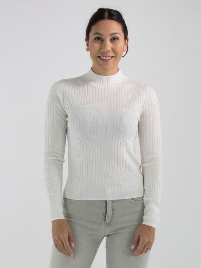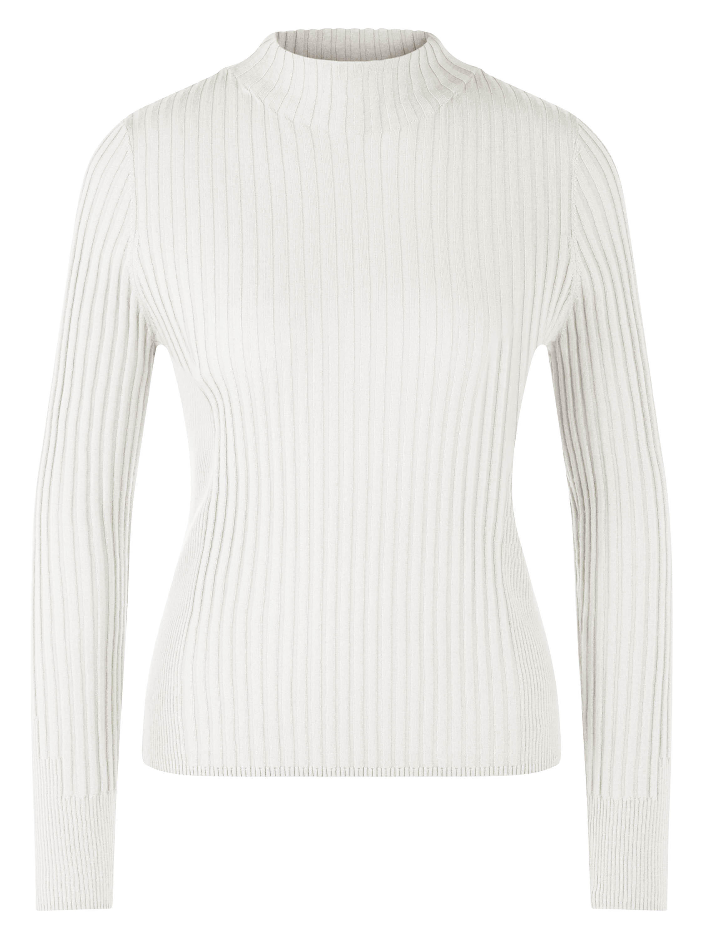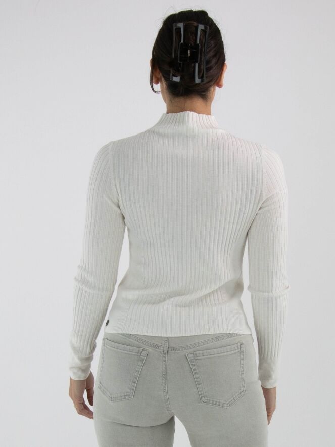 Ein stilvoller Pullover von Marc Cain in einem weichen Cremeweiß. Der Pullover hat einen hohen Turtle-Kragen und lange Ärmel. An den Seiten ist der Stoff mit einer feinen Rippenstruktur gearbeitet, was dem Modell eine elegante Note verleiht. Dieser Pullover kann per Hand gewaschen werden.