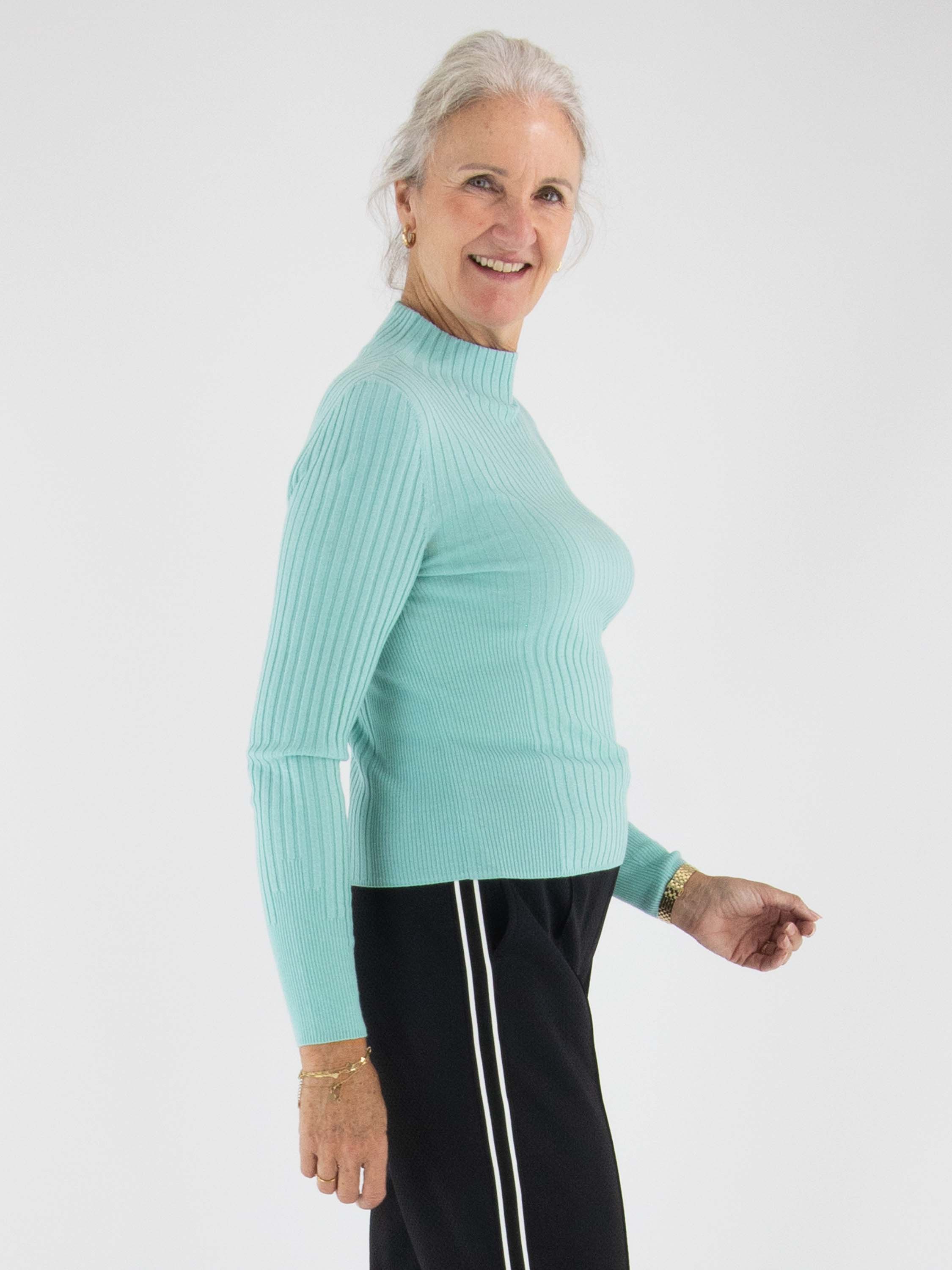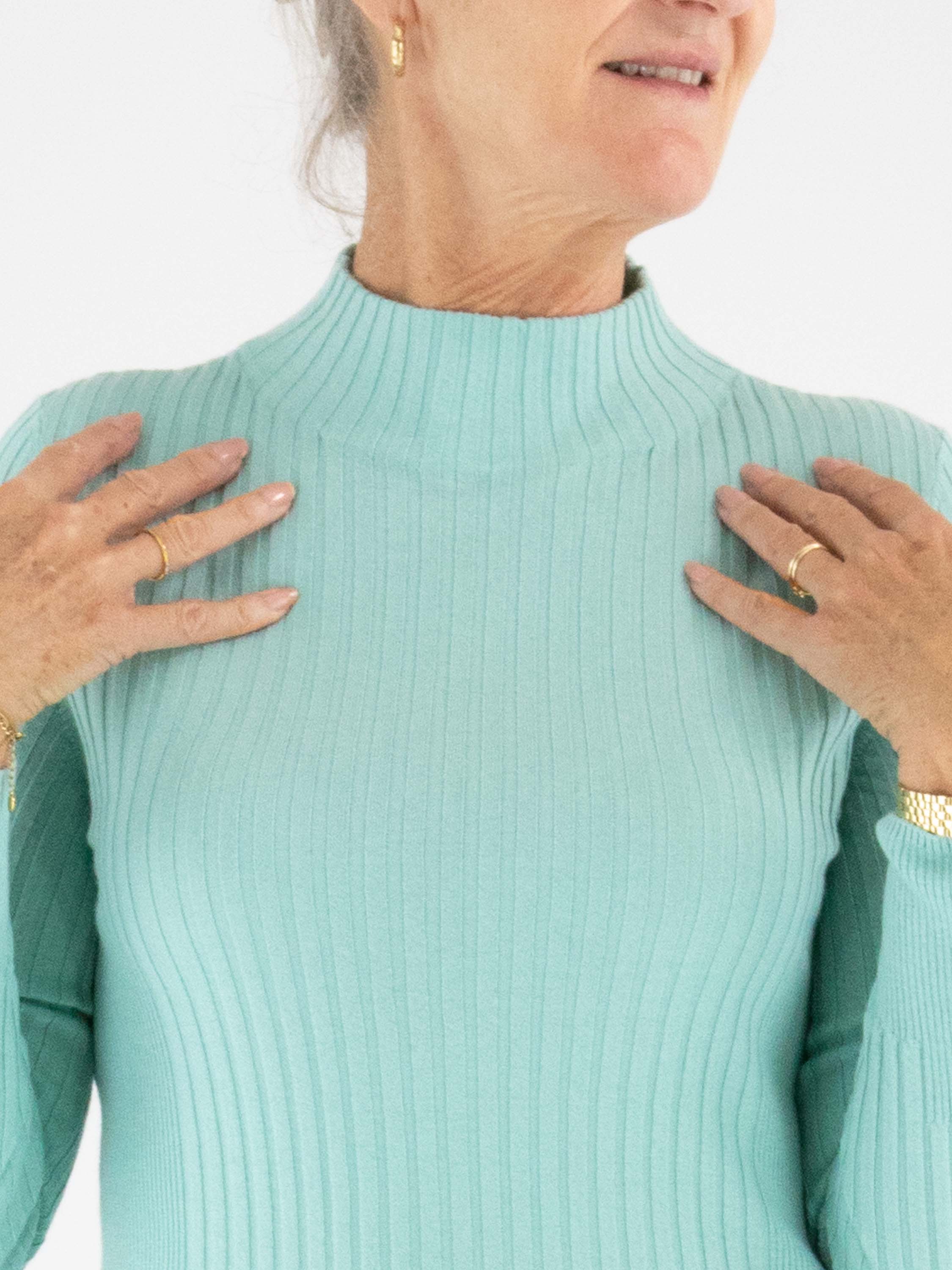 Ein moderner Ripp-Pullover von Marc Cain in einem lebendigen Türkiston. Der Pullover ist mit einem eleganten Turtle-Ausschnitt und langen Ärmeln gestaltet. Seitlich ist der Stoff fein gerippt, was für eine schlanke und feminine Silhouette sorgt. Dieser Pullover kann per Hand gewaschen werden.