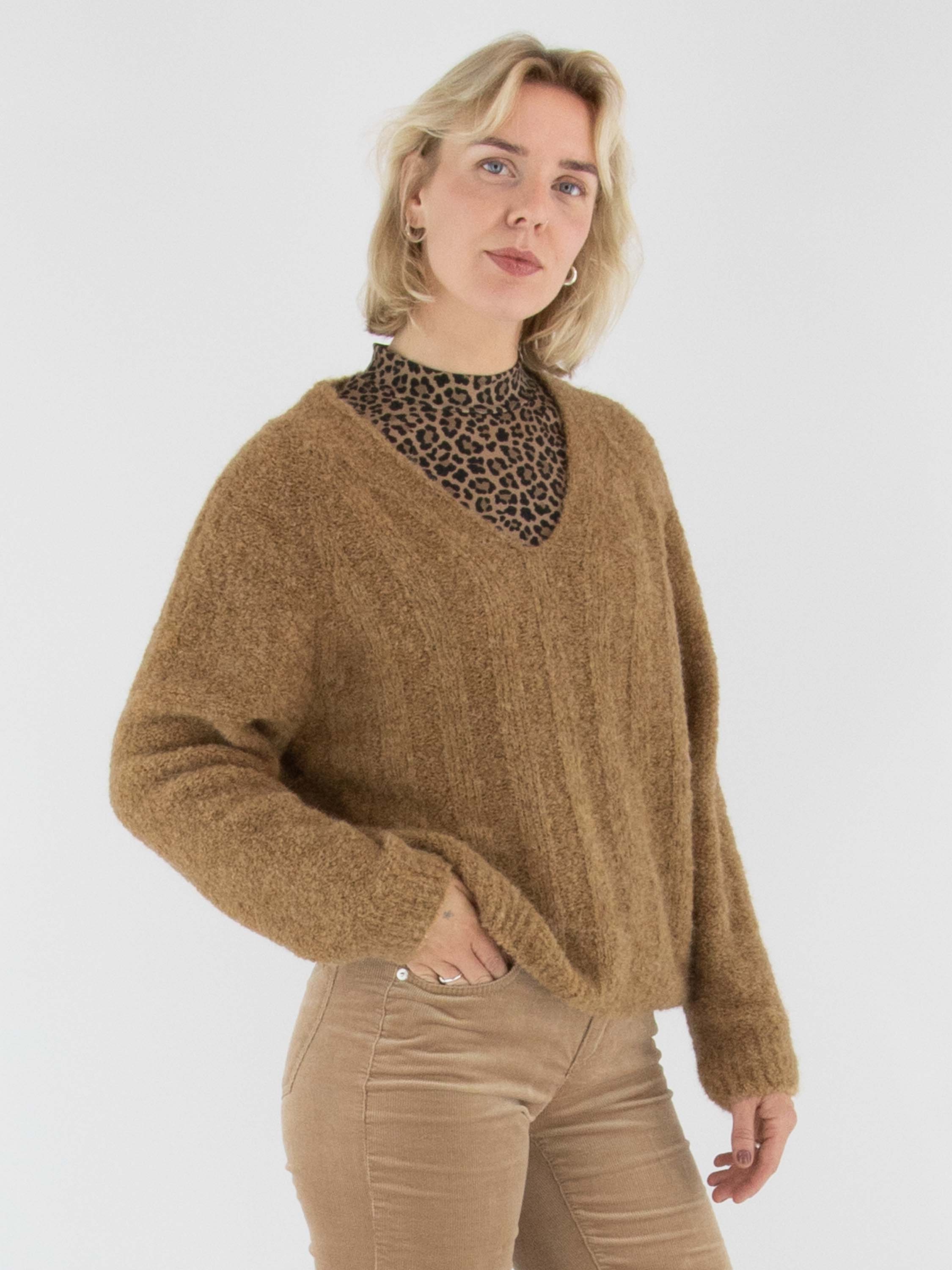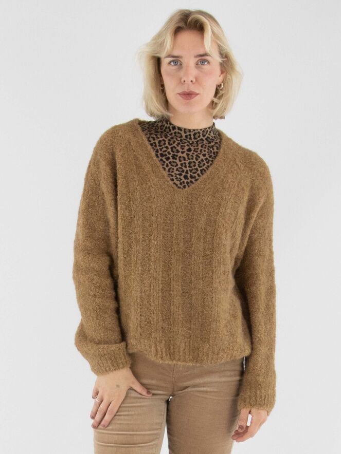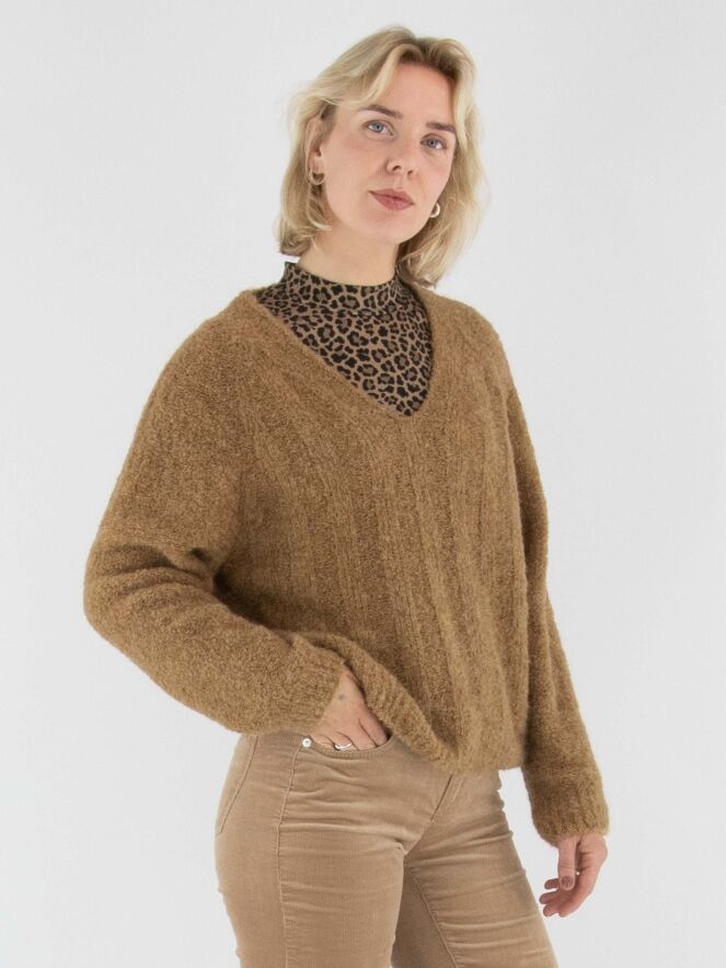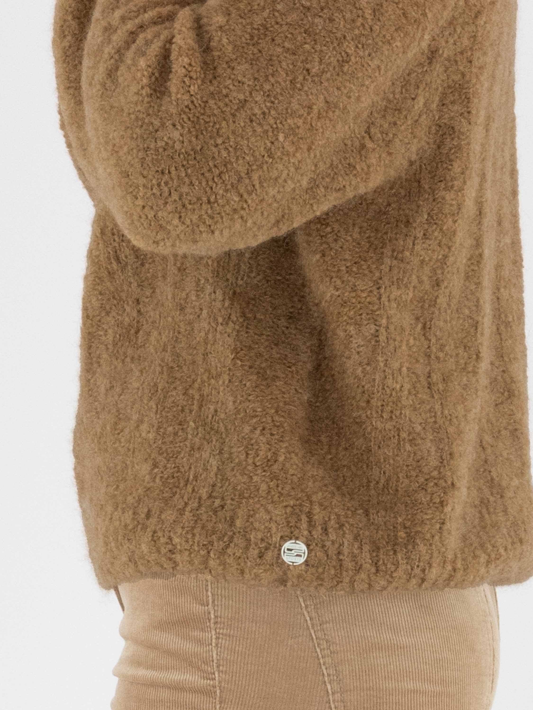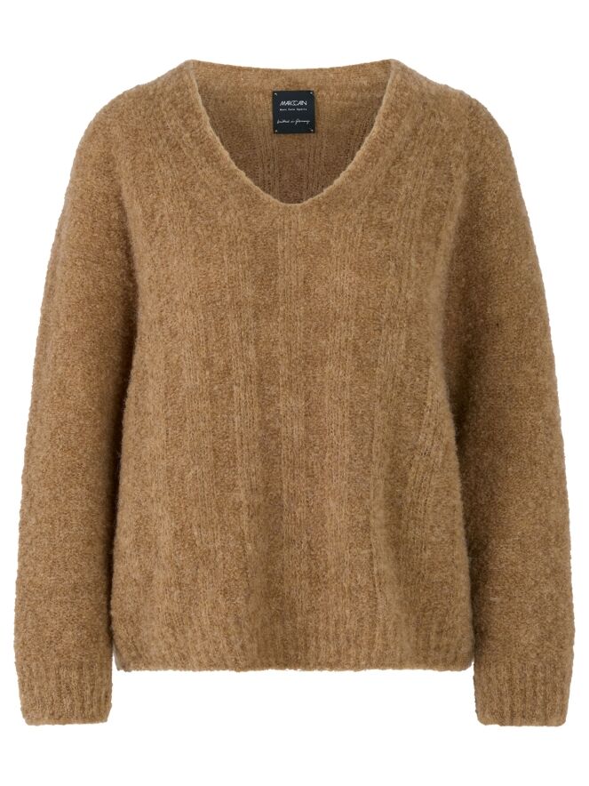 Ein eleganter Pullover von Marc Cain in einem warmen Camelton. Das Material ist mit einem feinen vertikalen Streifenmuster gearbeitet, das die Silhouette optisch streckt. Mit V-Ausschnitt und langen Ärmeln erhält das Modell eine zeitlose Note. Dieser Pullover sollte von Hand gewaschen werden.