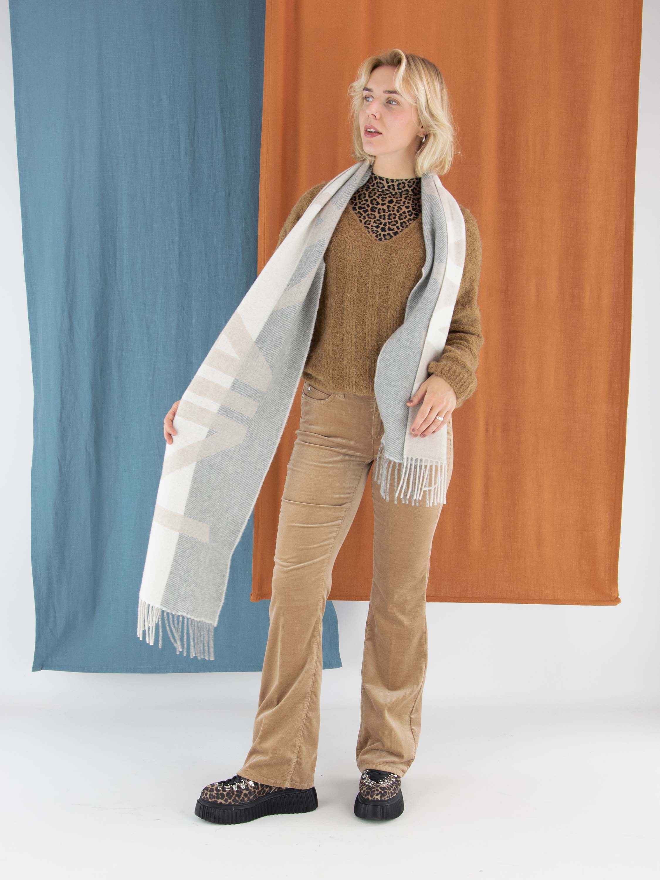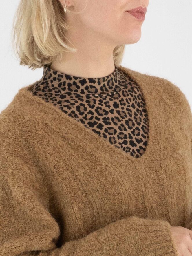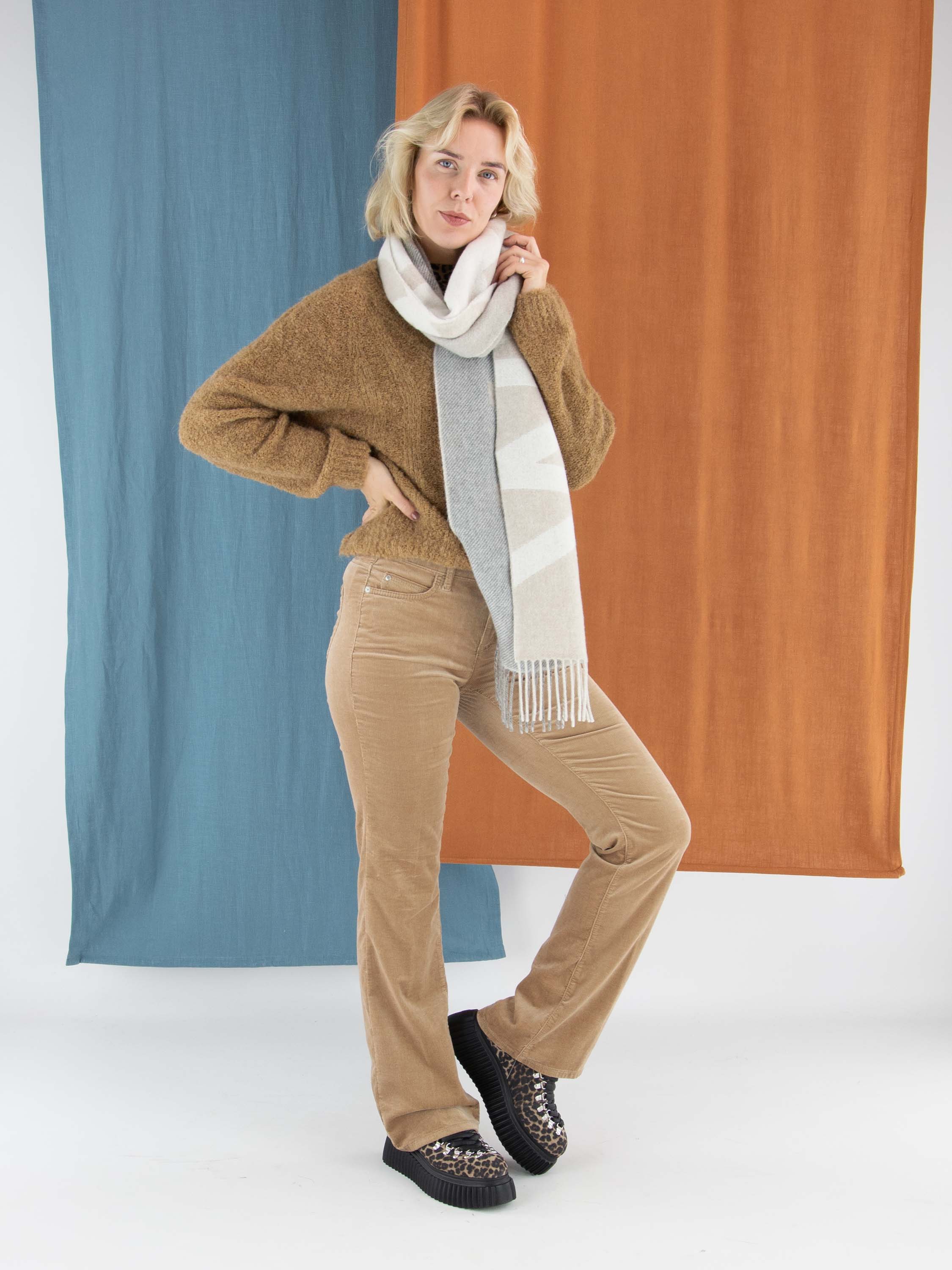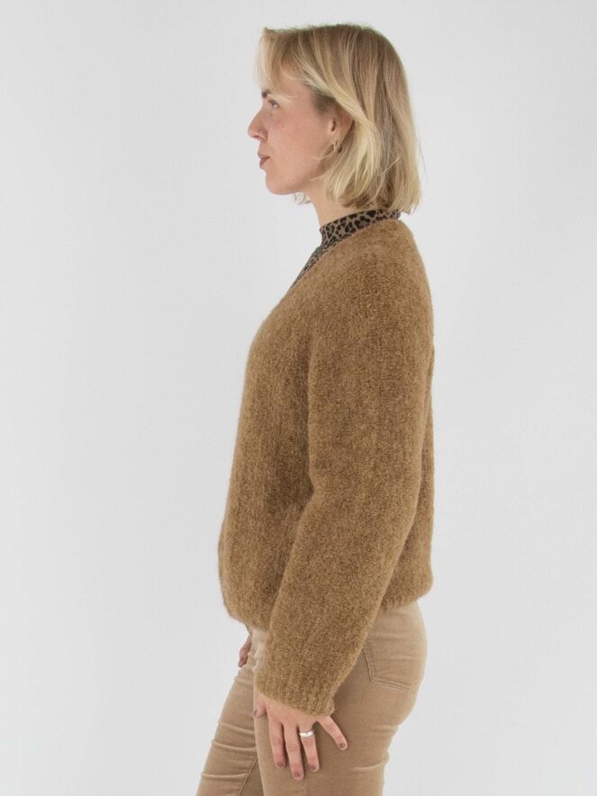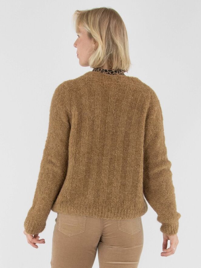 Ein eleganter Pullover von Marc Cain in einem warmen Camelton. Das Material ist mit einem feinen vertikalen Streifenmuster gearbeitet, das die Silhouette optisch streckt. Mit V-Ausschnitt und langen Ärmeln erhält das Modell eine zeitlose Note. Dieser Pullover sollte von Hand gewaschen werden.