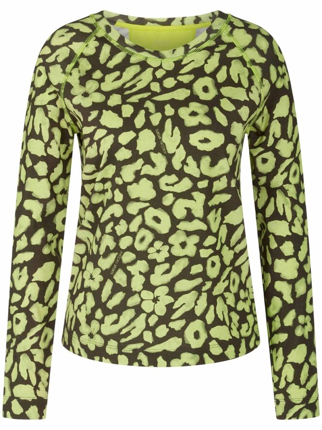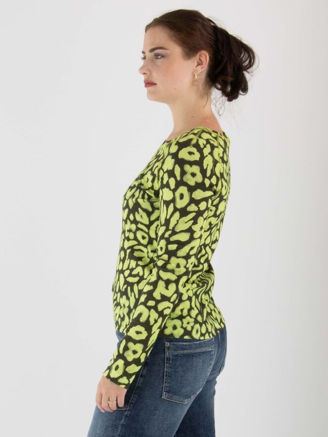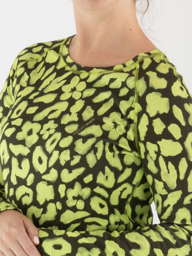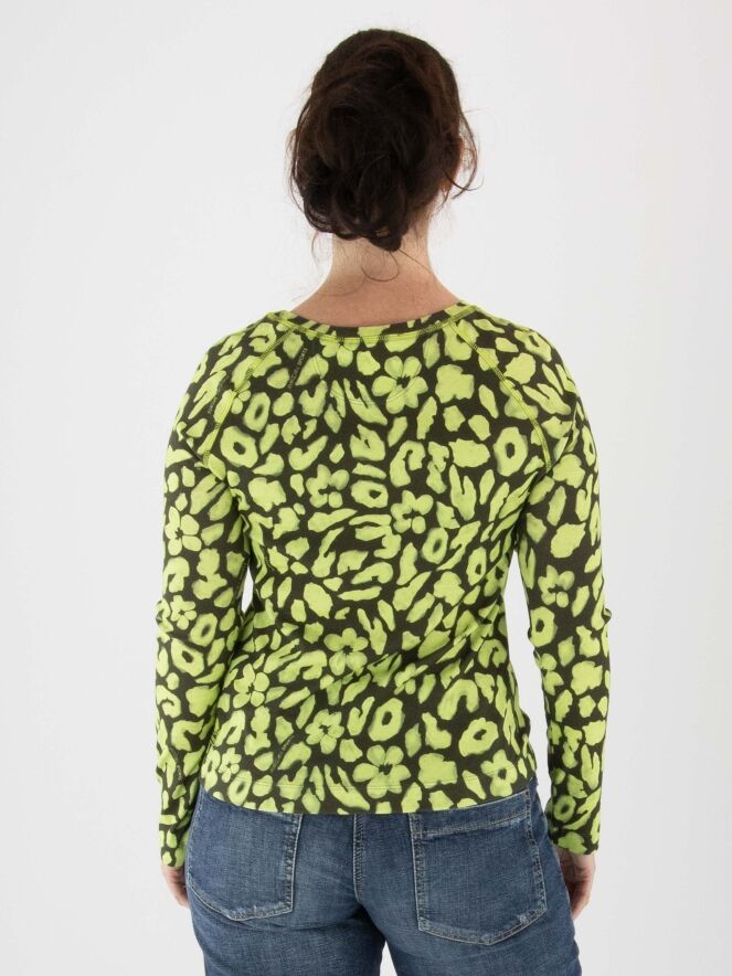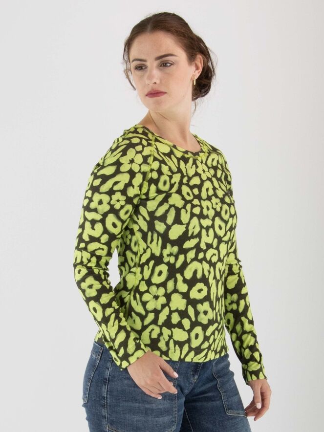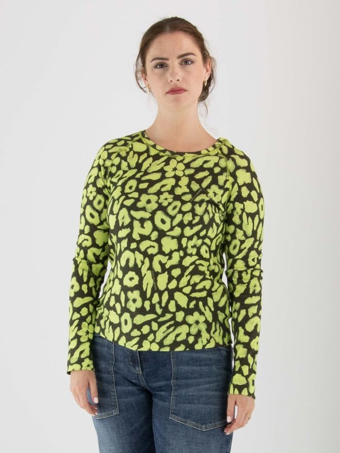 Shirt von Marc Cain mit Leopardenmuster in Limettengrün und Olivgrün. Das Shirt hat einen Rundhalsausschnitt und lange Ärmel. Dieses Shirt kann bei 30 Grad gewaschen werden.