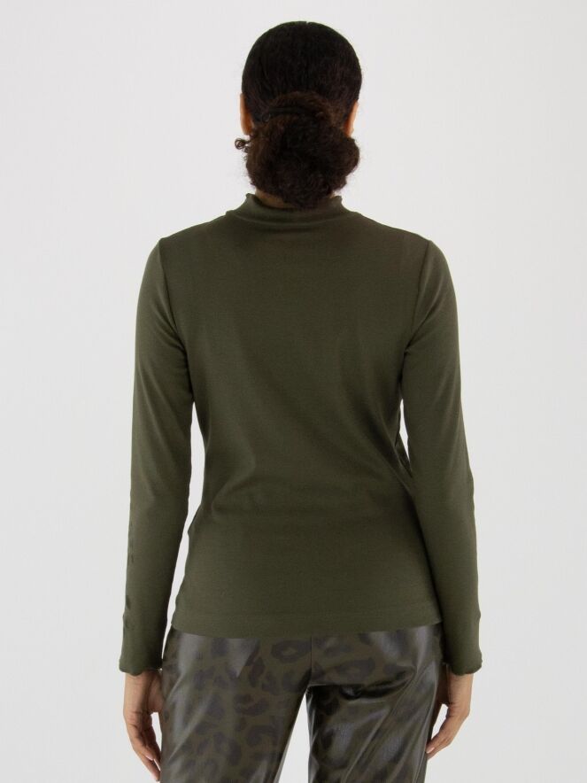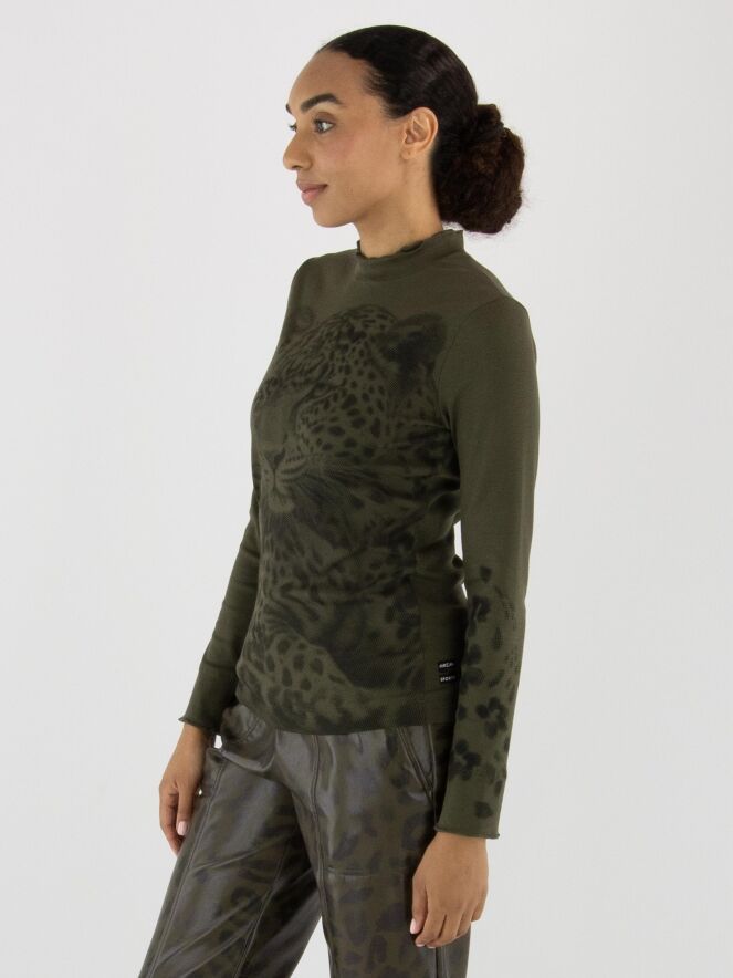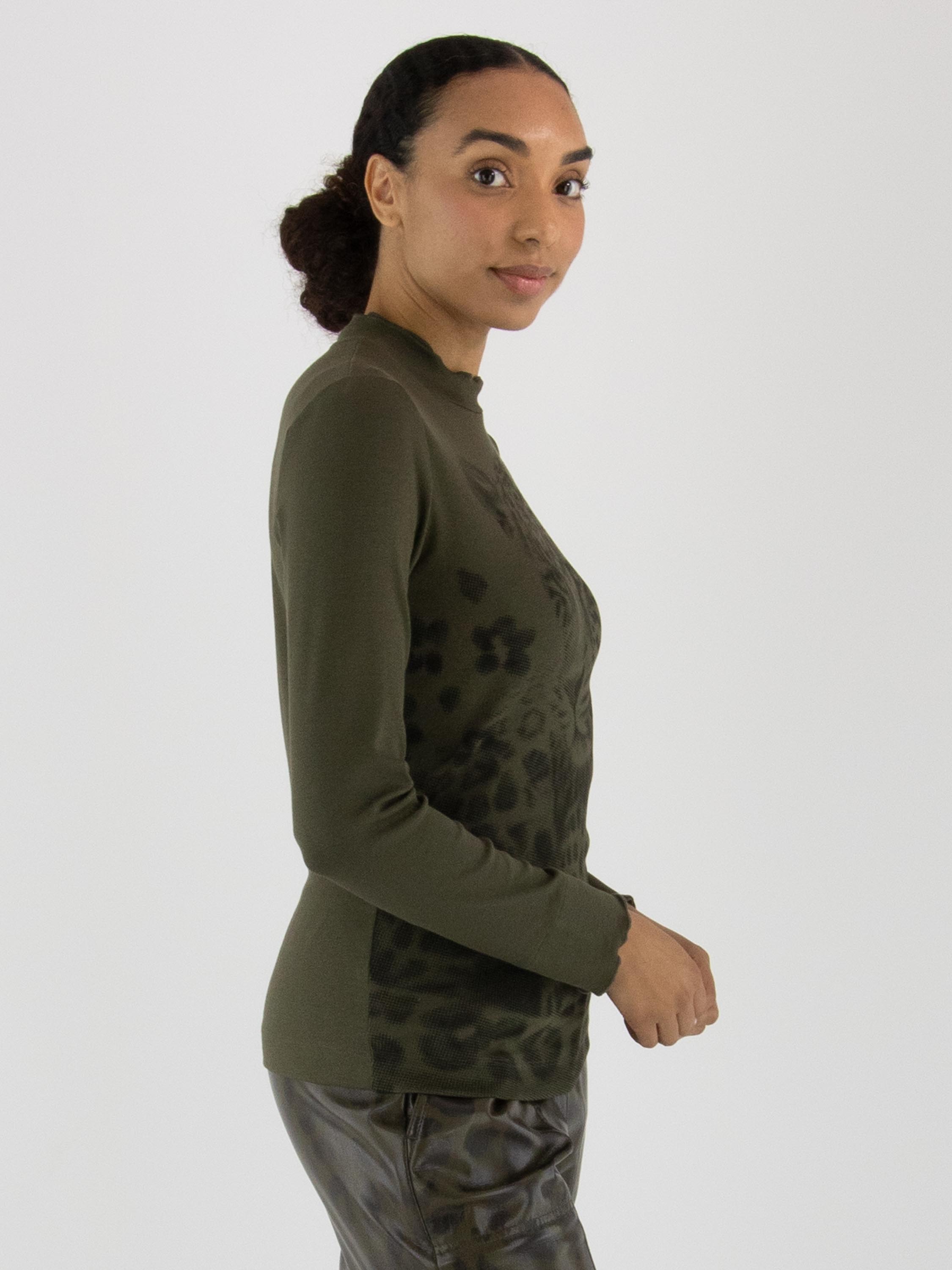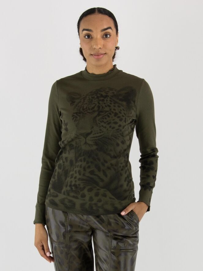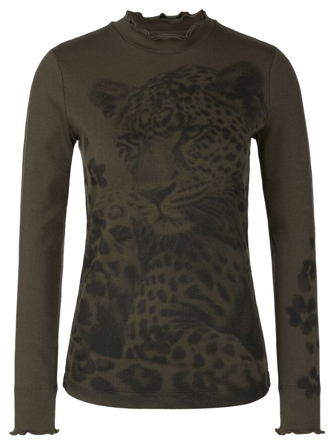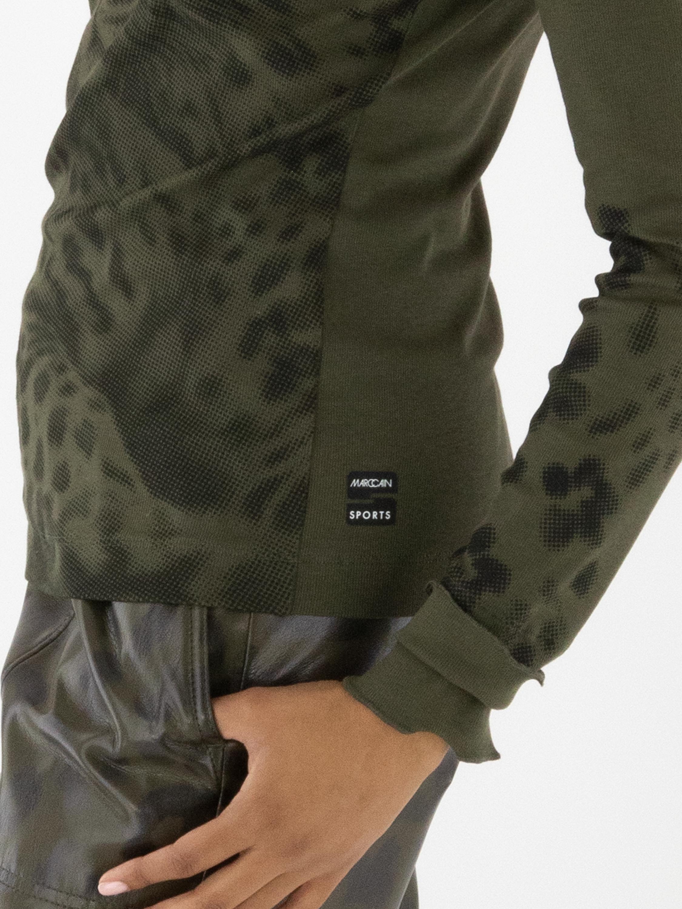 Shirt von Marc Cain mit einem grafischen Leopardenmuster in Olivgrün und Schwarz. Am Rundhalsausschnitt verläuft eine doppelte, gewellte und gerippte Blende. Die langen Ärmel enden in einem fein gerippten Bündchen mit gewelltem Abschluss. Dieses Shirt kann bei 30 Grad gewaschen werden.