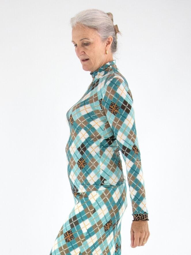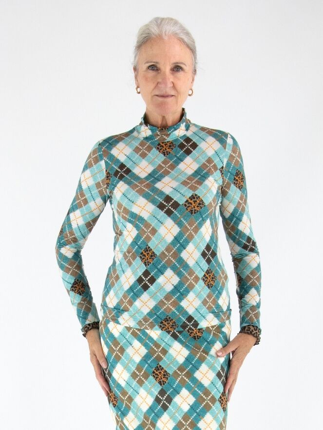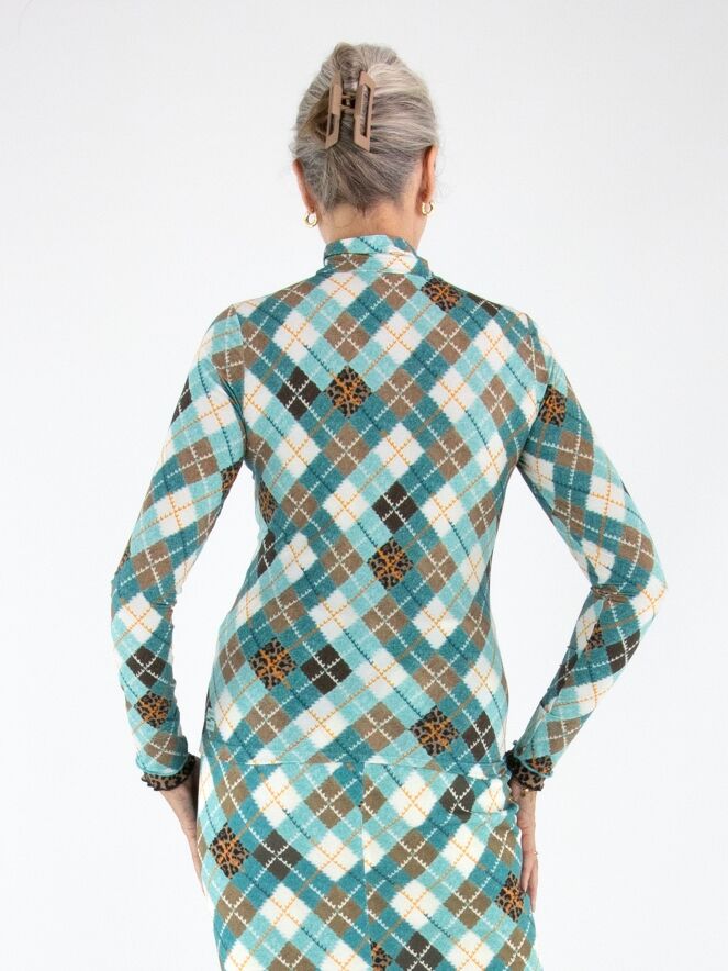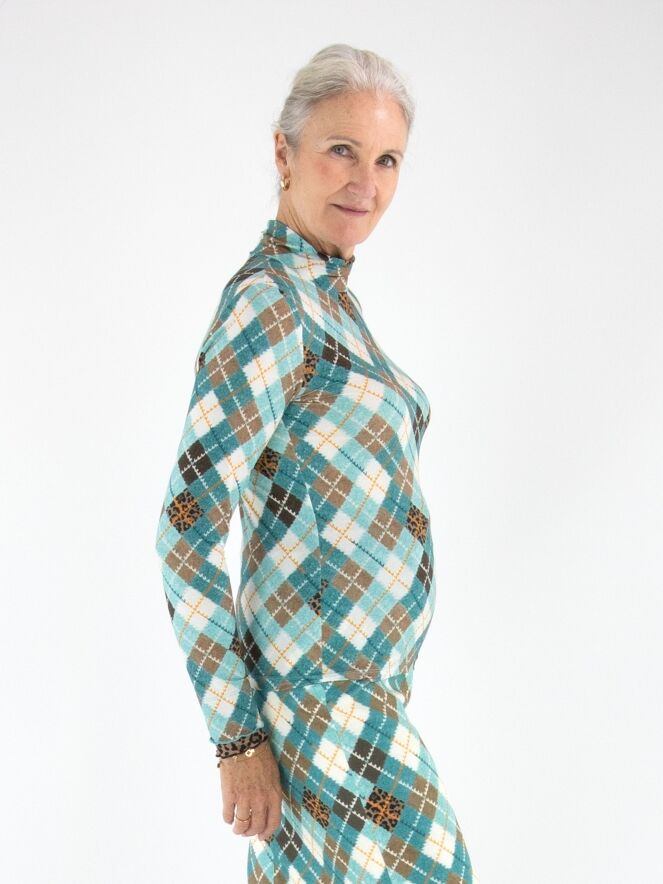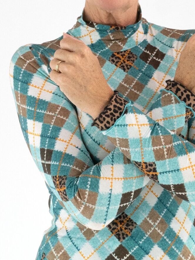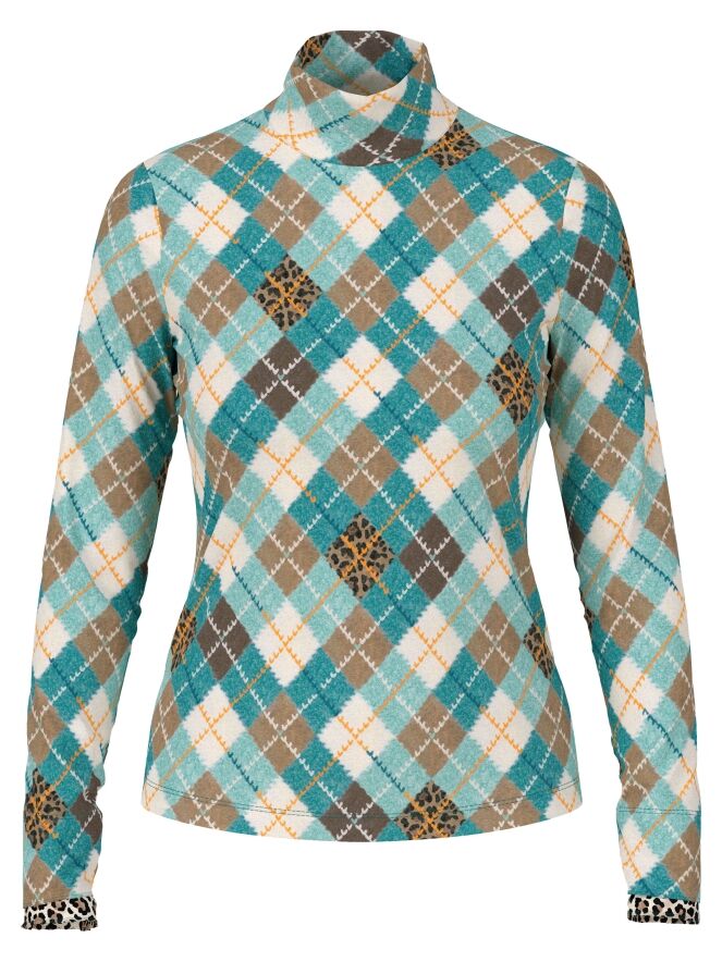 Ein stilvolles Shirt von Marc Cain aus komfortabler Scuba-Qualität. Das Modell zeigt ein markantes Argyle-Muster in Türkis-, Braun-, Orange- und Cremeweiß-Tönen. Es ist mit einem modernen Turtle-Ausschnitt und langen Ärmeln gestaltet. Am Ende der Ärmel sorgt ein fein gerippter Doppeljersey im Leo-Print mit Schwarz- und Brauntönen für einen verspielten Kontrast. Dieses Shirt kann bei 30 Grad gewaschen werden.
