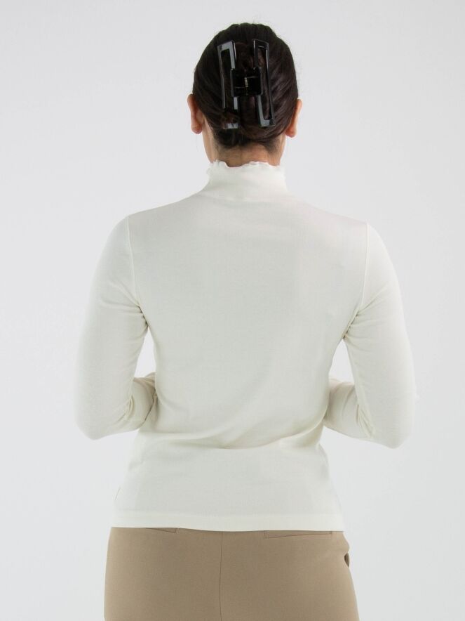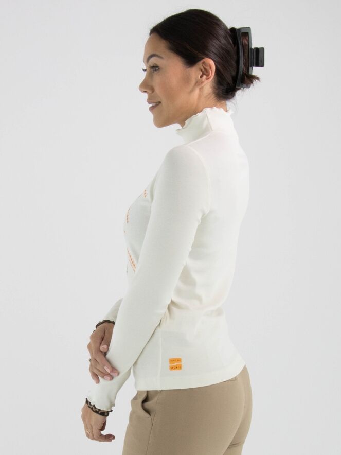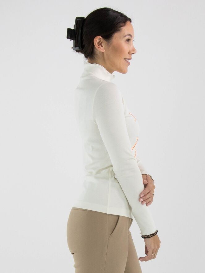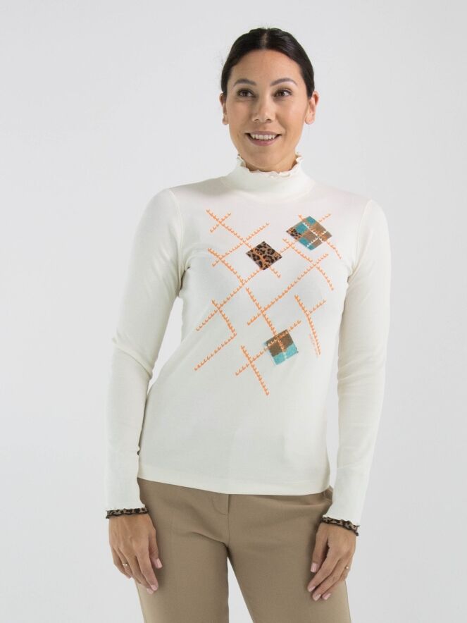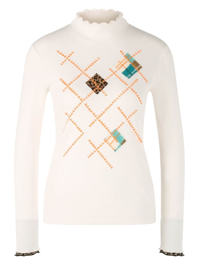 Ein fein gerippter Pullover von Marc Cain in Cremeweiß, mit einem eleganten Argyle-Muster auf der Vorderseite in Türkis-, Braun- und Orangetönen. Der Pullover hat einen dezent gerippten Turtle-Ausschnitt und lange Ärmel. Am Ende der Ärmel sorgt ein doppelter Tricot-Einsatz im fein gerippten Leo-Print in Schwarz- und Brauntönen für einen verspielten Kontrast. Dieser Pullover kann bei 30 Grad gewaschen werden.