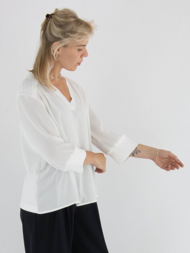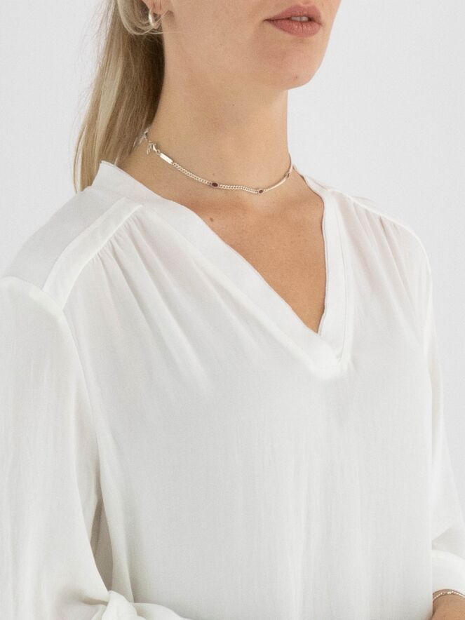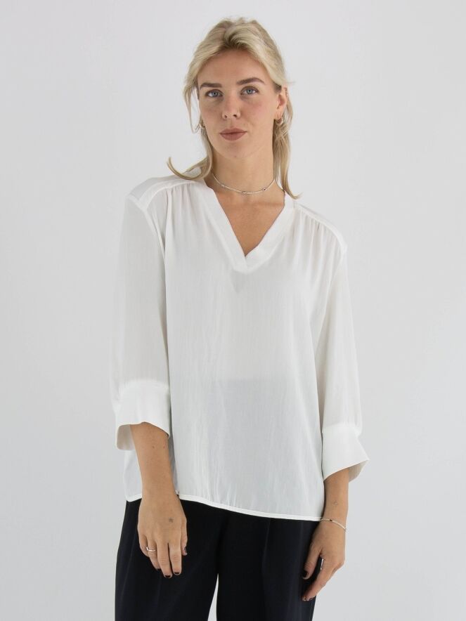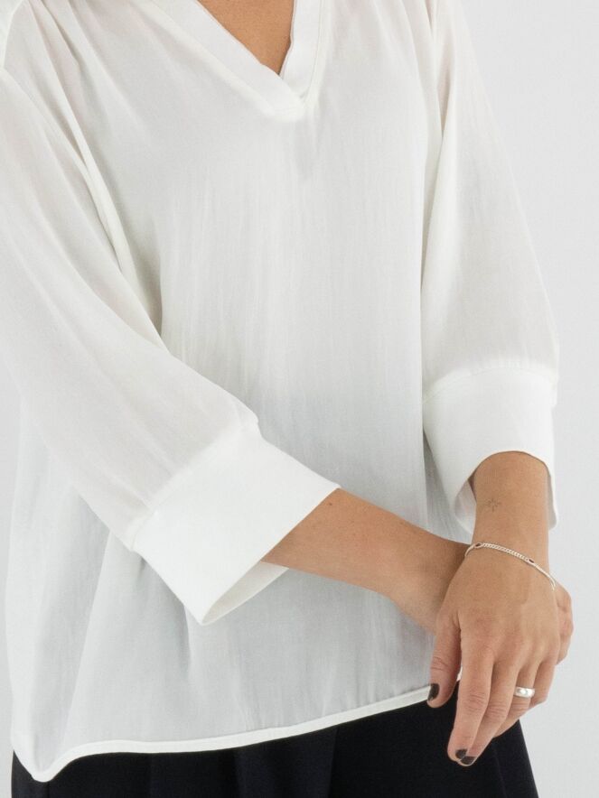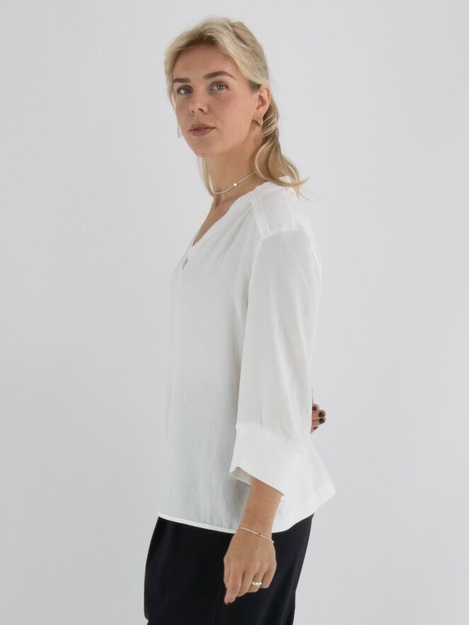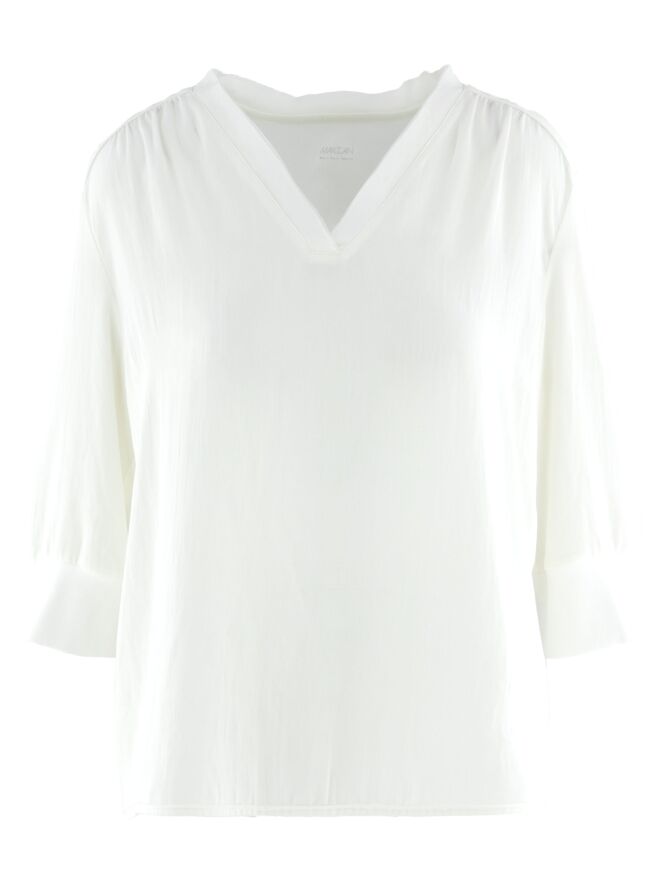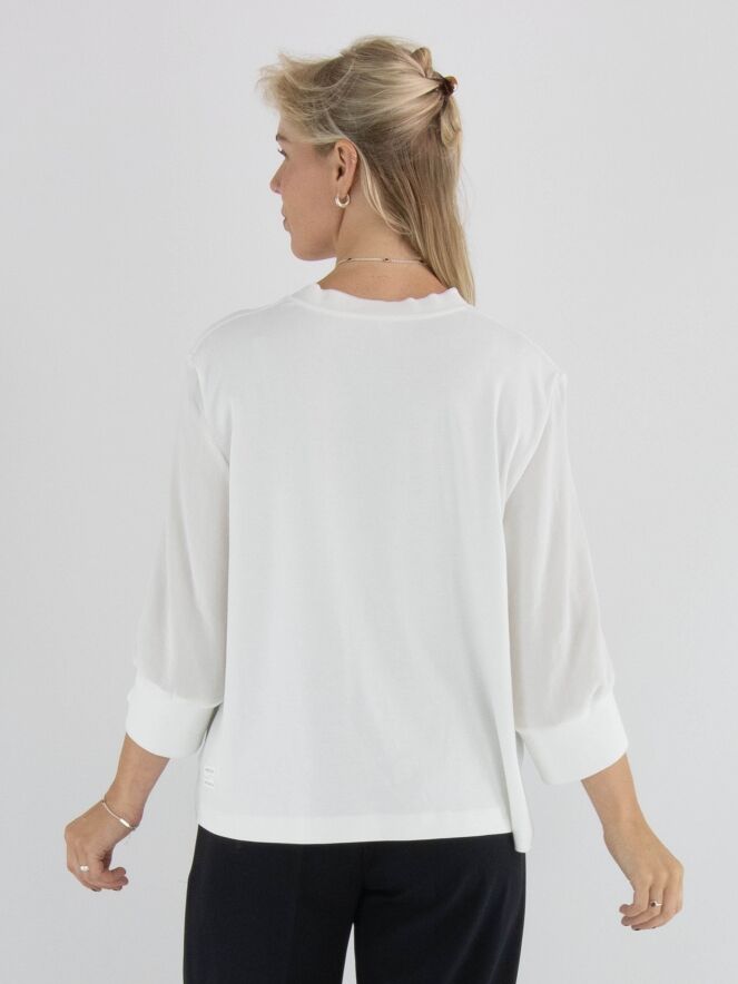 Ein Shirt von Marc Cain in der Farbe Off-White. Die halblangen Ärmel sind mit einem fein gerippten Strickbündchen versehen. Am Rand des V-Ausschnitts verläuft eine doppelte Blende. Dieses Shirt kann bei 30 Grad gewaschen werden.
