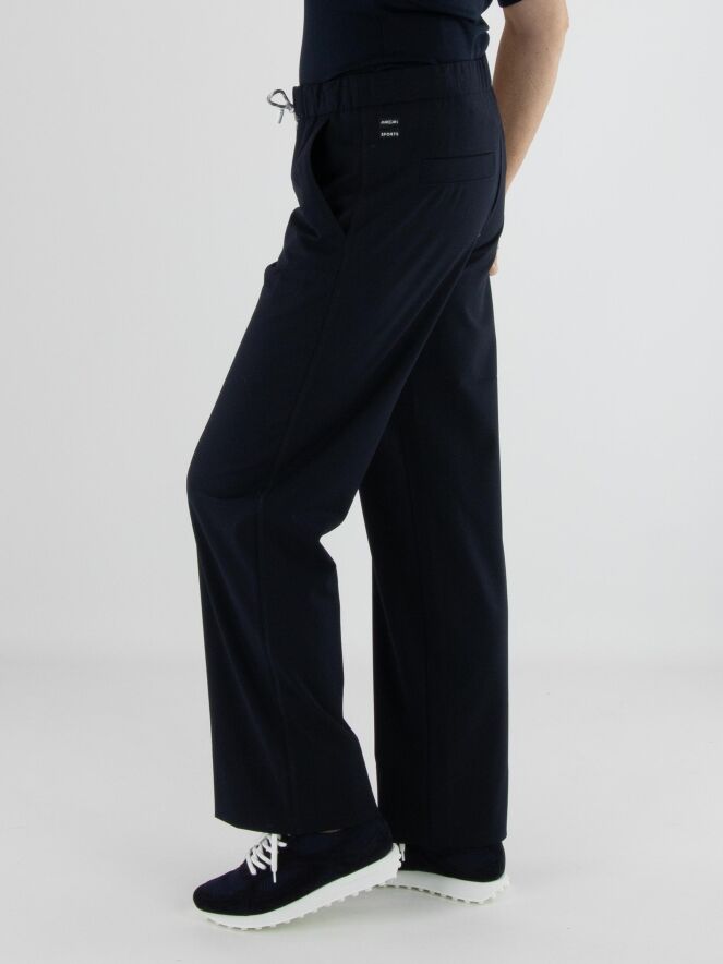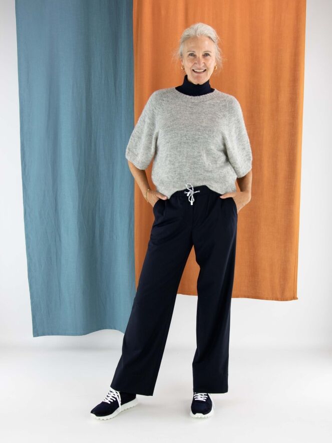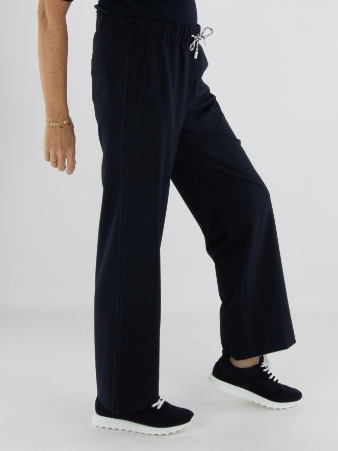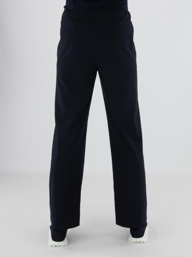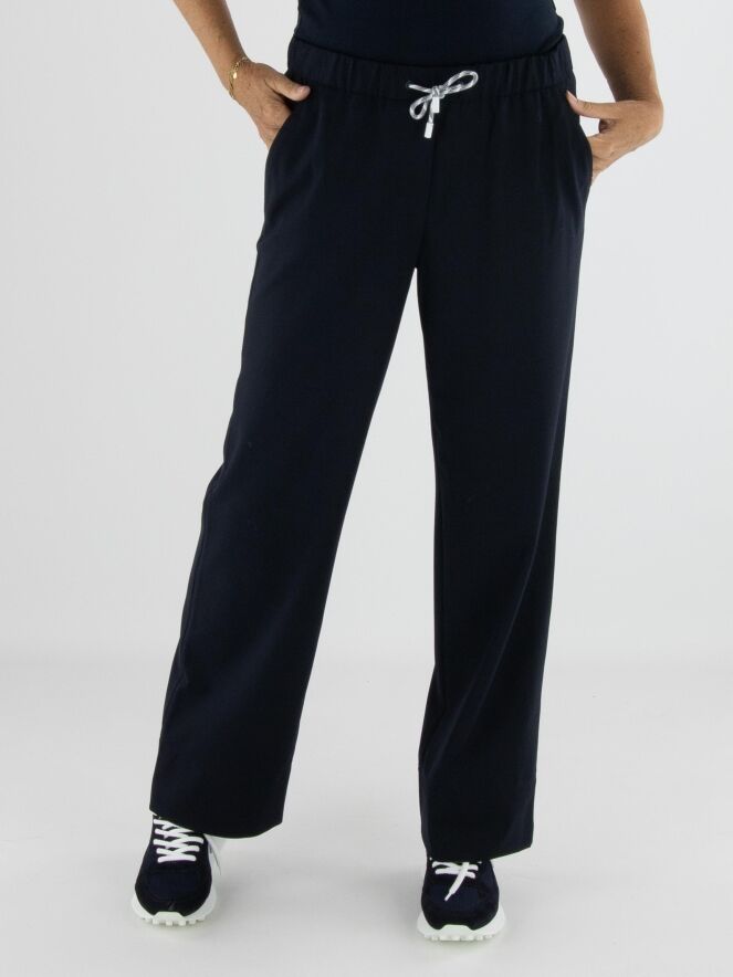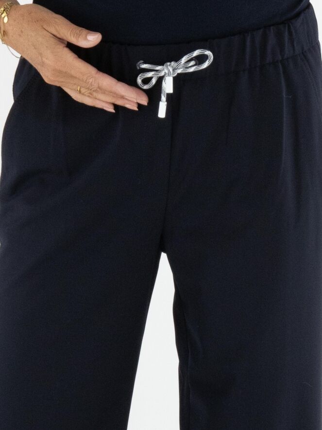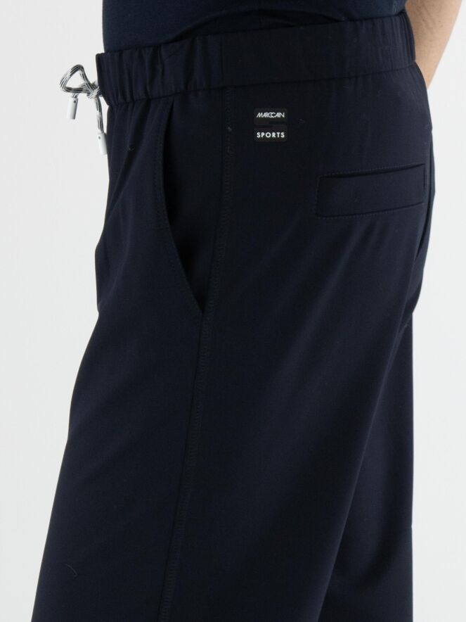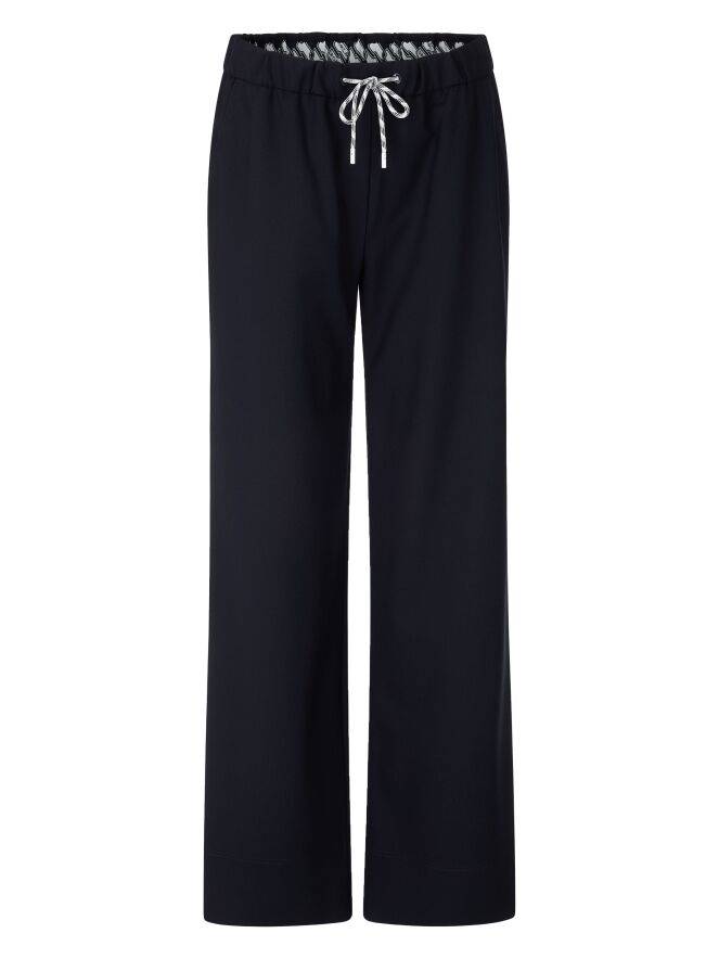 Jogginghose von Marc Cain in Marineblau. Im Bund befindet sich ein plissierter Gummizug mit einem Tunnelzugband. Zehn Zentimeter oberhalb des Beinabschlusses verläuft eine doppelte Ziernaht. Die Hose hat seitliche Eingrifftaschen und kann bei 30 Grad gewaschen werden.