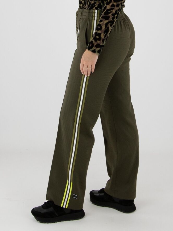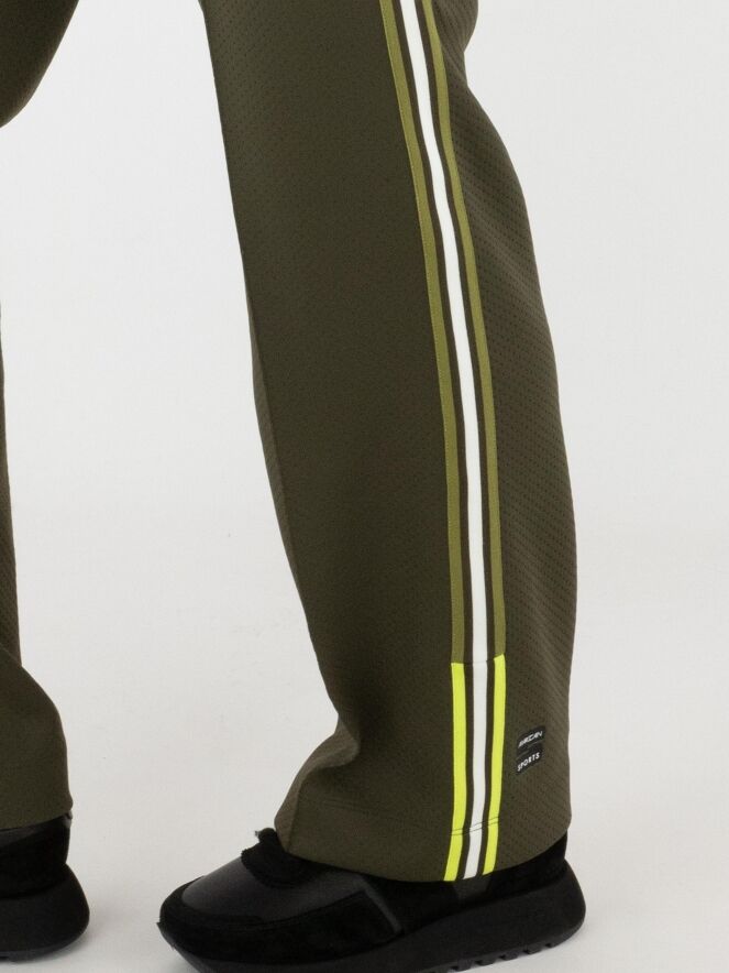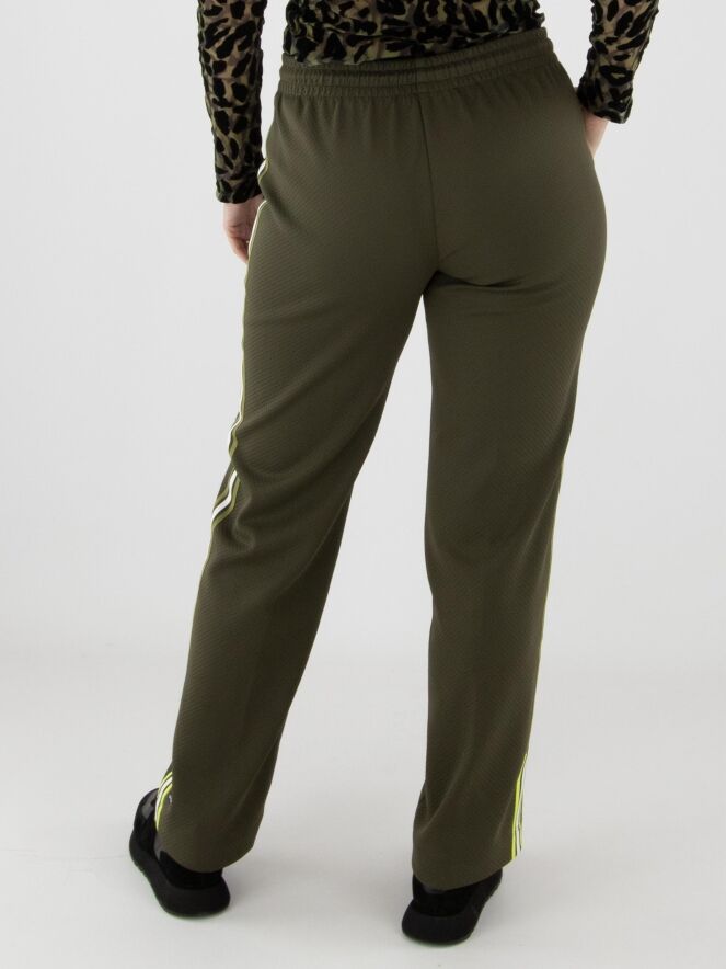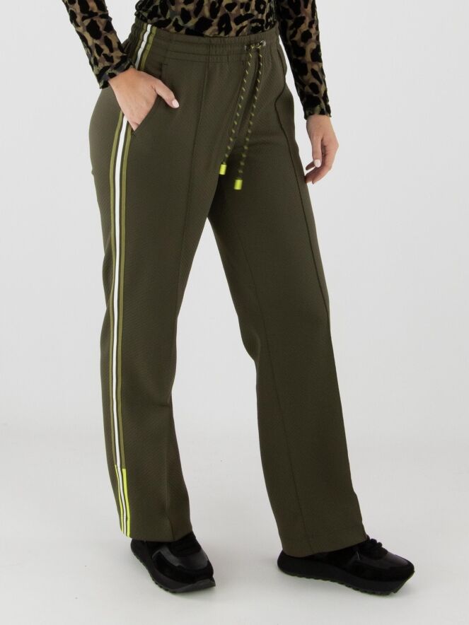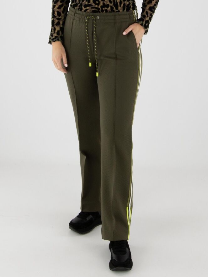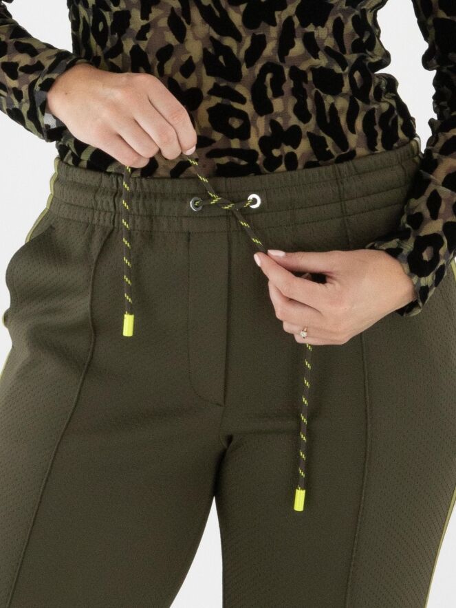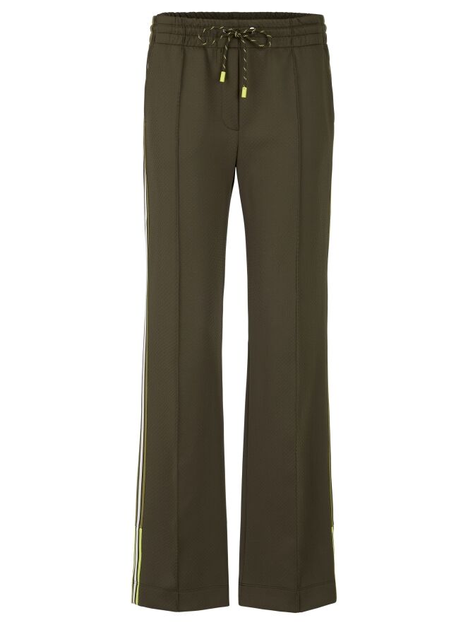 Eine Jogginghose von Marc Cain in Olivgrün. Die Hose besteht aus zwei Stofflagen, wobei die obere Schicht fein perforiert ist. Der breite, elastische Bund hat ein Tunnelzugband. An den Seiten der Beine verläuft eine Biese mit einem Streifenmuster in Pistaziengrün, Weiß und Schwarz. Die Hose hat Eingrifftaschen und kann bei 30 Grad gewaschen werden.