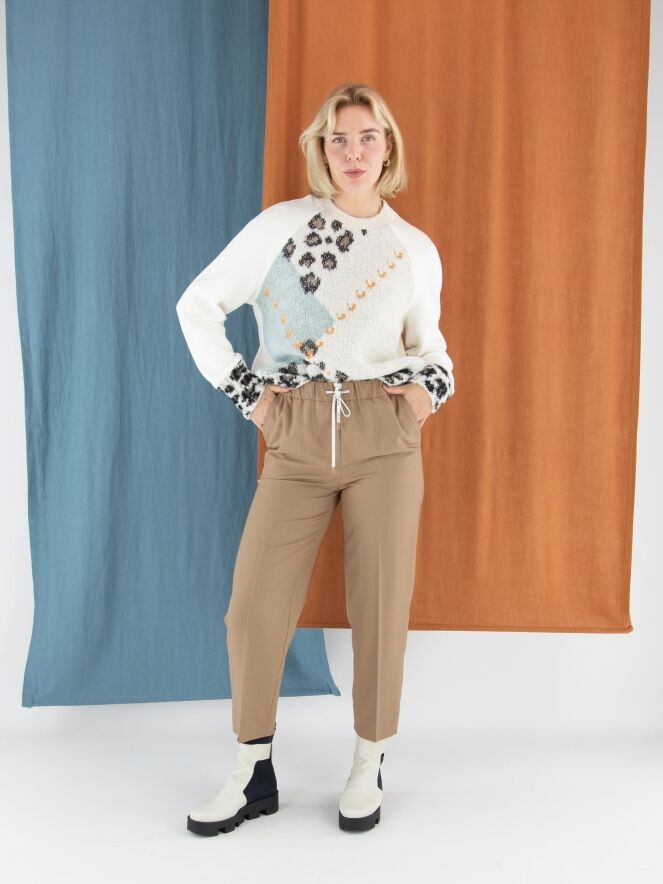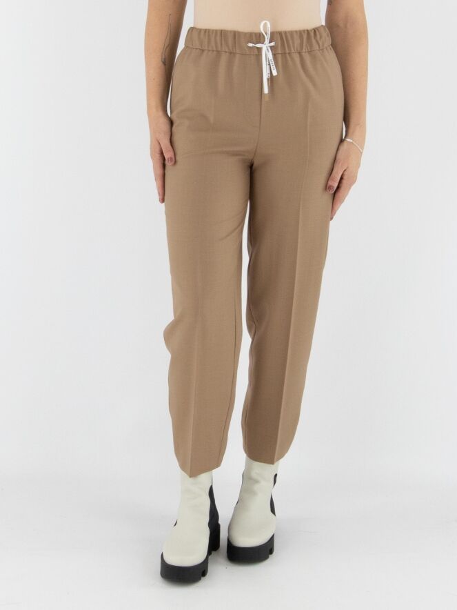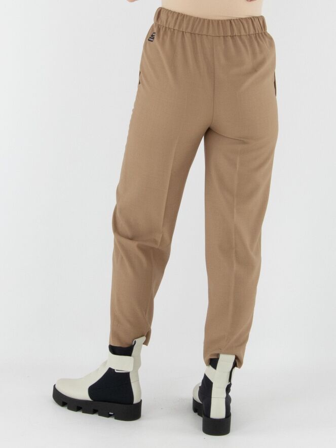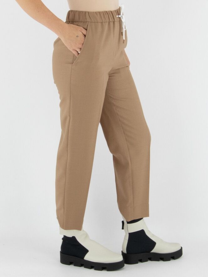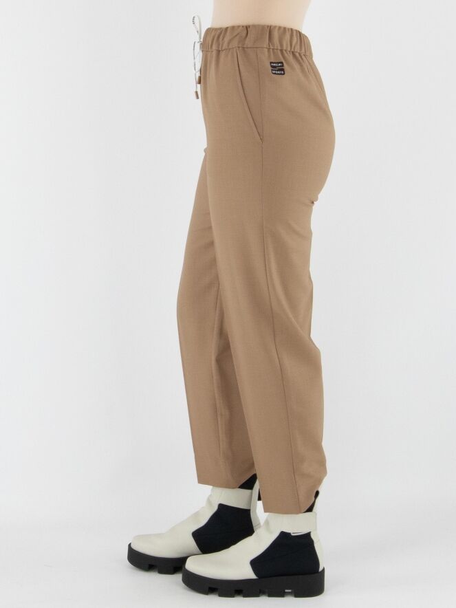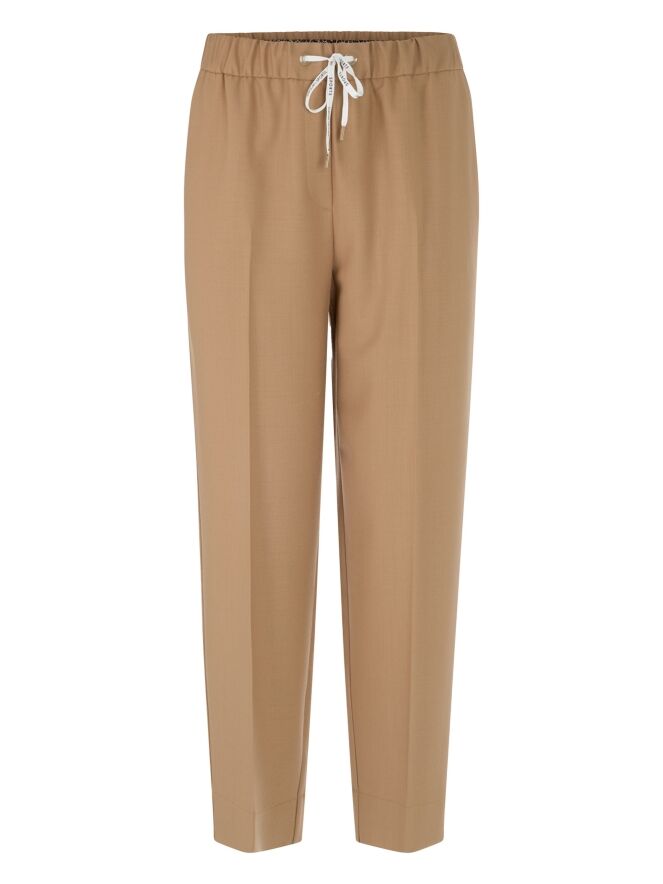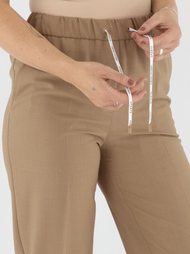 Eine Jogginghose im Look von Marc Cain in der Farbe Camel. Der Bund ist mit einem fein plissierten elastischen Einsatz und einem Kordelzug in Tunnelverarbeitung gearbeitet. Die Hose verfügt über Seitentaschen und darf nicht gewaschen werden.