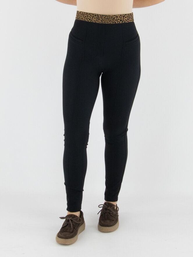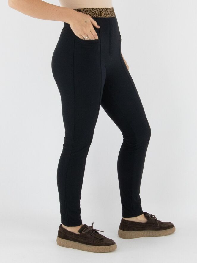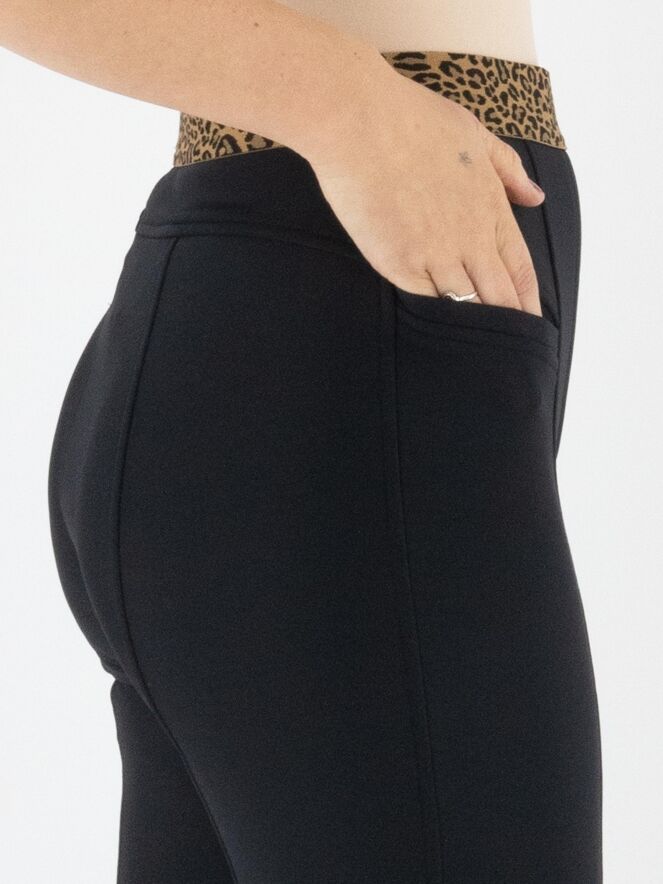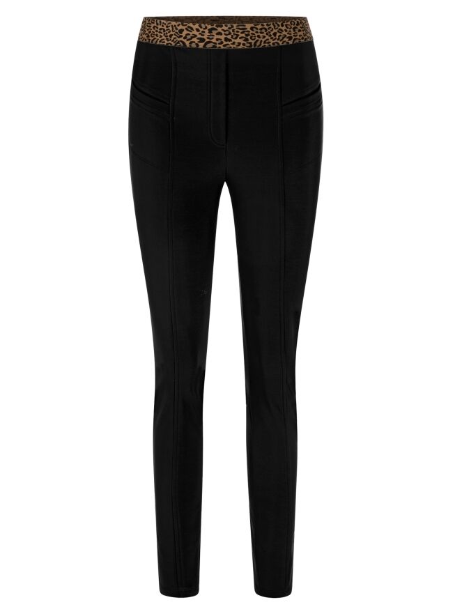 Eine Leggings von Marc Cain in Schwarz. Der Bund ist mit einem elastischen Einsatz im Leopardenprint in Braun und Schwarz gearbeitet. Die Leggings verfügt über kurze Taschen und kann bei 30 Grad gewaschen werden.