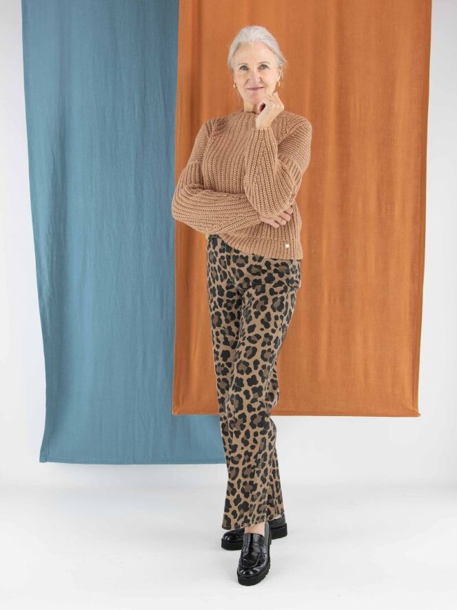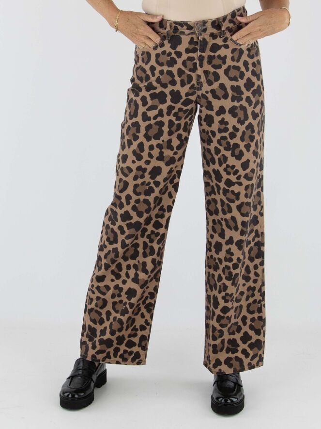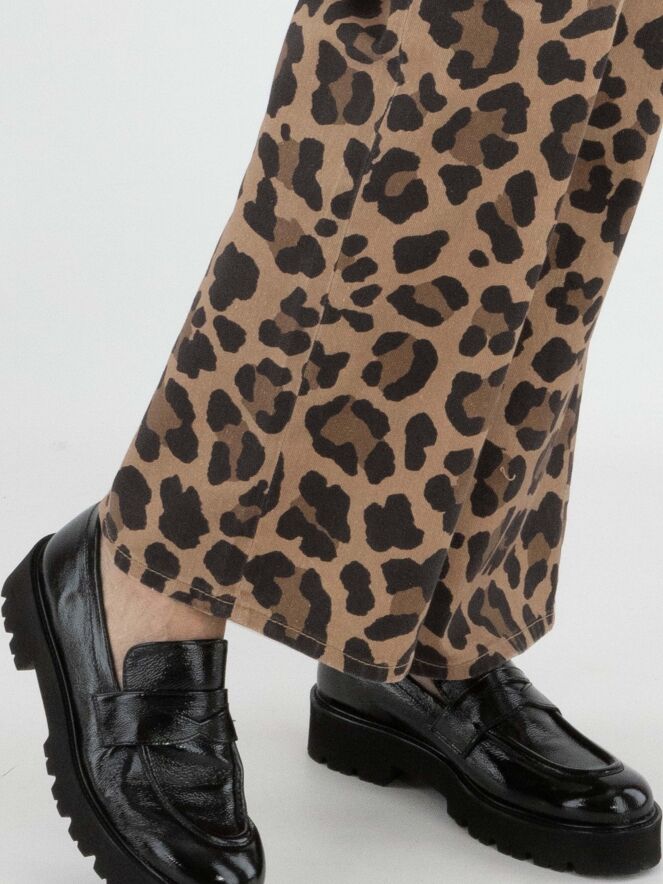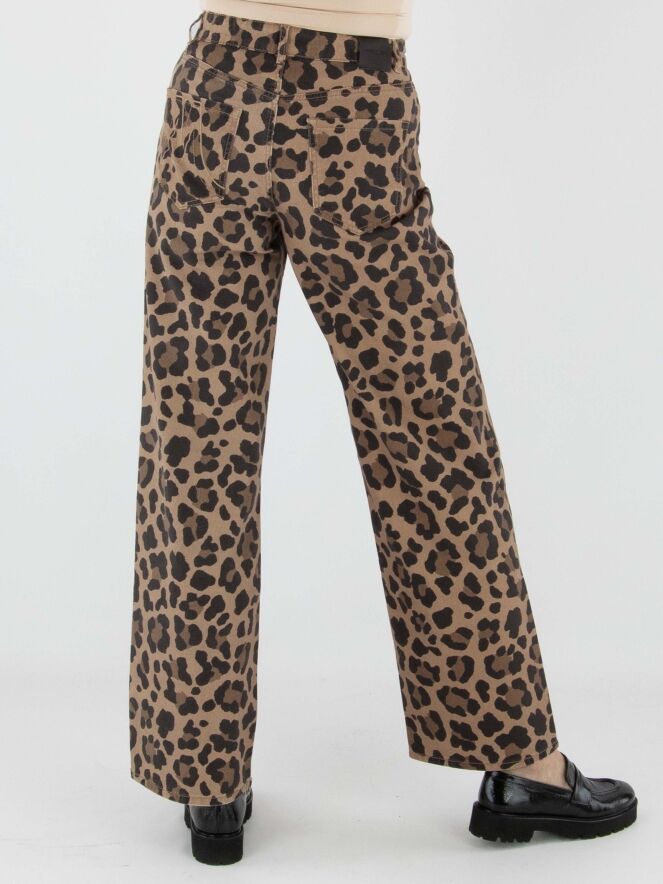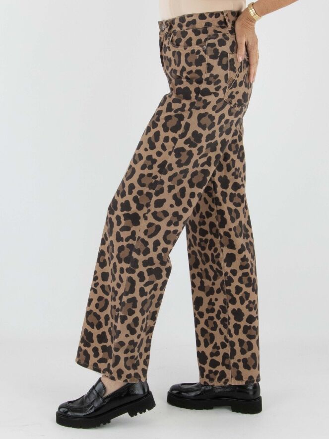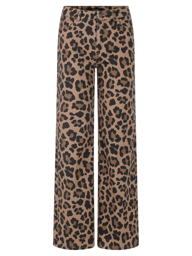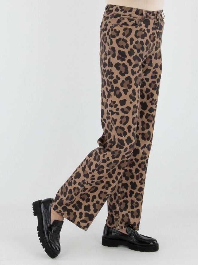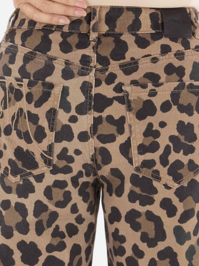 Eine weite Jeans von Marc Cain im Leo-Print mit verschiedenen Braun- und Schwarztönen. Die Jeans ist im klassischen 5-Pocket-Stil gearbeitet und kann bei 30 Grad gewaschen werden.