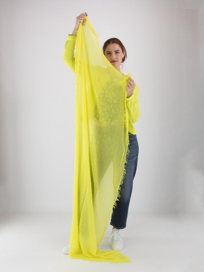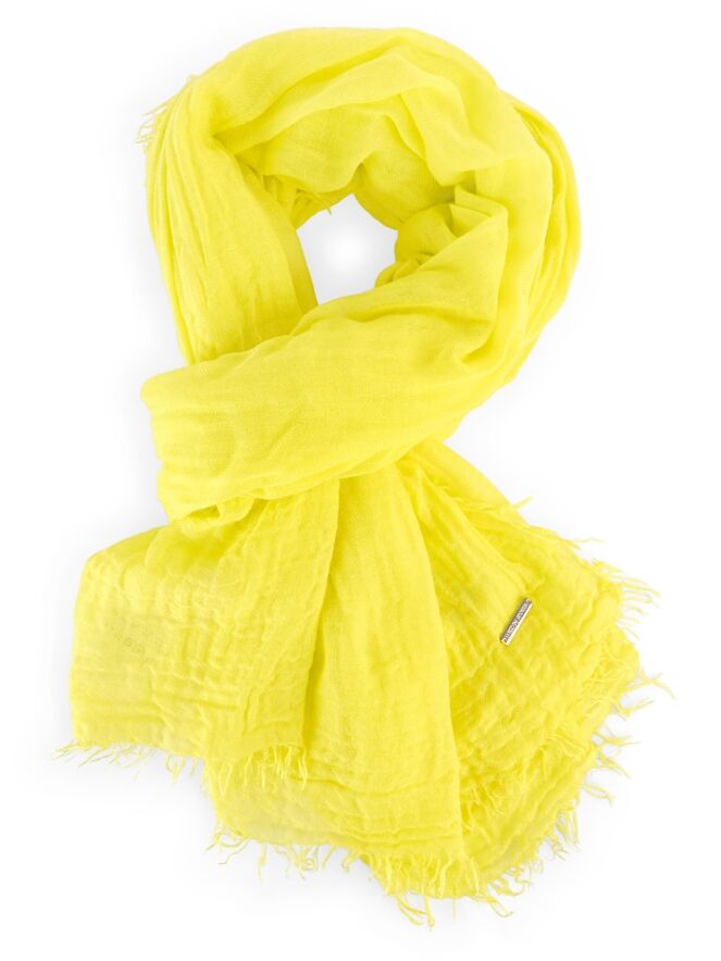 Luxuriöses, geknittertes Tuch von Marc Cain in Gelb. Die Ränder des Tuchs sind fein ausgefranst. Dieses Tuch sollte von Hand gewaschen werden.