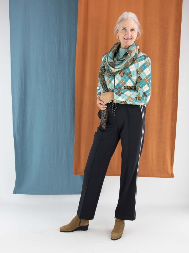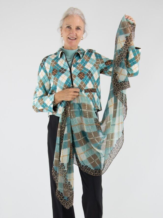 Ein leicht transparente Schal von Marc Cain, gestaltet in einem eleganten Argyle-Muster mit Türkis-, Braun-, Orange- und Cremeweiß-Tönen. Entlang der Ränder verläuft ein breites Band im Leo-Print in Braun- und Schwarztönen, das für einen stilvollen Kontrast sorgt. Dieser Schal kann per Hand gewaschen werden.