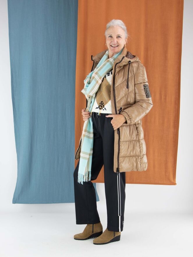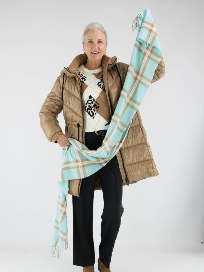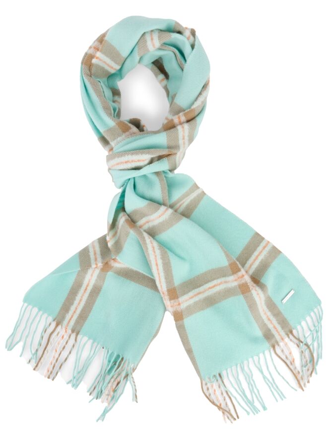 Ein langer, luxuriöser Schal von Marc Cain mit einem vergrößerten Karomuster in Türkis, Cremeweiß, Orange und Camel. An den Enden ist der Schal mit langen Fransen verziert, die ihm eine elegante und zugleich verspielte Note verleihen. Dieser Schal kann per Hand gewaschen werden.