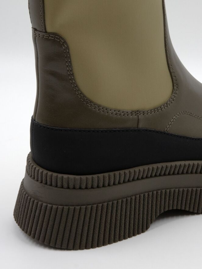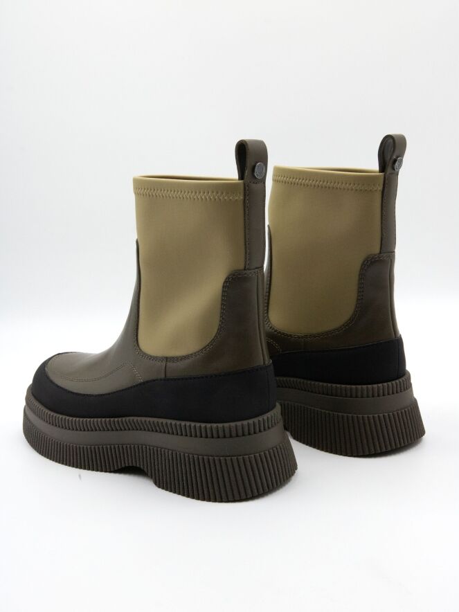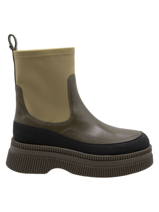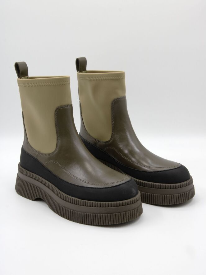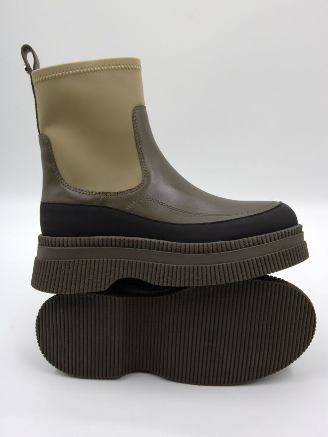 Stiefelette von Marc Cain in verschiedenen Grüntönen mit Schwarz. Entlang des Rands der moosgrünen, fein gerippten Sohle verläuft ein Band aus mattem, schwarzem Leder. Der Vorderfuß mit schmalem Übergang zur Ferse ist aus olivgrünem Leder gearbeitet. Der Schaft ist pistaziengrün und besteht aus elastischem Material.