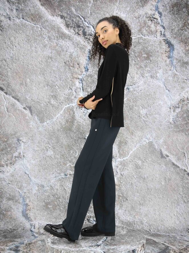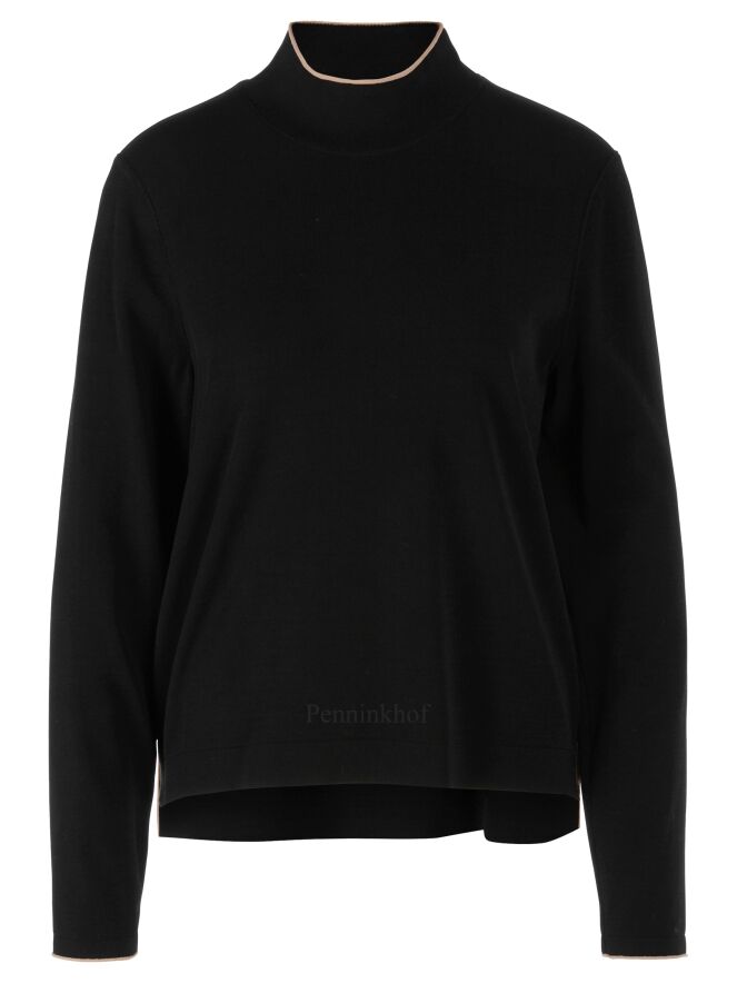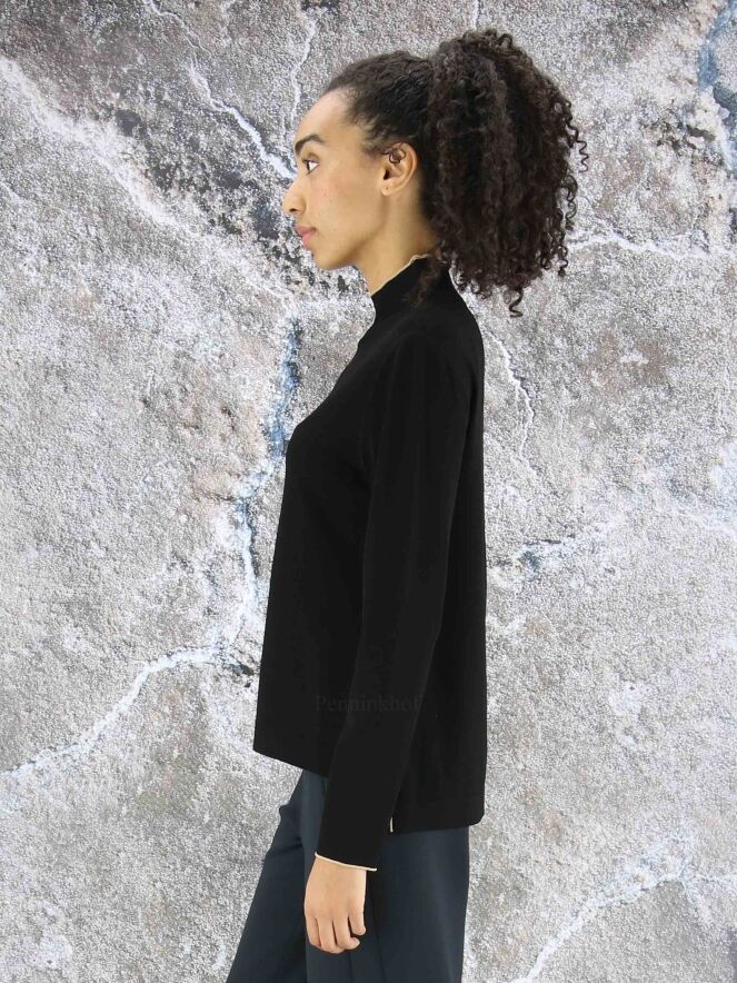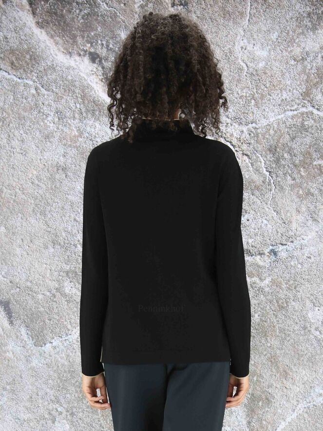 Ein schwarzer Pullover der Designermode von Marc Cain. Entlang des Rollkragens, am Abschluss der langen Ärmel und an den Seiten befindet sich ein Streifen in der Farbe Camel. Der untere Saum ist auf beiden Seiten mit einem hohen Schlitz versehen. Dieser Pullover kann bei 30 Grad gewaschen werden.