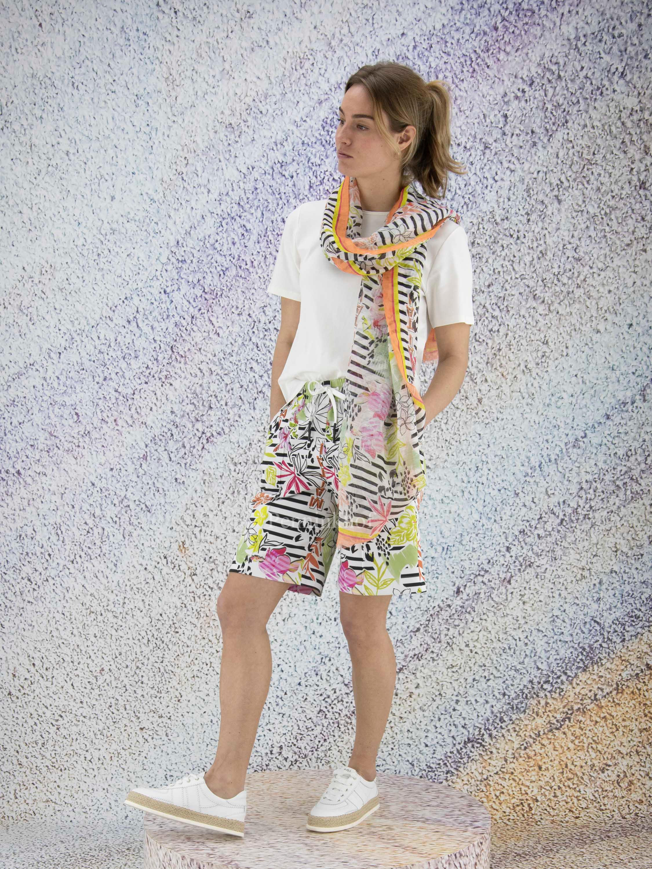 Ein cremeweißes Shirt der Designermode von Marc Cain. Entlang der Kante des Rundhalsausschnitts befindet sich ein durchsichtiger Besatz. Der untere Saum ist seitlich mit kleinen Schlitzen versehen. Das Shirt hat kurze Ärmel und kann bei 30 Grad gewaschen werden.
