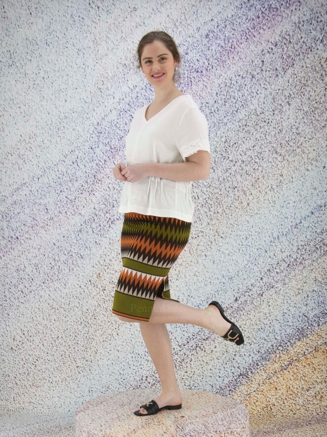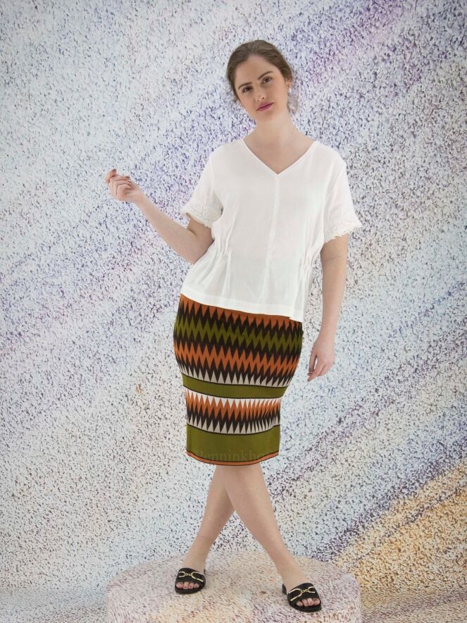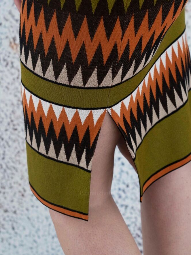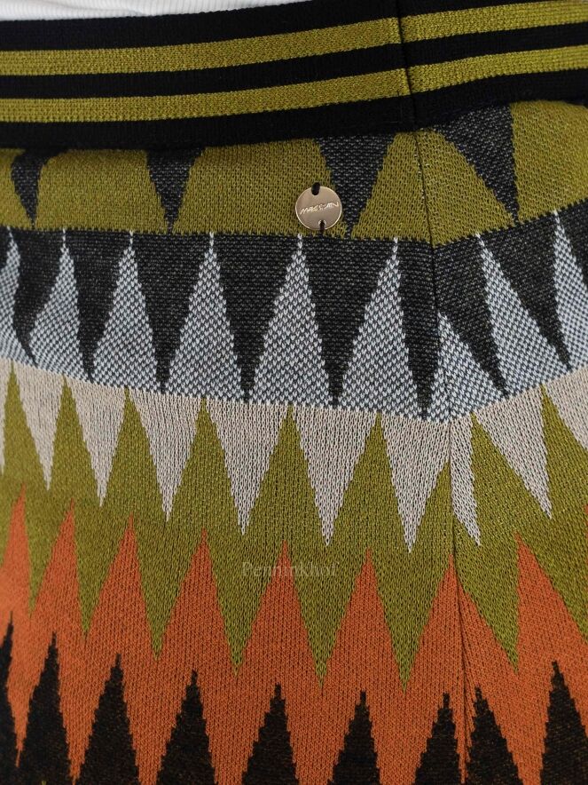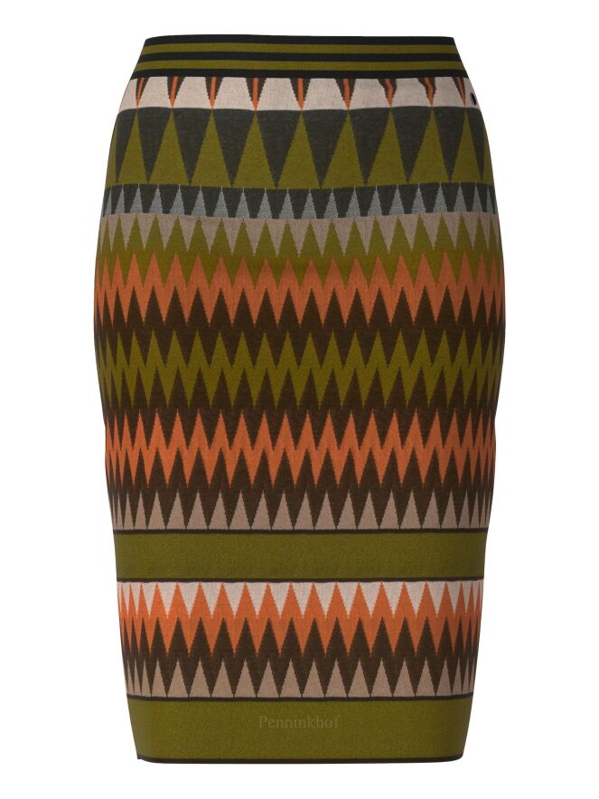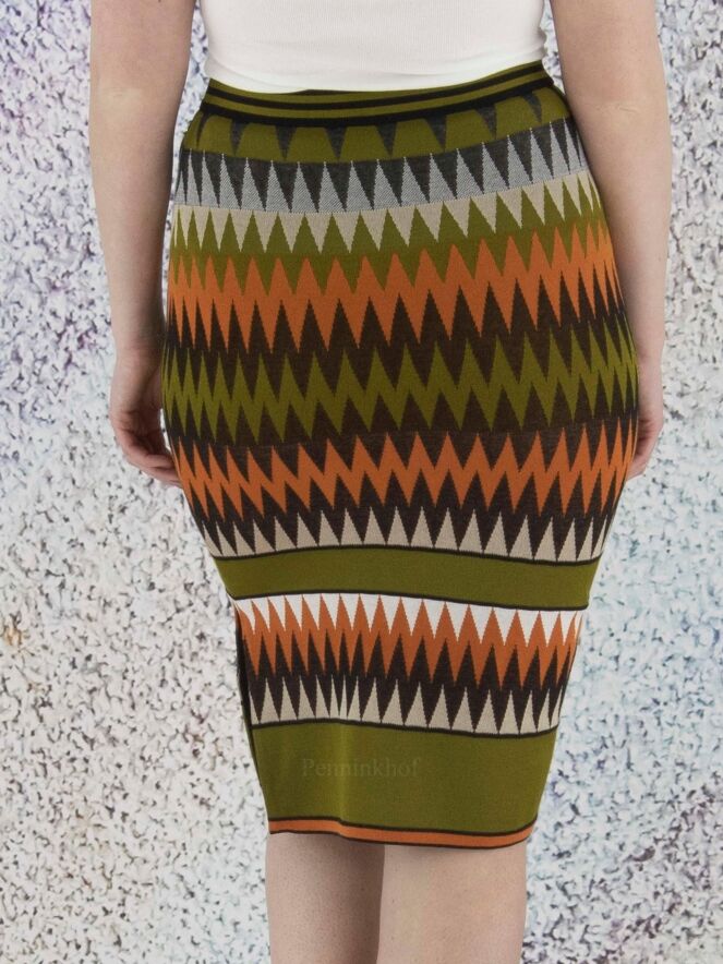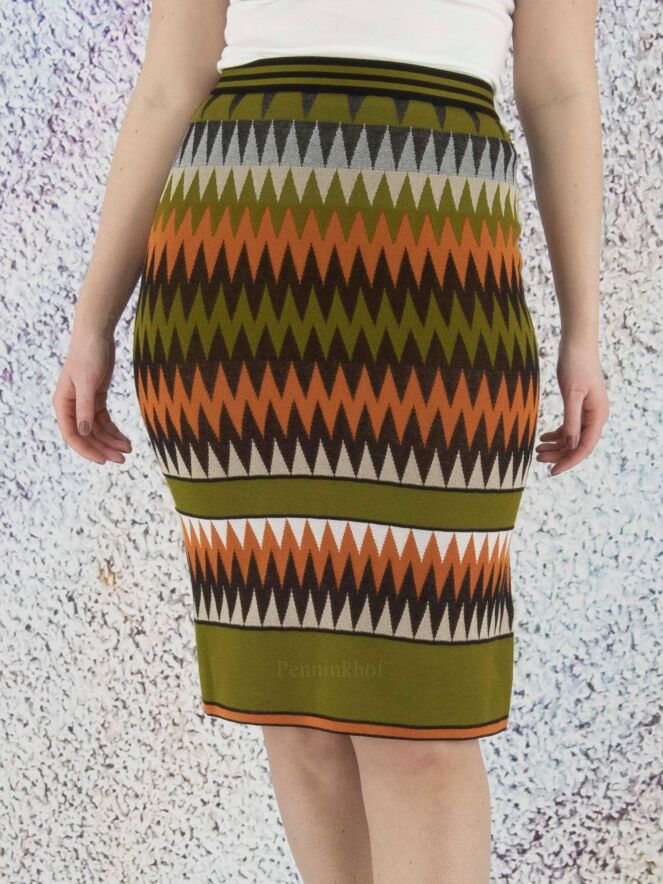 Ein Rock der Designermode von Marc Cain mit grafischem Mosaikdruck in Pistaziengrün, Orange, Cremeweiß und Schwarz. Der gestreifte Taillenbund ist dehnbar. Dieses Kleid ist gefüttert und kann bei 30 Grad gewaschen werden.