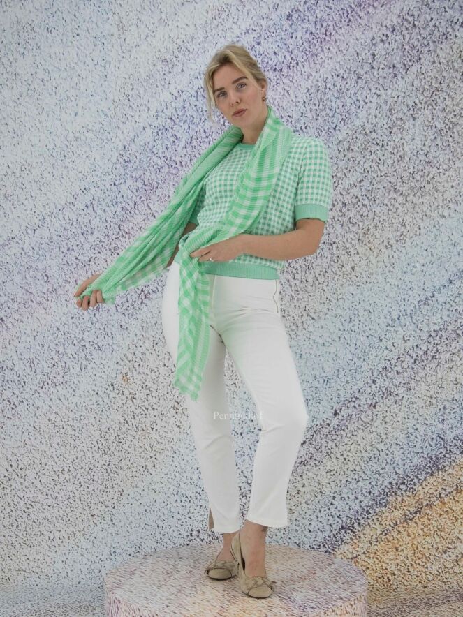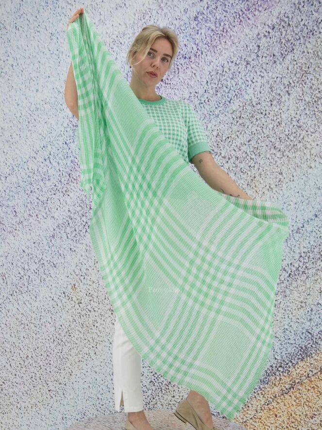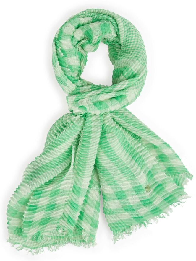 Ein leicht transparentes Tuch der Designermode von Marc Cain mit Karomuster in den Farben Grün und Weiß. Der Stoff ist fein plissiert und am Rand zart gefranst. Dieser Schal kann von Hand gewaschen werden.