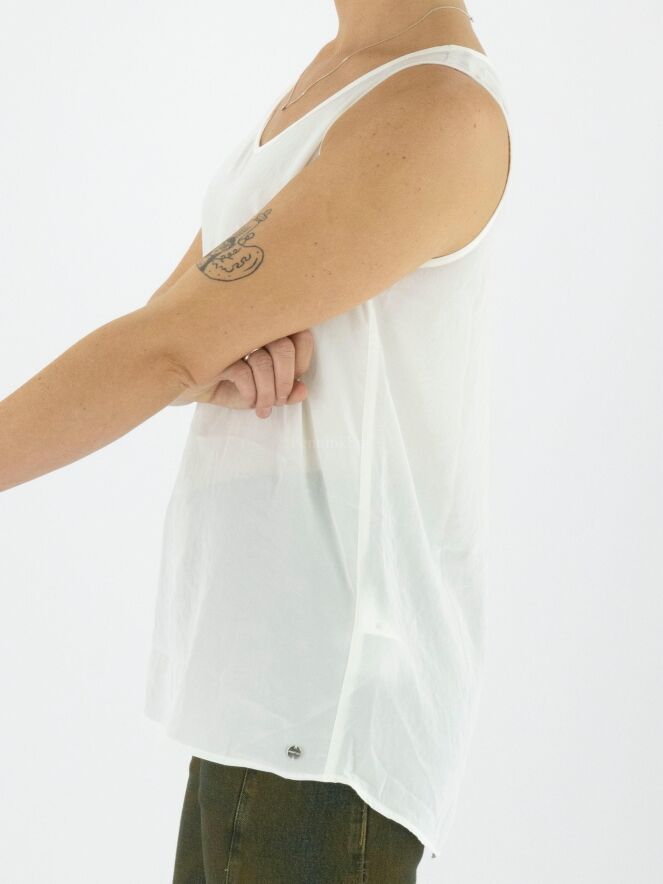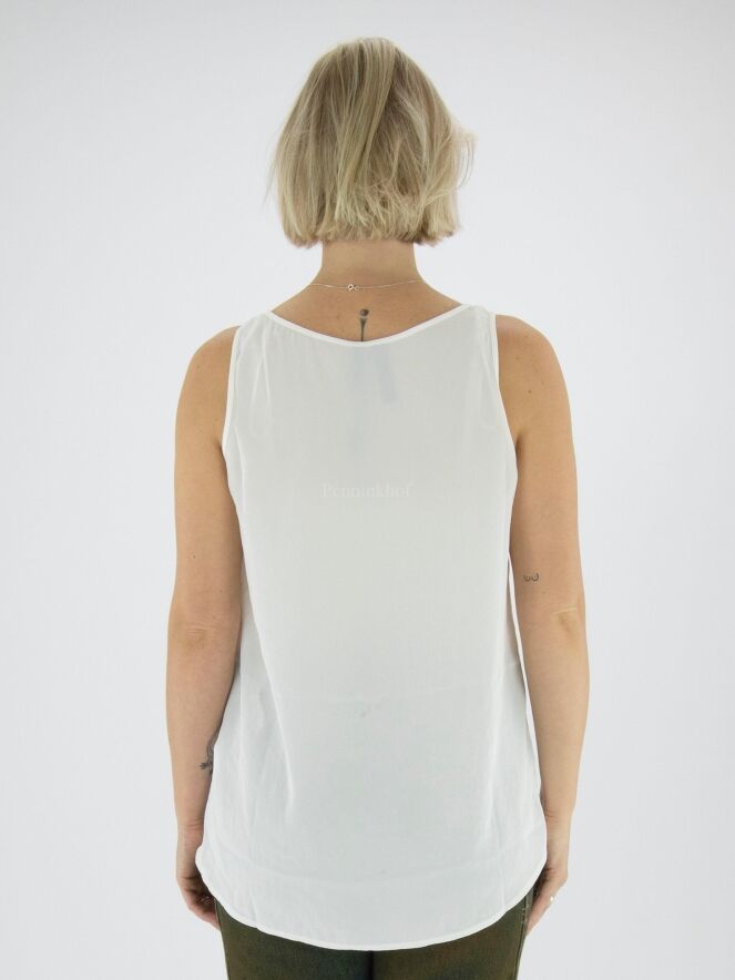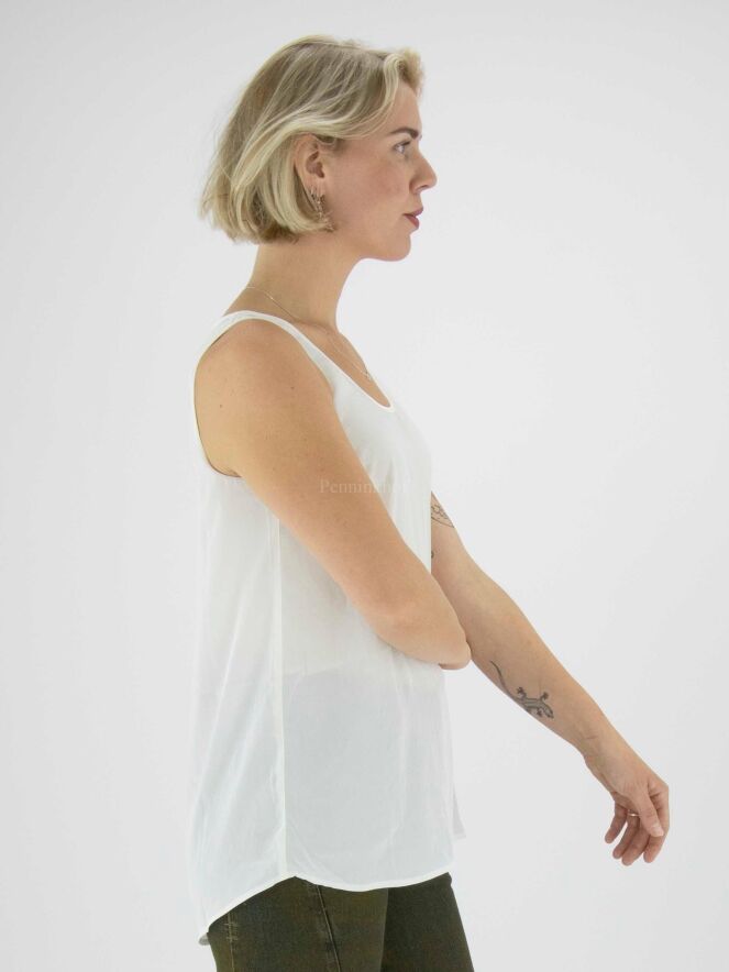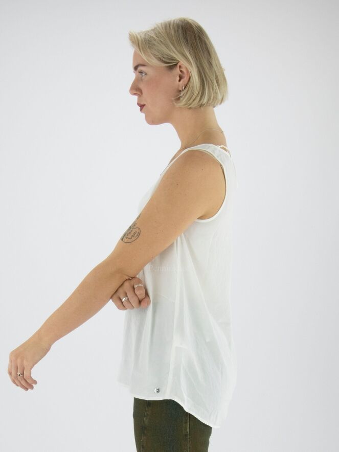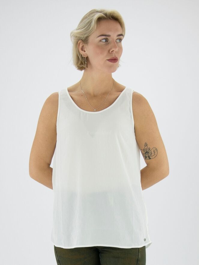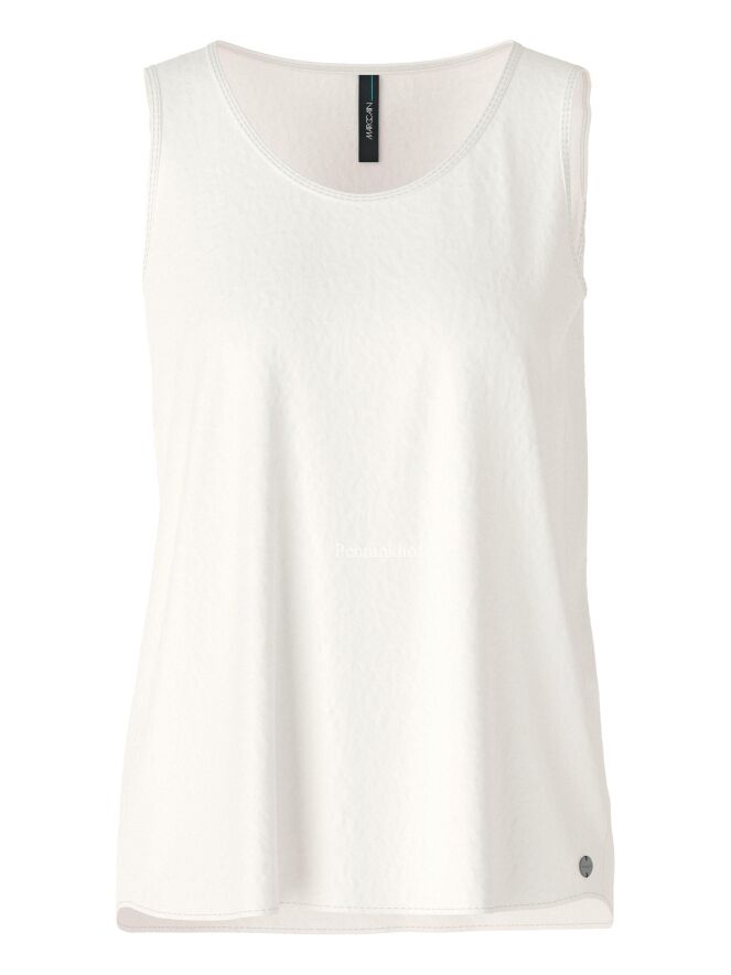 Ein Marc Cain Oberteil aus einem matten glatten Stoff in der Farbe cremeweiß. Das Top hat einen Rundhalsausschnitt und kann bei 30 Grad gewaschen werden.