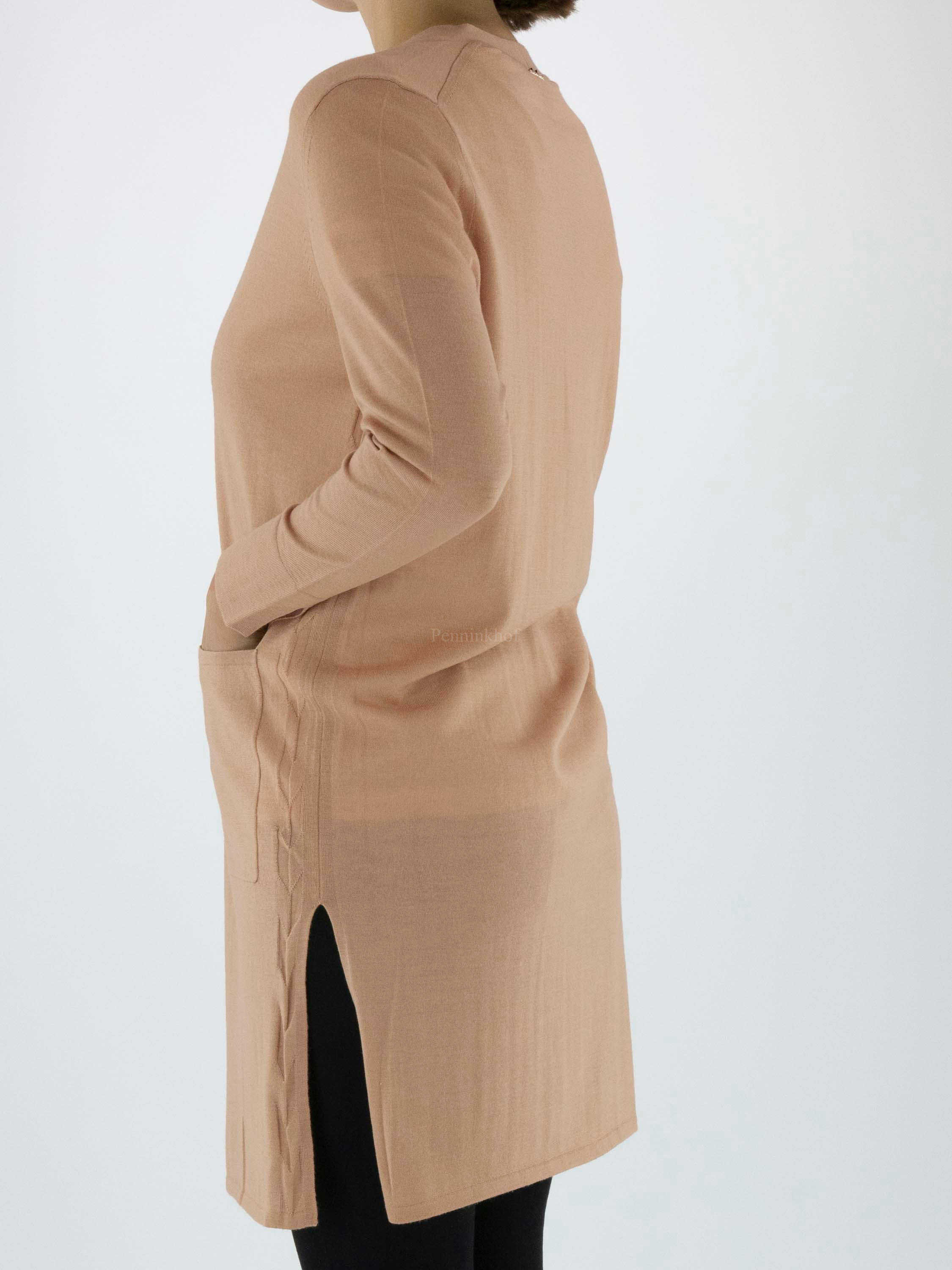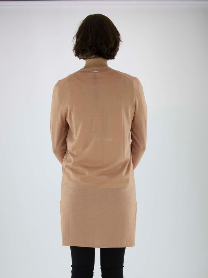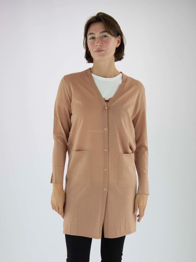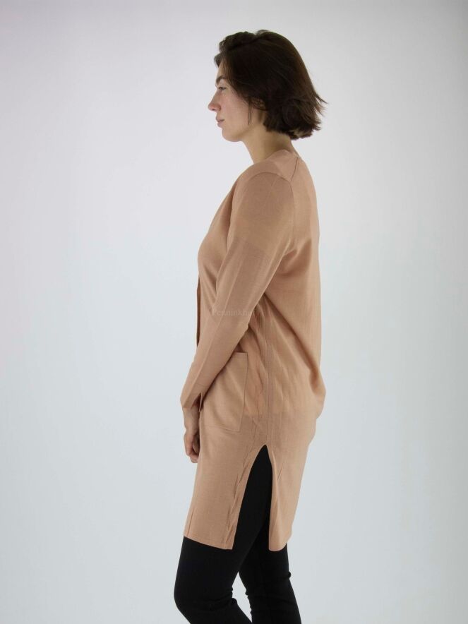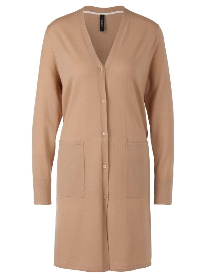 Ein langer Cardigan der Designermode von Marc Cain in der Farbe Camel. Der untere Saum ist seitlich mit hohen Schlitzen versehen. Die Strickjacke hat lange Ärmel und kann von Hand gewaschen werden.