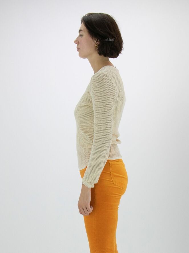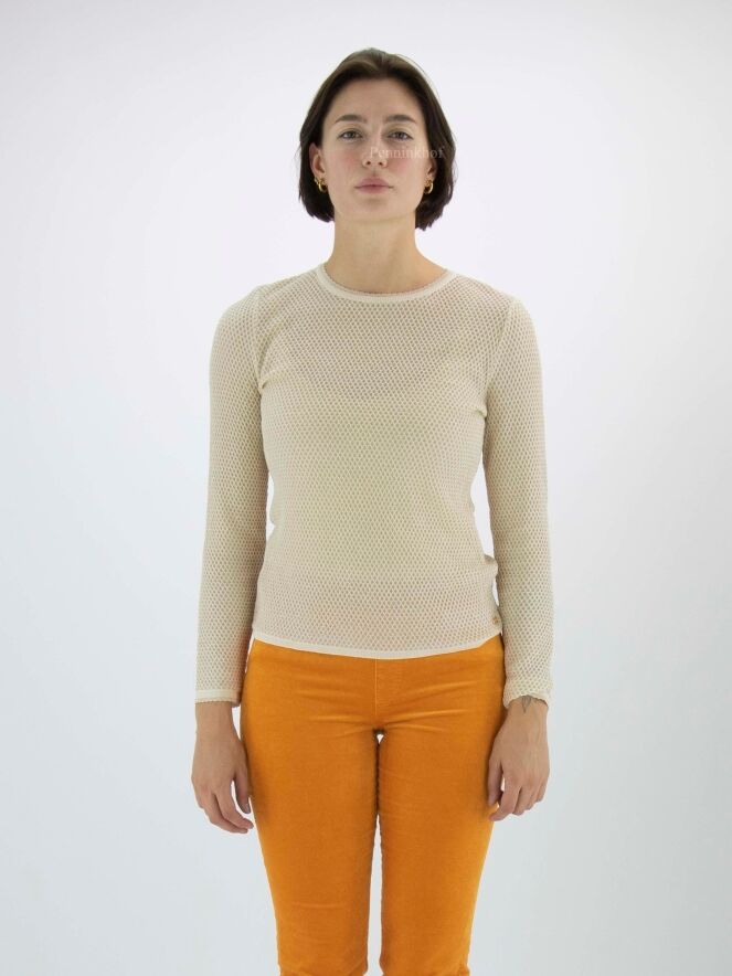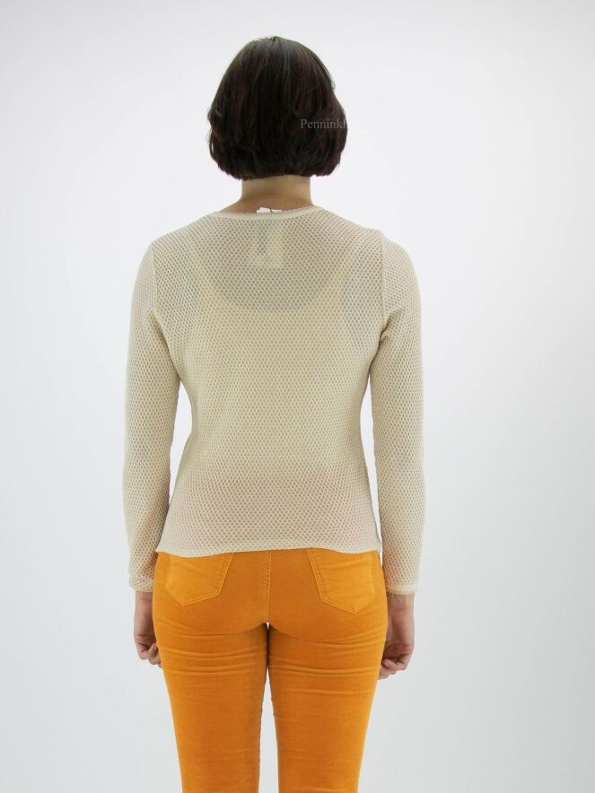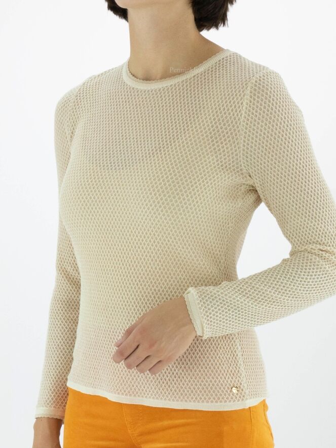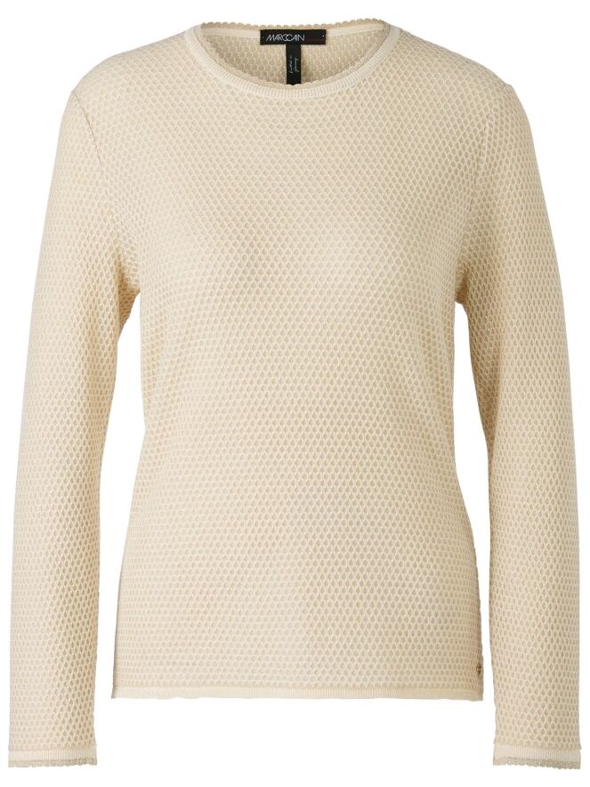 Pullover von Marc Cain in einem Rattenmuster in der Farbe Sand. Ein goldener Faden ist durch den Stoff gewebt. Am Rand des Rundhalsausschnitts und am Ende der langen Ärmel befindet sich ein schuppenförmiger Saum. Dieser Pullover kann bei 30 Grad gewaschen werden.