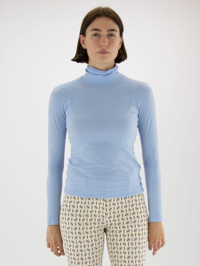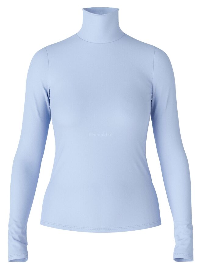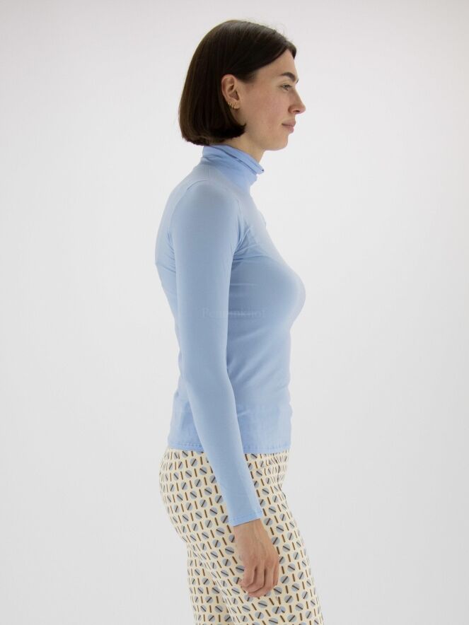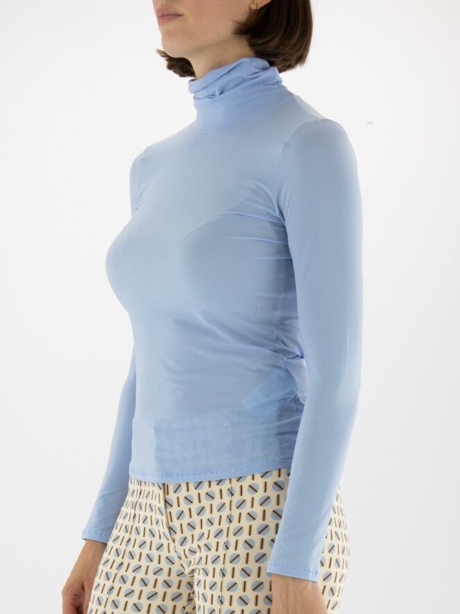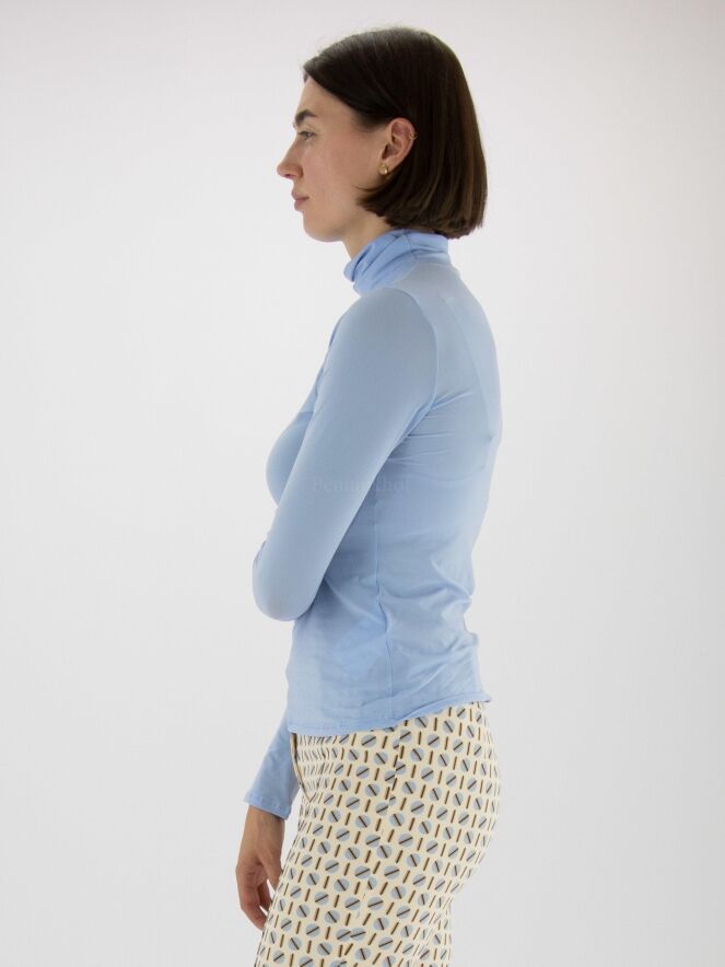Ein leicht transparentes Shirt der Designermode von Marc Cain in Eisblau. Das Oberteil hat einen Schildkrötenkragen und lange Ärmel. Dieses Shirt kann bei 30 Grad gewaschen werden.