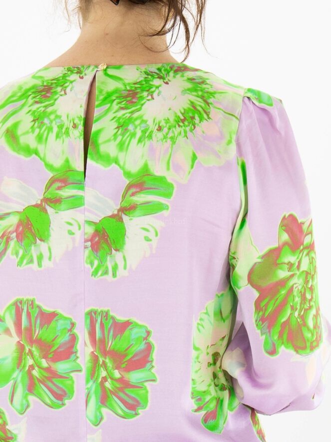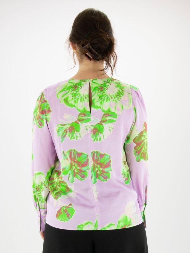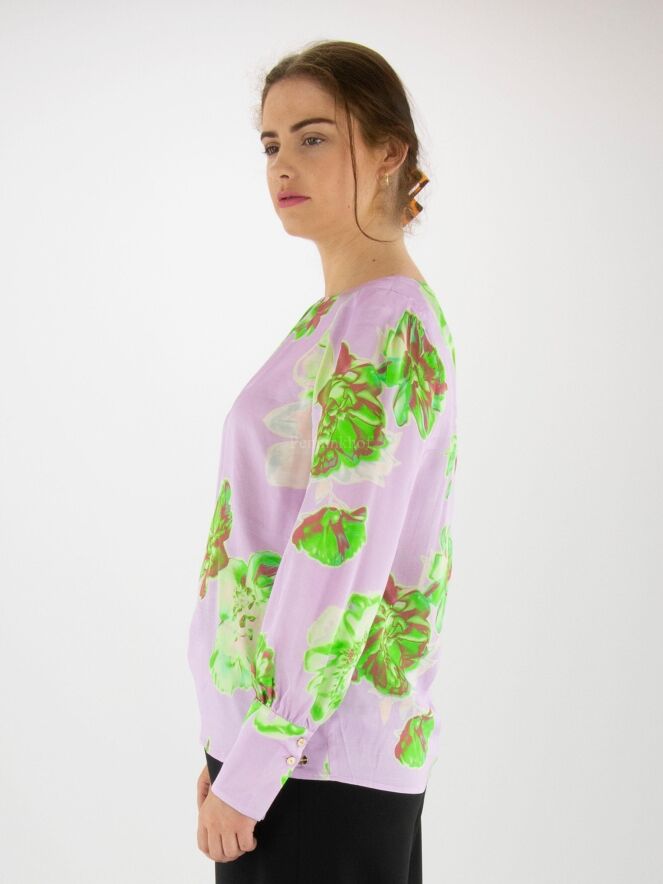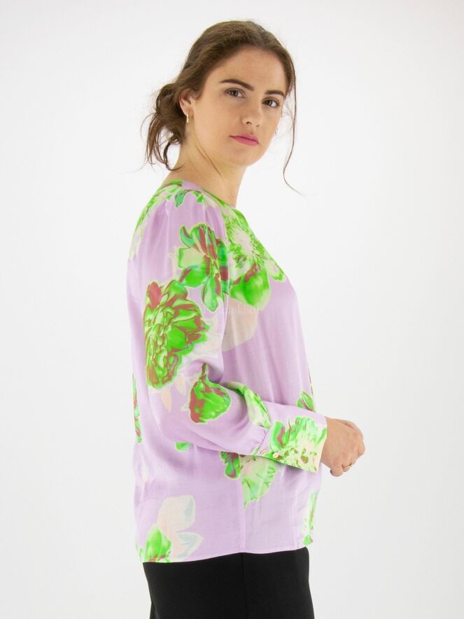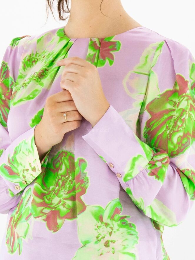 Marc Cain Shirt mit Blumendruck in verschiedenen Grüntönen, Cremeweiß und Dunkelrot auf fliederfarbenem Hintergrund. In der Mitte des Rundhalsausschnitts befinden sich einzelne Falten. Am Ende der langen Ärmel befinden sich Manschetten mit feinen Faltennähten entlang der Kanten. Dieses Shirt kann bei 30 Grad gewaschen werden.