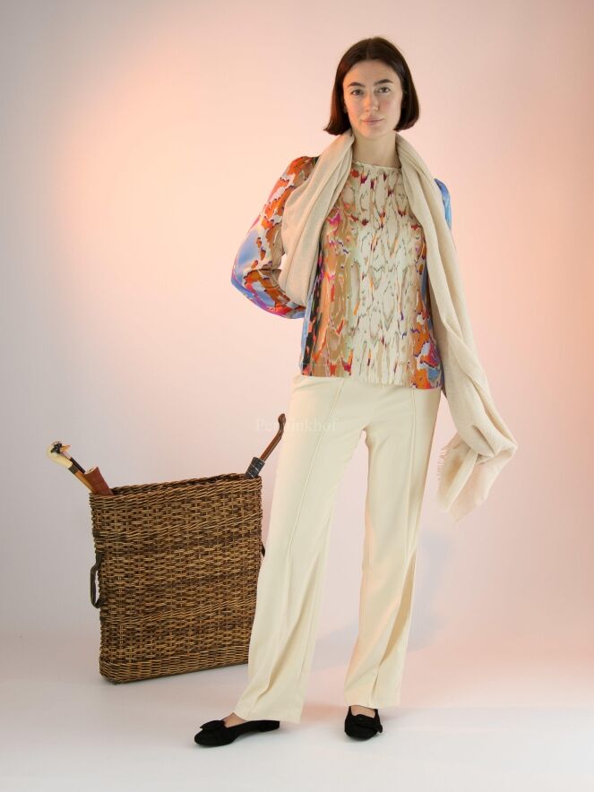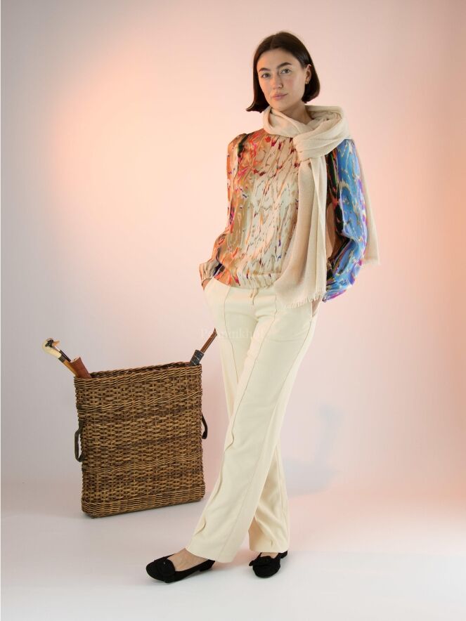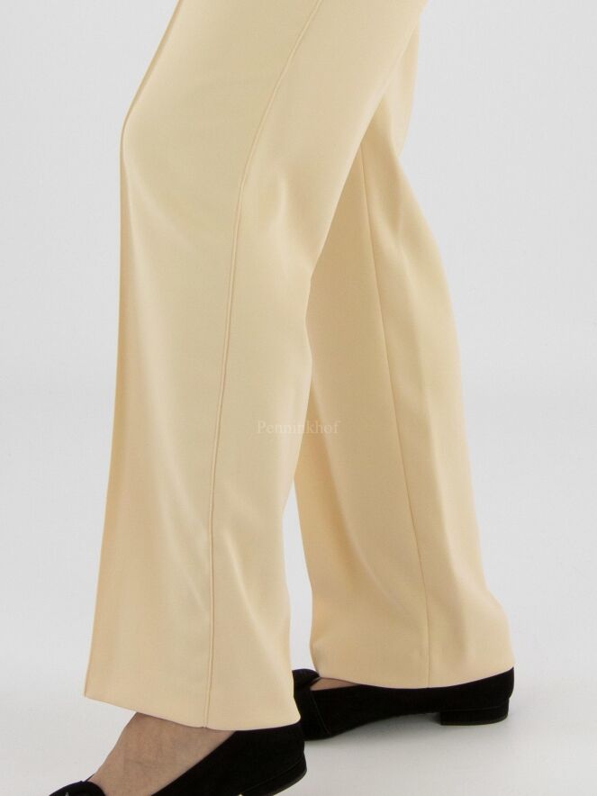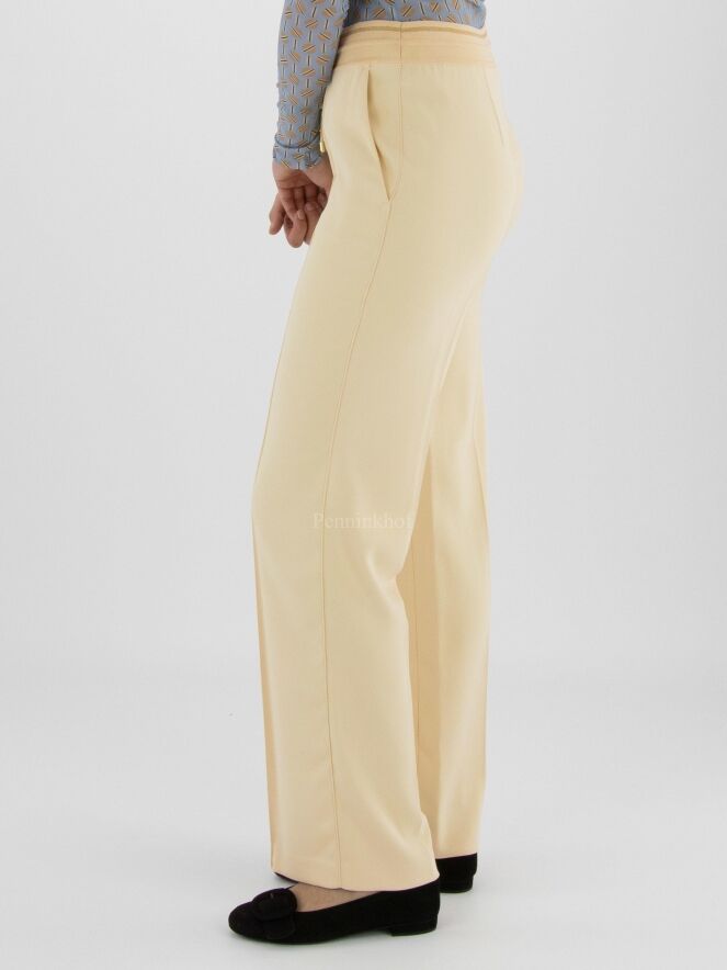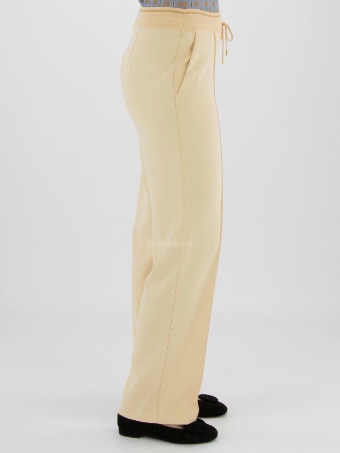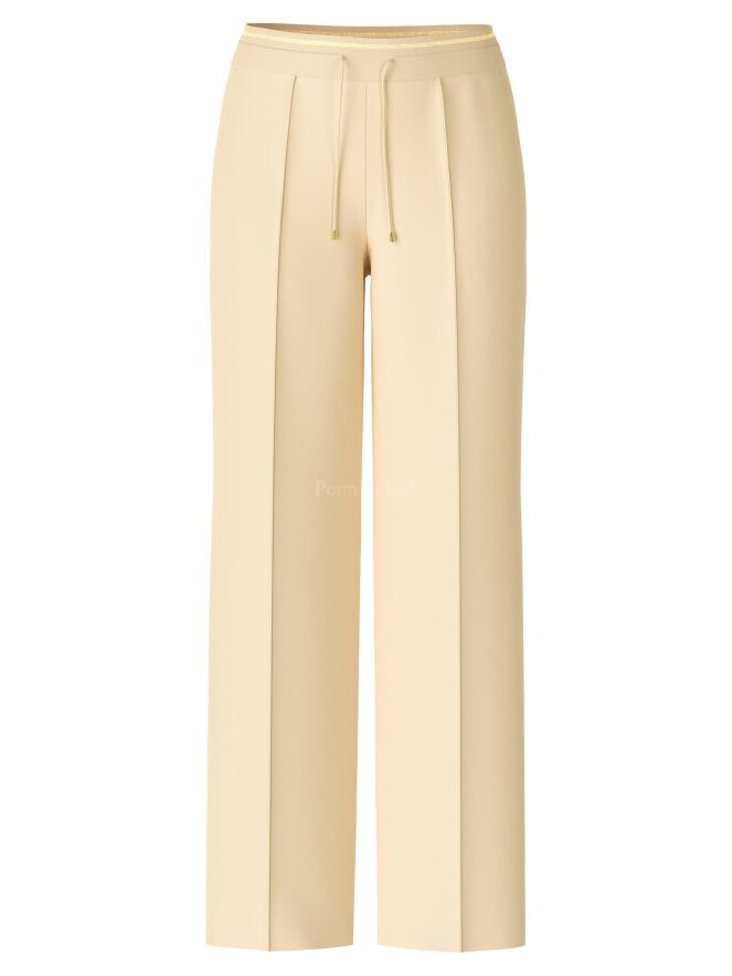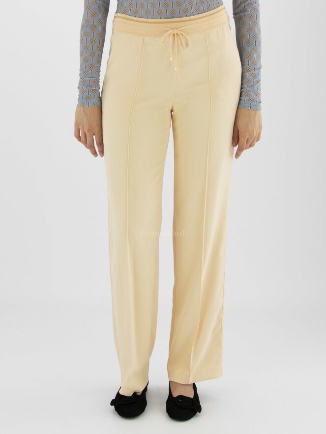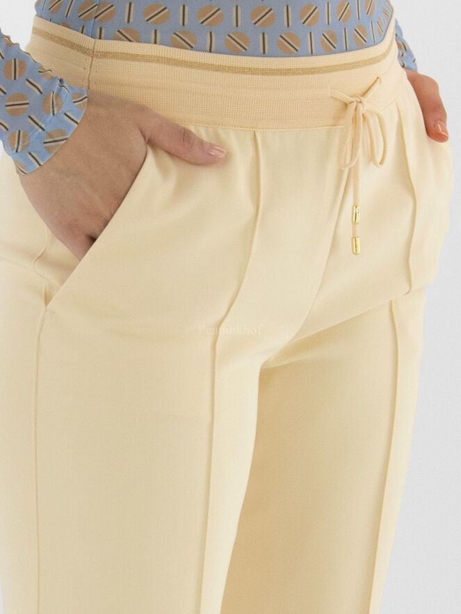 Eine hochwertige Jogginghose der Designermode von Marc Cain im Farbton Sand. Die Taille hat einen dehnbaren Bund mit Kordelzug. Eine mittige Naht akzentuiert die Hosenbeine. Die Hose kommt mit Eingriffstaschen und kann bei 30 Grad in der Waschmaschine gewaschen werden.
