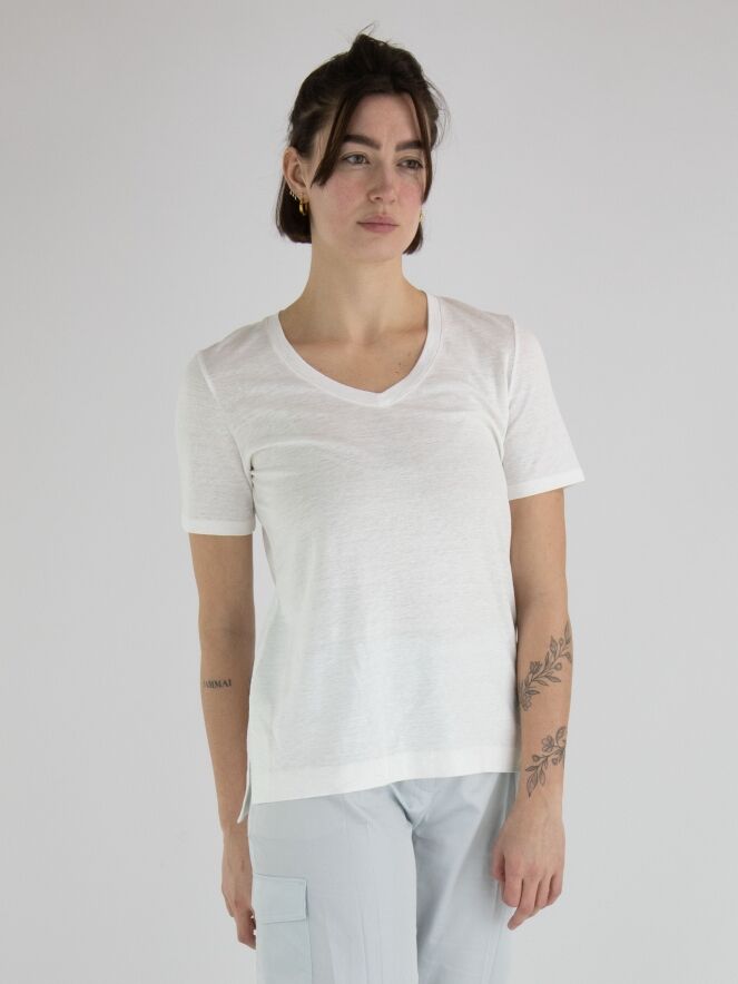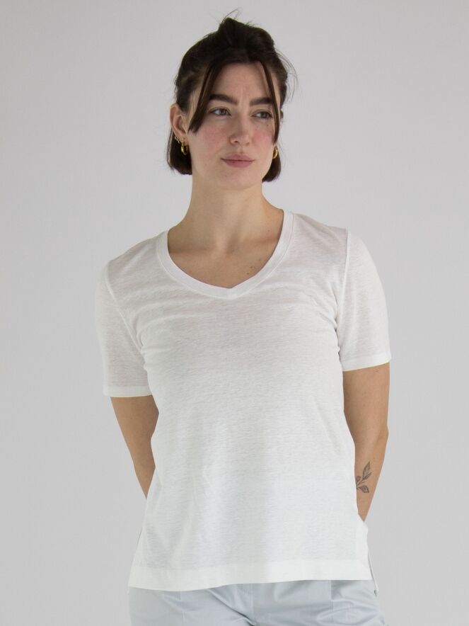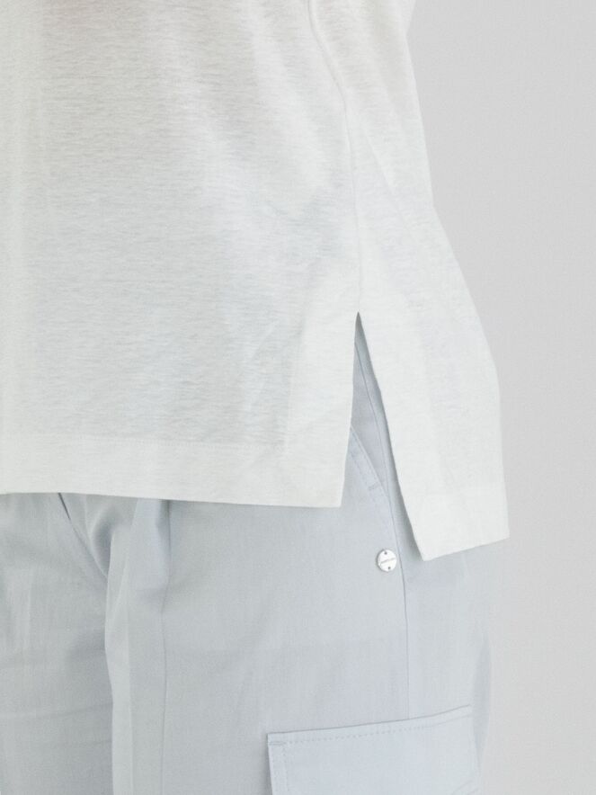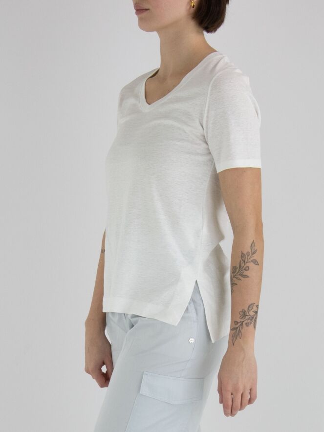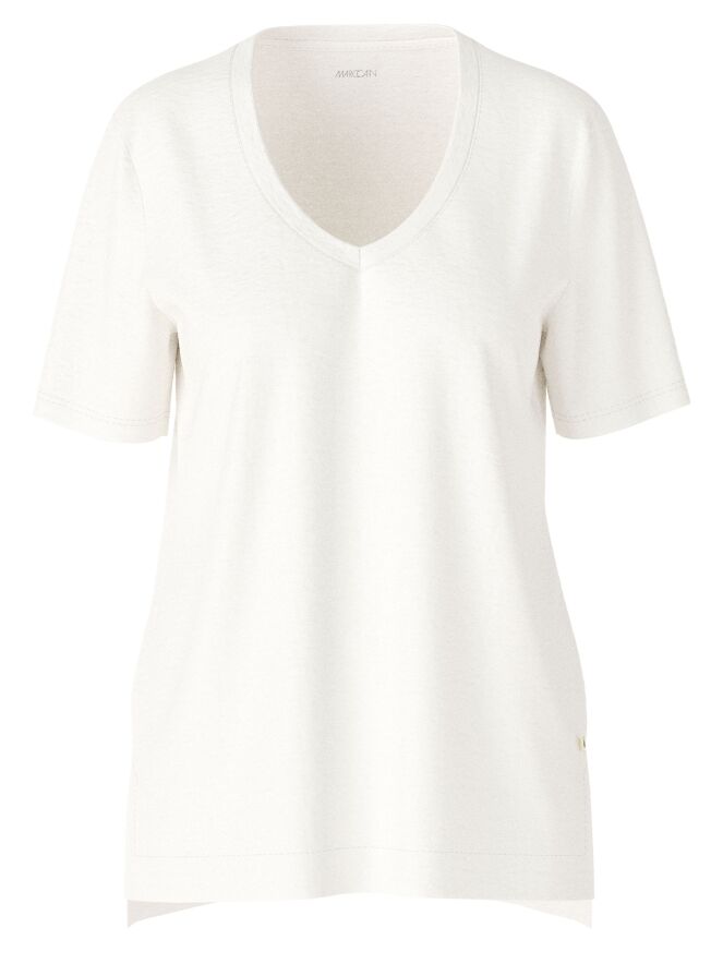 Ein Shirt von Marc Cain in weißer Farbe. Das Shirt hat einen rund geschnittenen V-Ausschnitt und kurze Ärmel. An der Unterseite befindet sich auf beiden Seiten ein kurzer Schlitz. Dieses Shirt kann bei 30 Grad gewaschen werden.