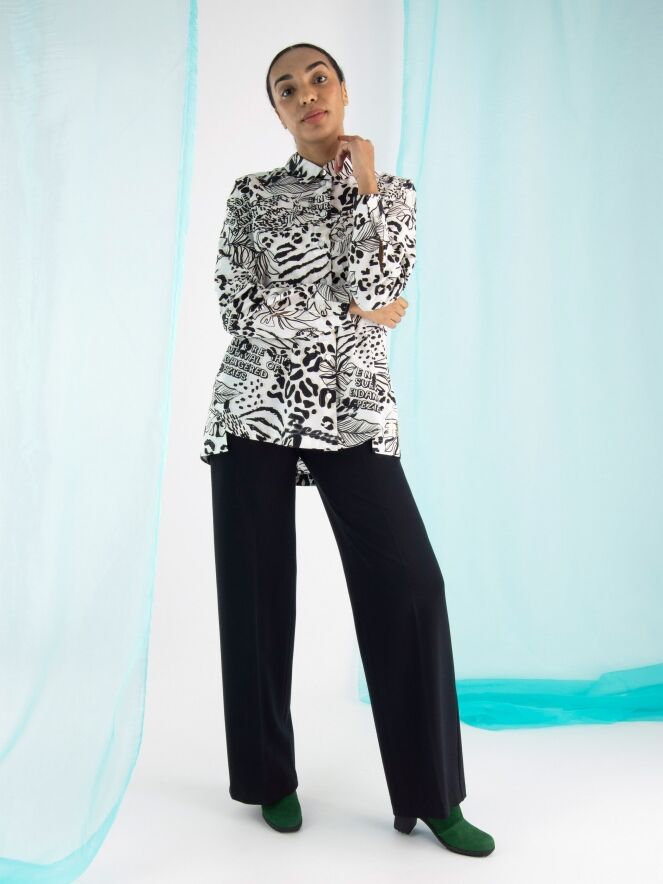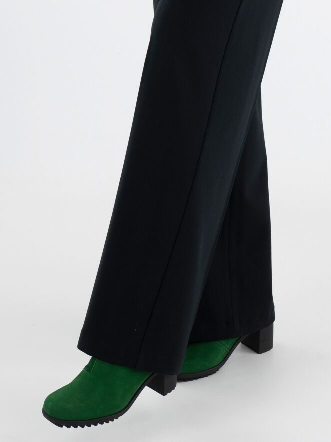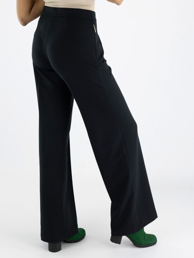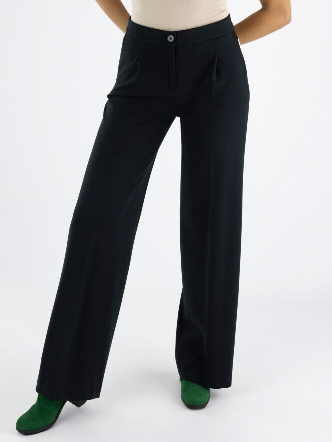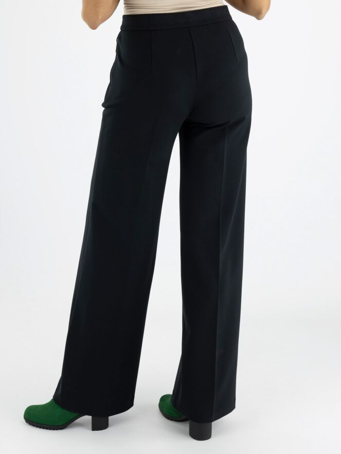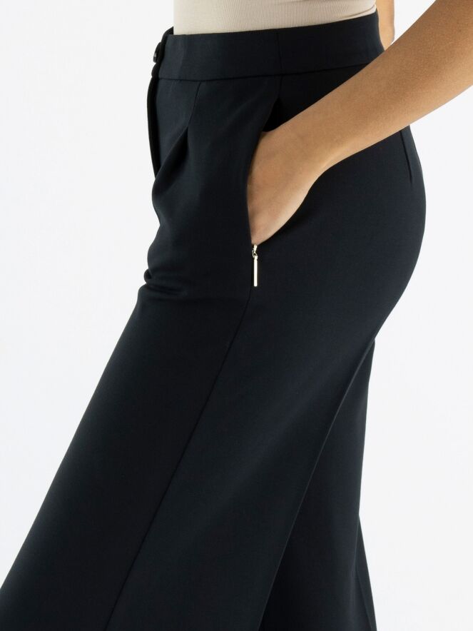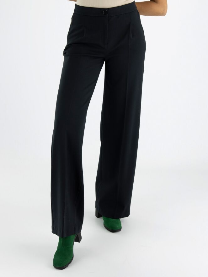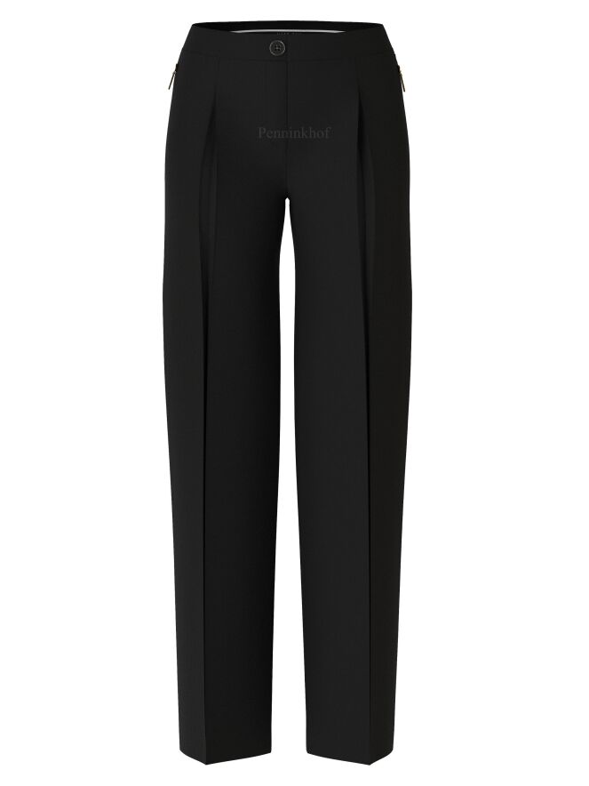 Eine Hose von Marc Cain in Schwarz. Die Hose hat zwei Bundfalten, und die Seitentaschen verfügen über einen verdeckten Reißverschluss. In der Mitte der Beine befindet sich eine eingebügelte Falte. Diese Hose kann bei 30 Grad gewaschen werden.