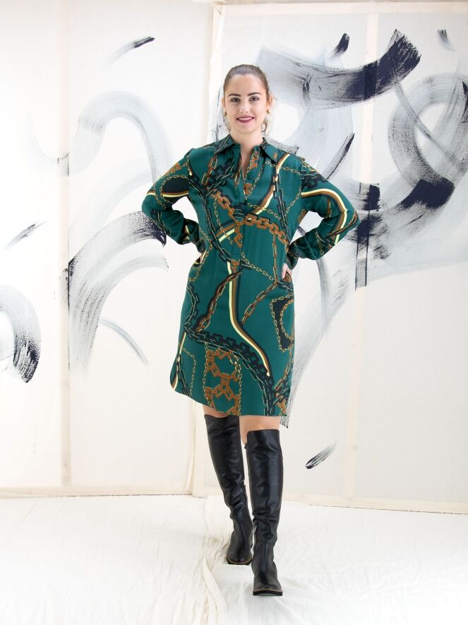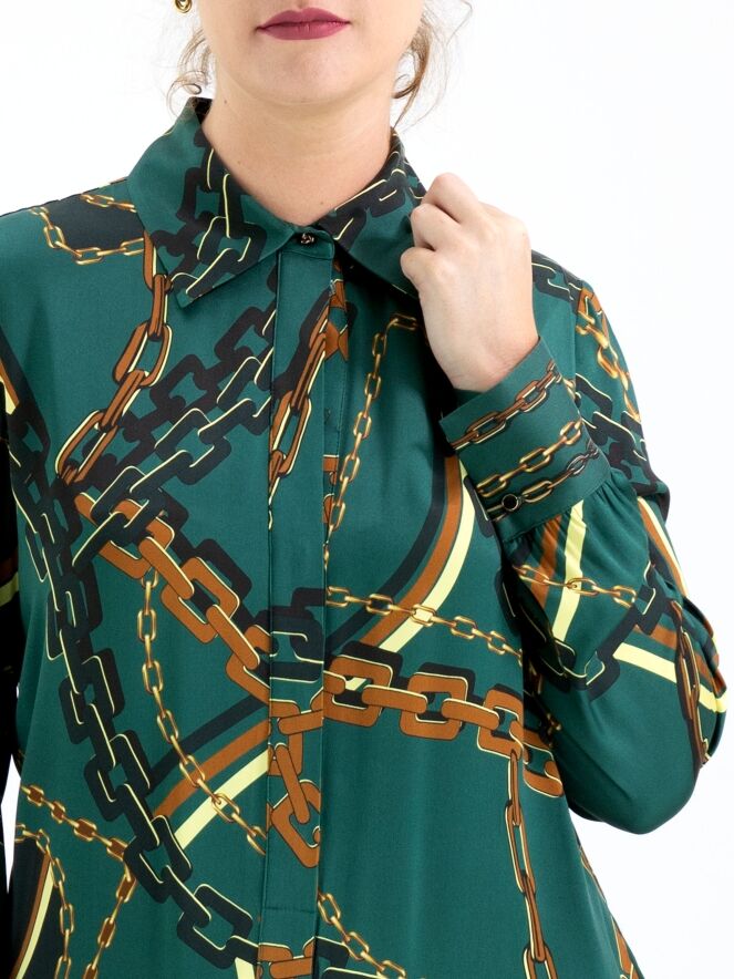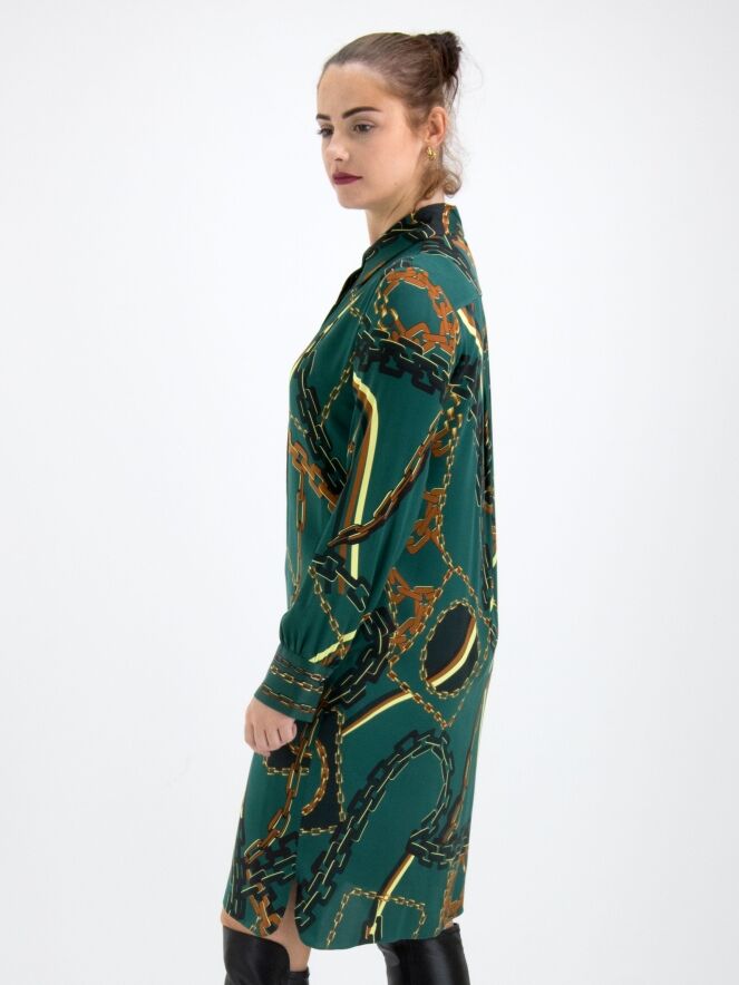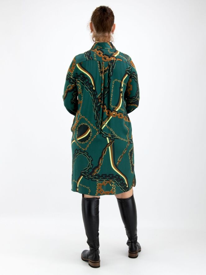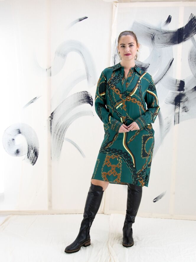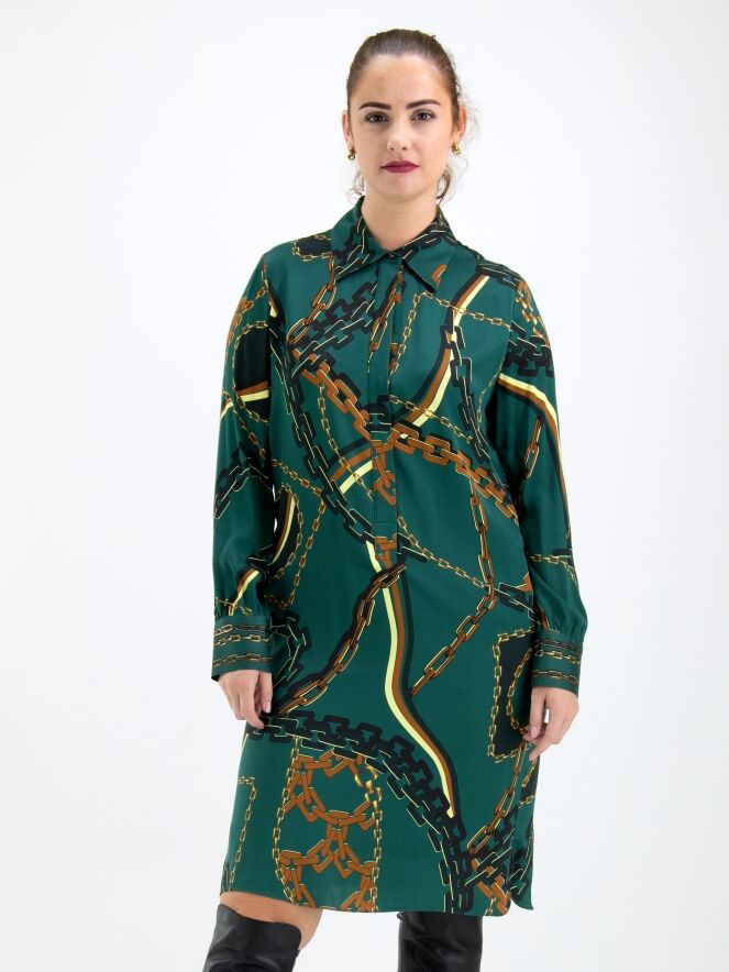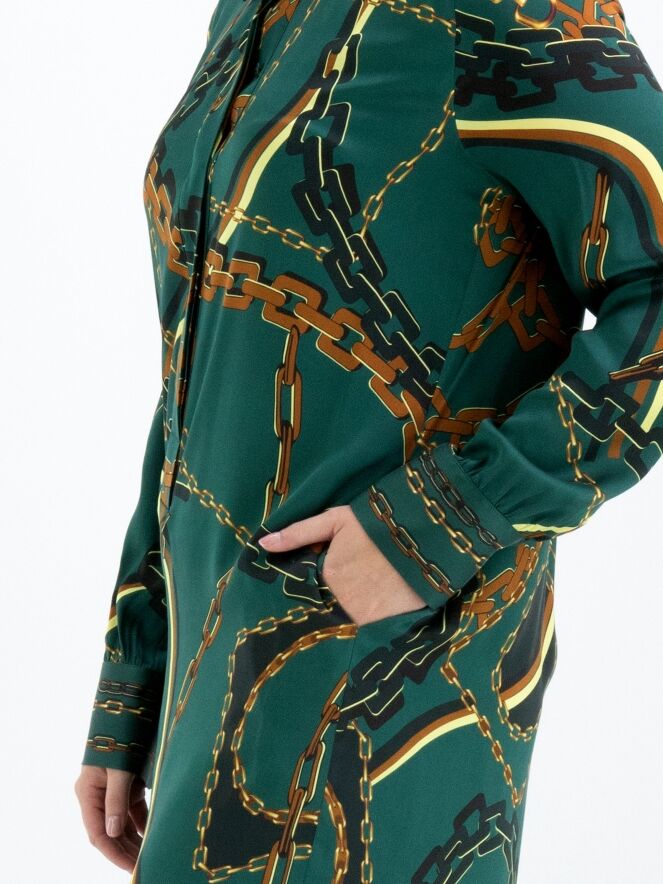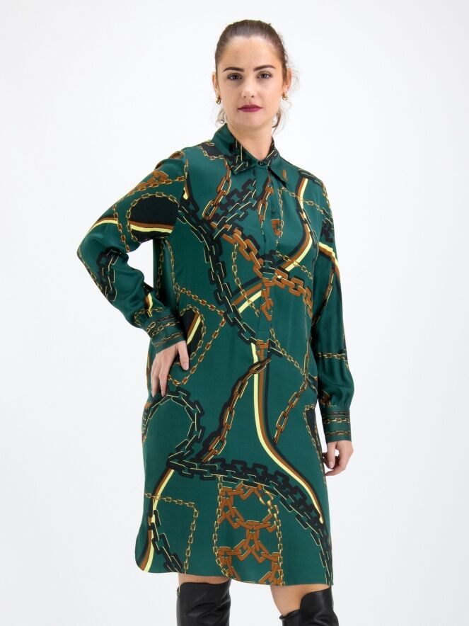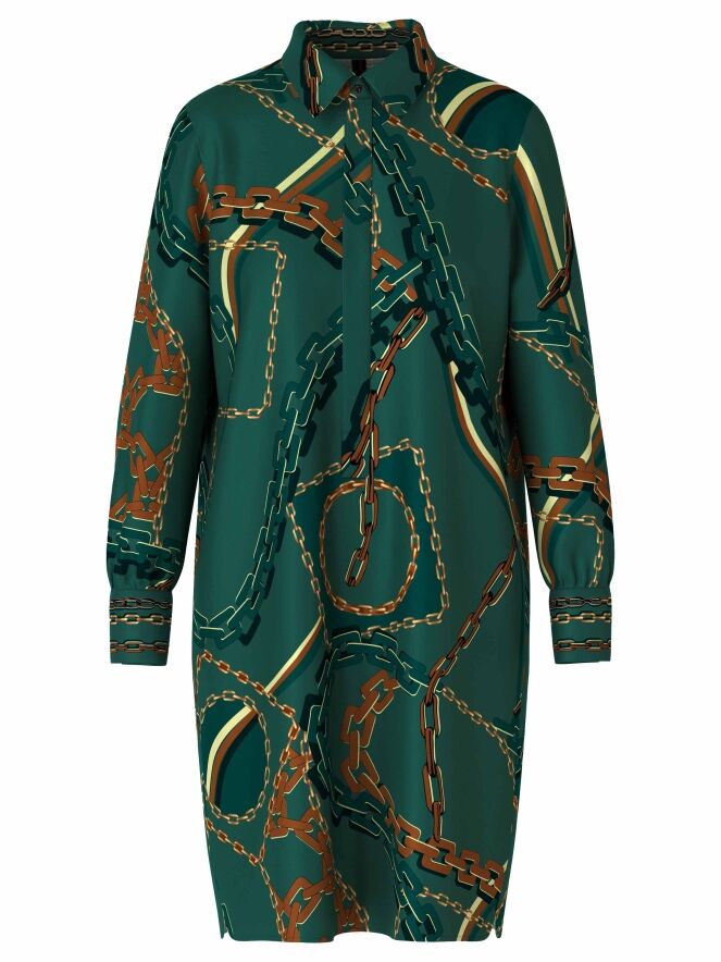 Ein Durchknopfkleid von Marc Cain in einem Hermes-Druck mit Dunkelgrün als Grundfarbe. Das Kleid hat eine versteckte Schließung bis unter die Taille und sollte von Hand gewaschen werden.