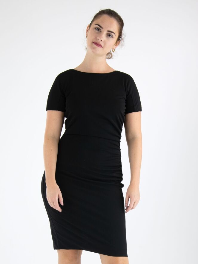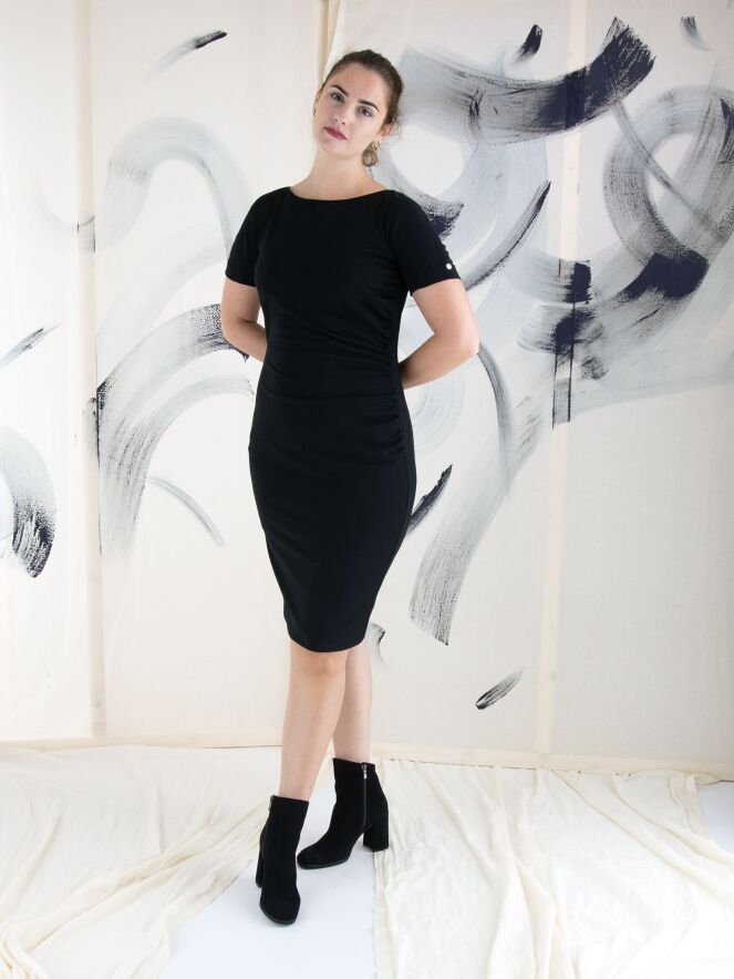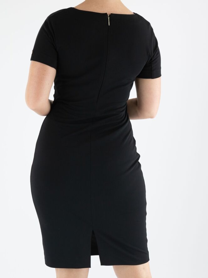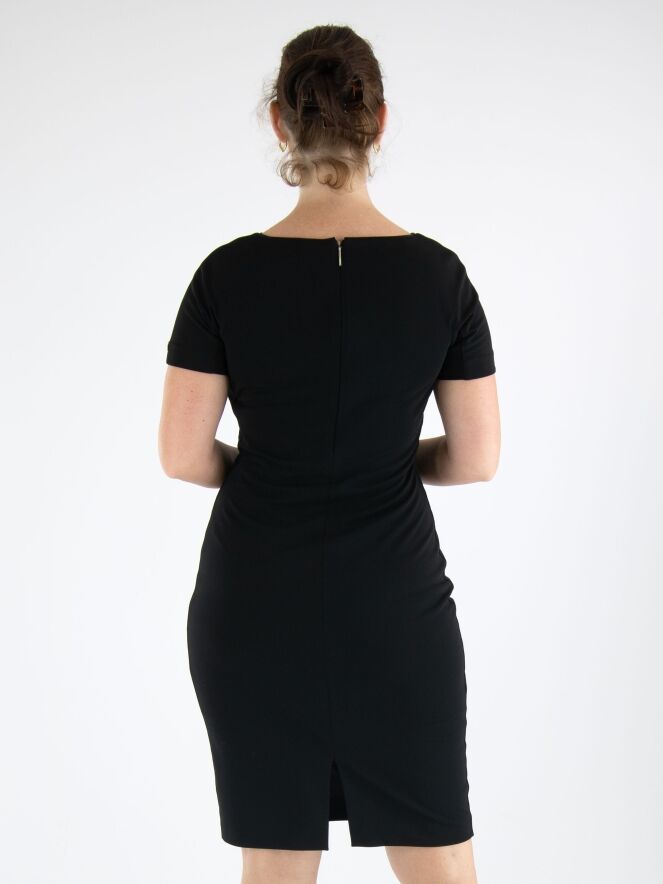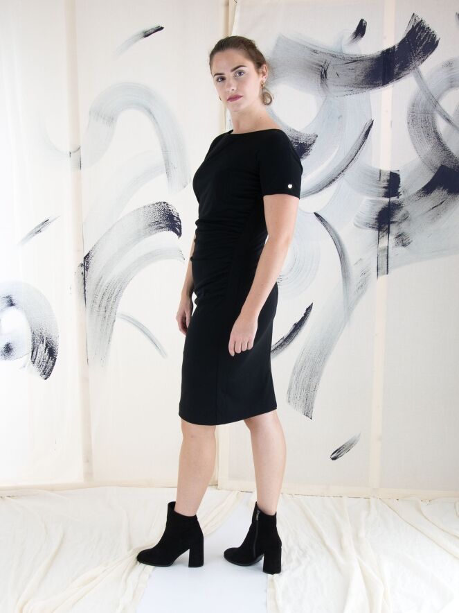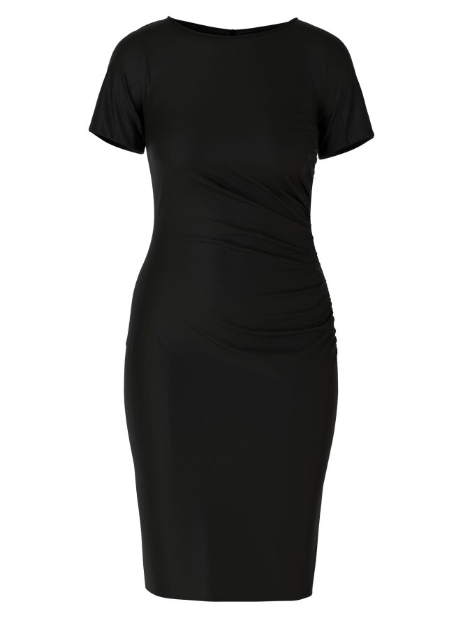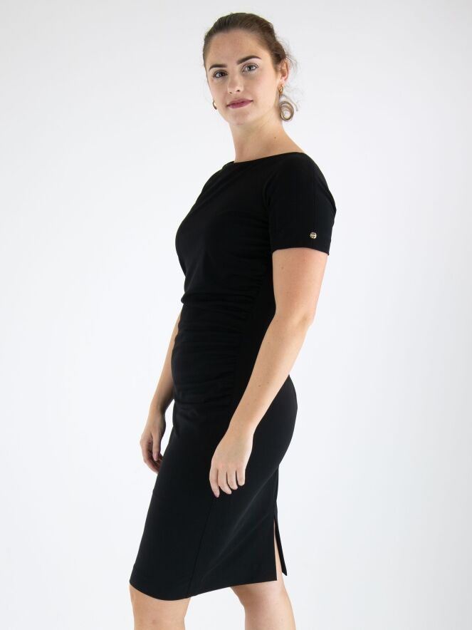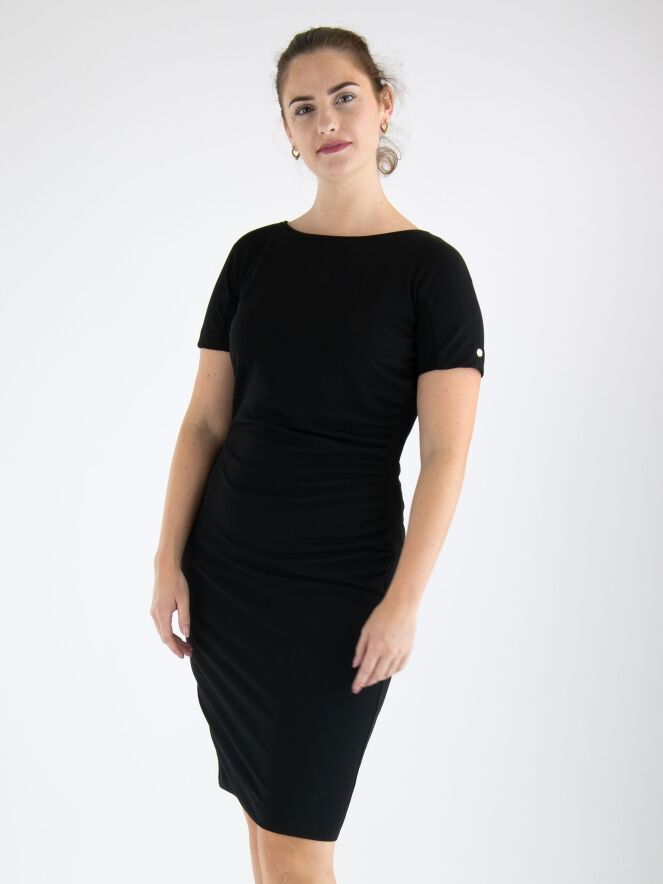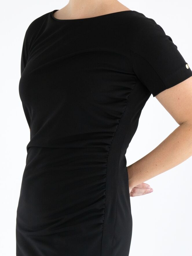 Ein Kleid von Marc Cain in Schwarz. An der linken Seite ist der Stoff entlang der Naht fein gefaltet, was vorne einen Drapierungseffekt erzeugt. Das Kleid hat kurze Ärmel, einen runden Ausschnitt und kann bei 30 Grad gewaschen werden.