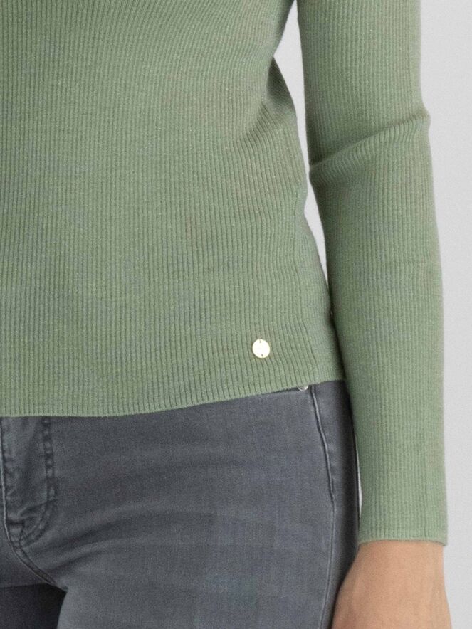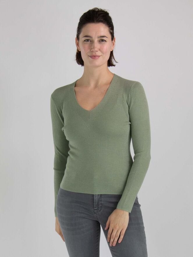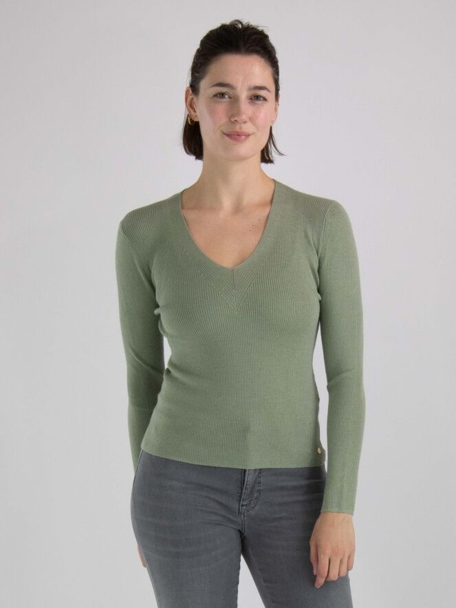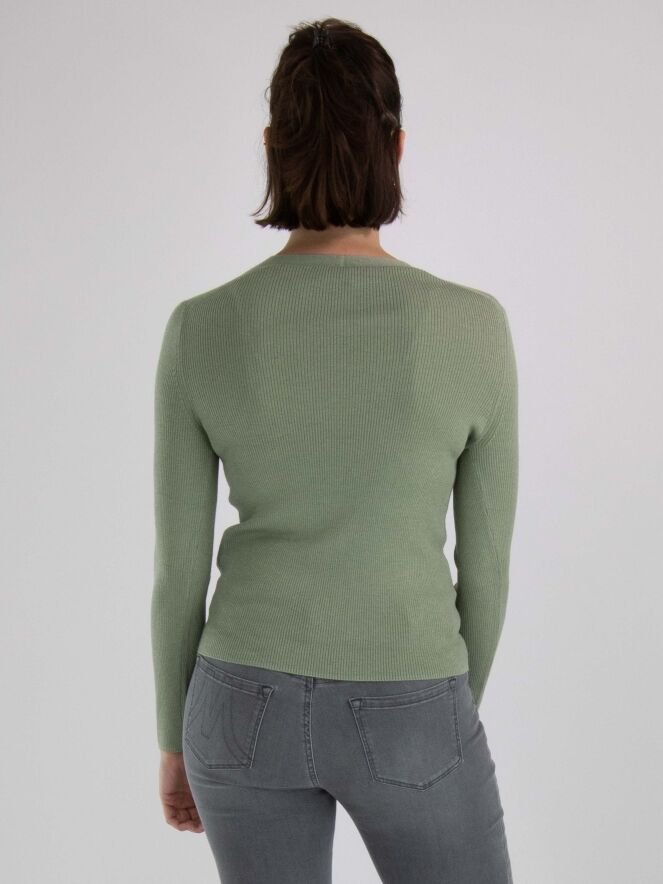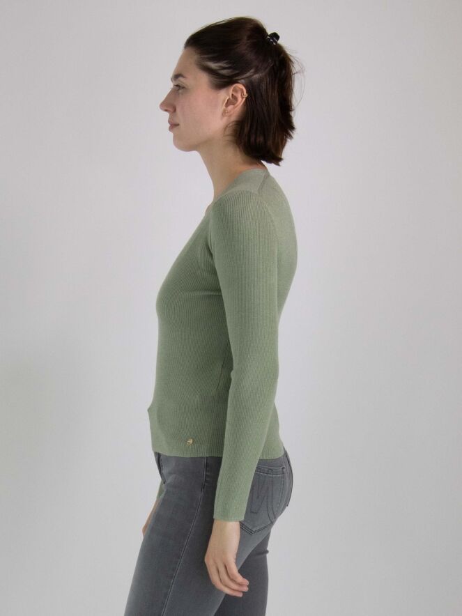 Ein Shirt von Marc Cain in einer gerippten Struktur in pastell Olivgrün. In den Stoff ist ein Silberfaden eingewebt. Das Shirt hat einen V-Ausschnitt und lange Ärmel. Dieses Shirt kann von Hand gewaschen werden.