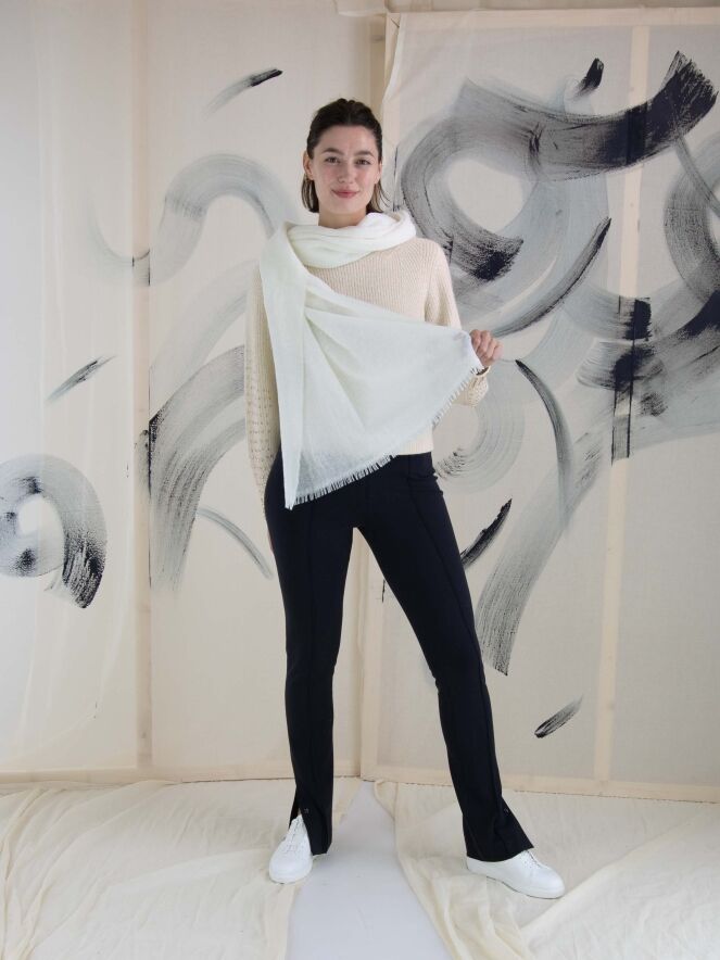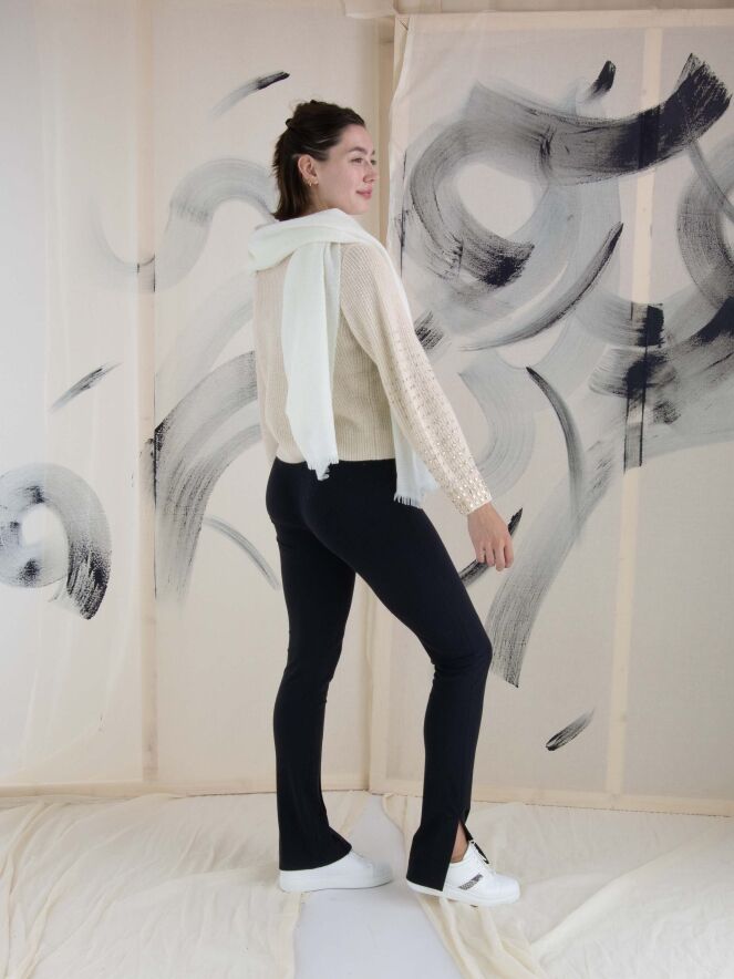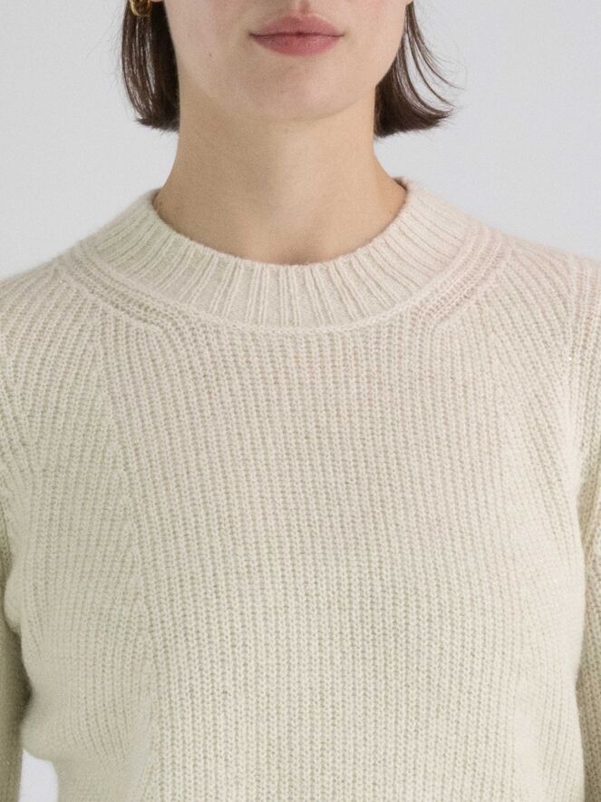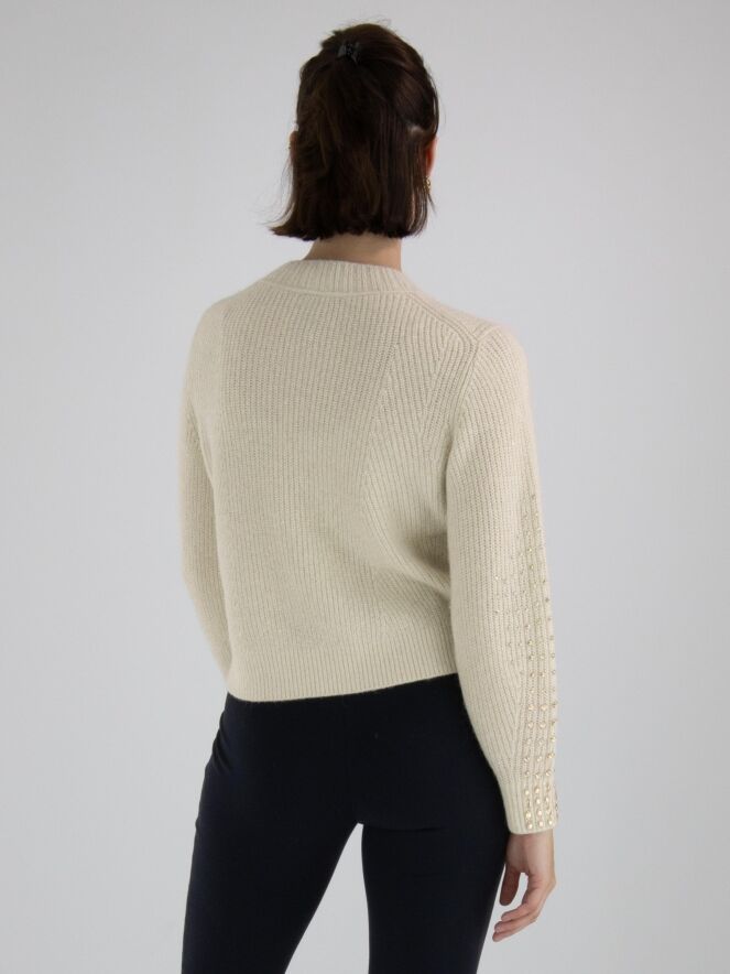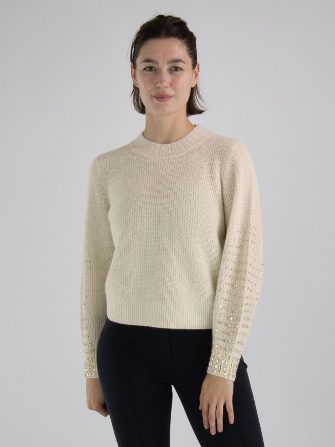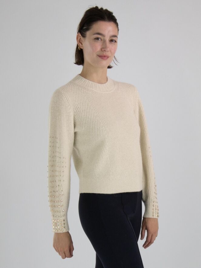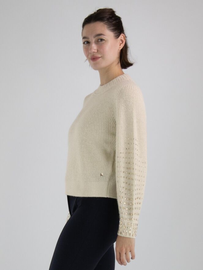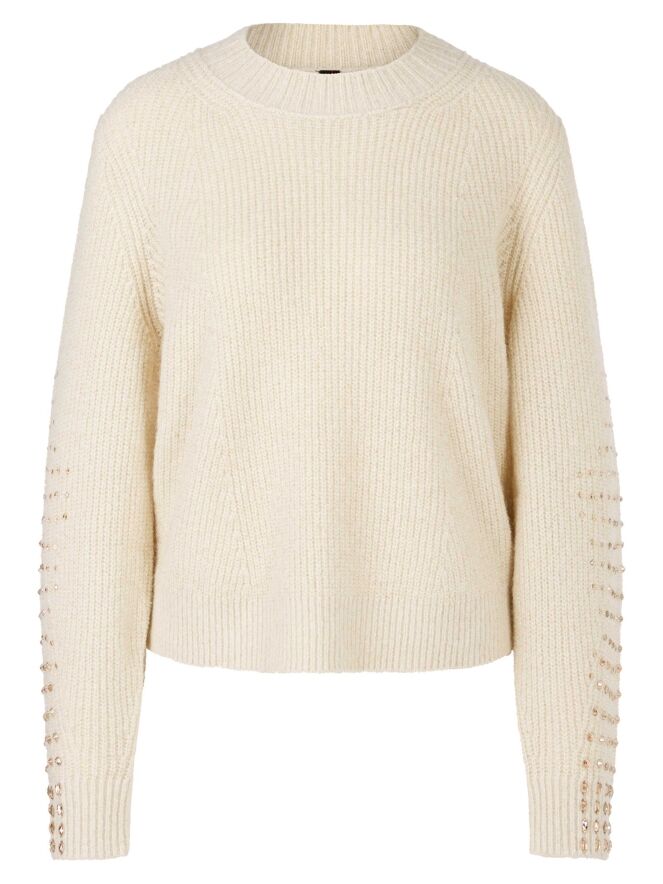 Ein luxuriöser Pullover von Marc Cain in Cremeweiß, durchzogen mit Silberfaden. An der Außenseite der langen Ärmel sind Strasssteine in verschiedenen Formen und in hellem Pfirsichton angebracht. Dieser Pullover kann von Hand gewaschen werden.