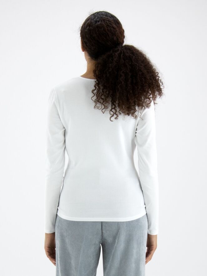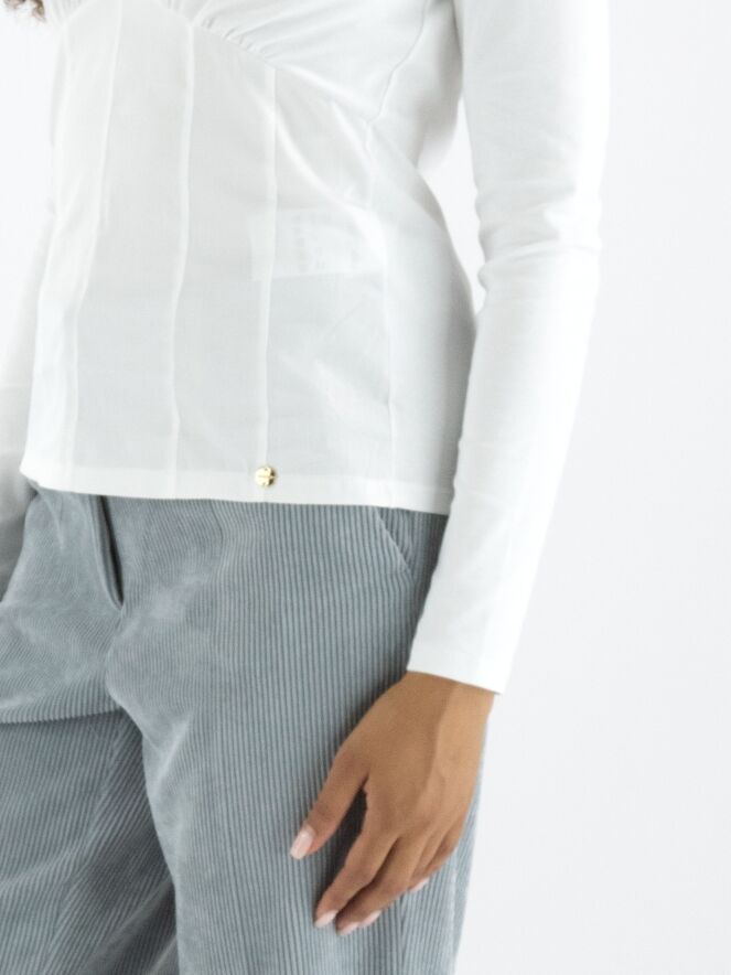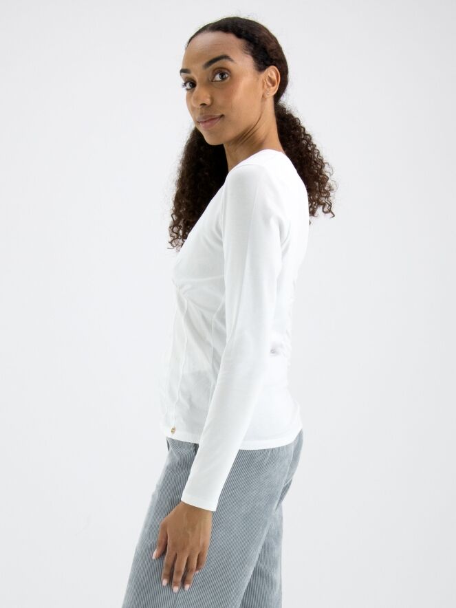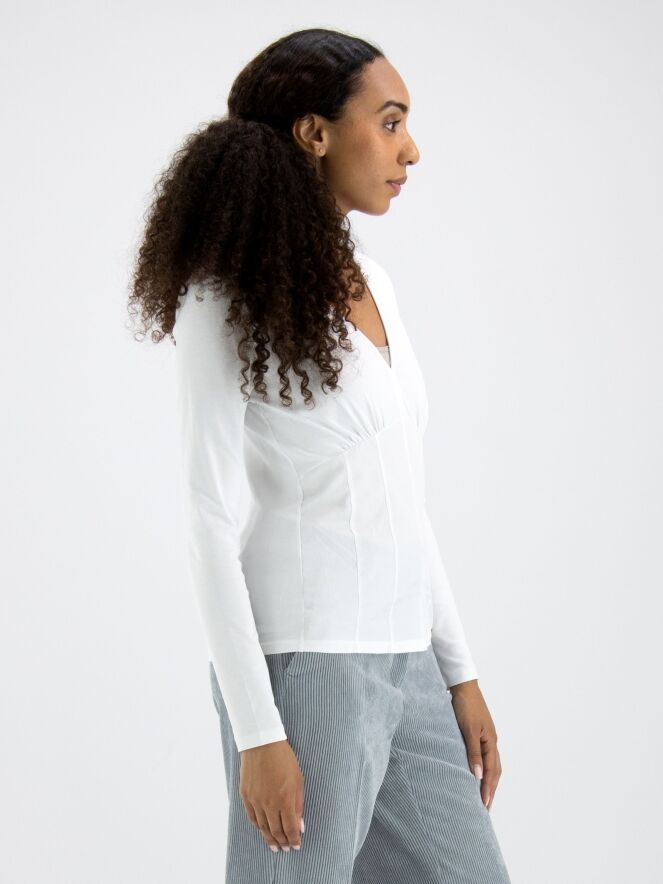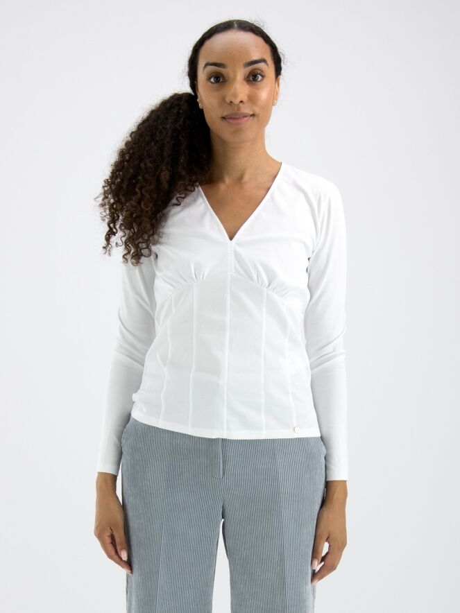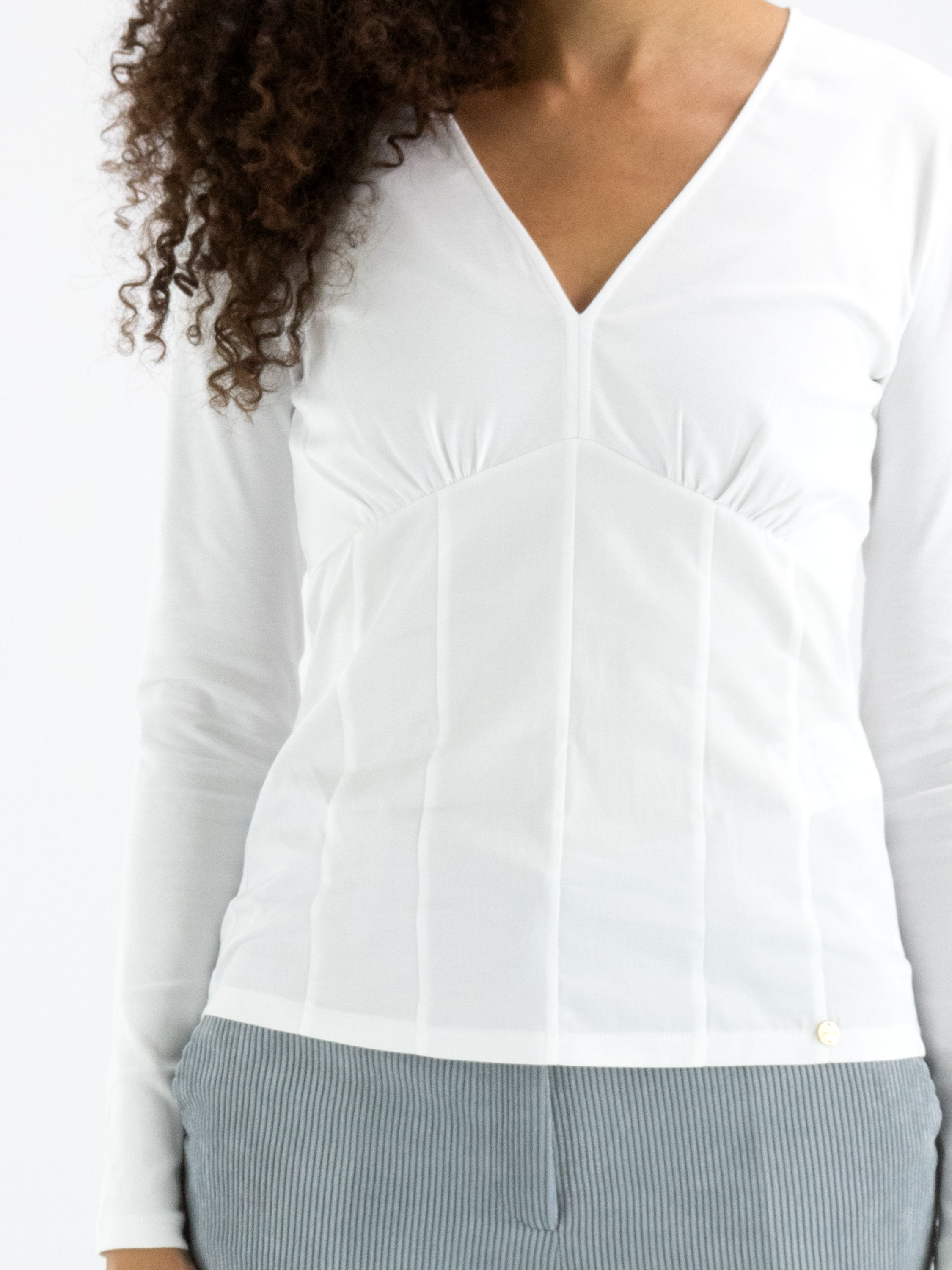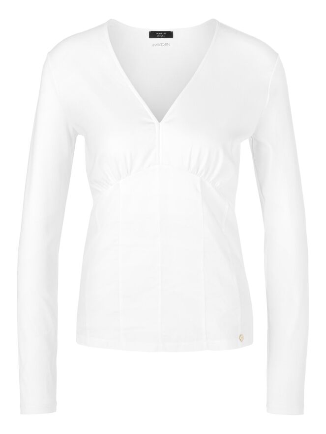 Ein Shirt von Marc Cain in Weiß. Das Shirt hat einen V-Ausschnitt, und unterhalb der Brust befindet sich eine Naht, entlang derer der Stoff fein gerafft ist. Von dieser Naht verlaufen einige Taillenabnäher nach unten. Dieses Shirt kann bei 30 Grad gewaschen werden.