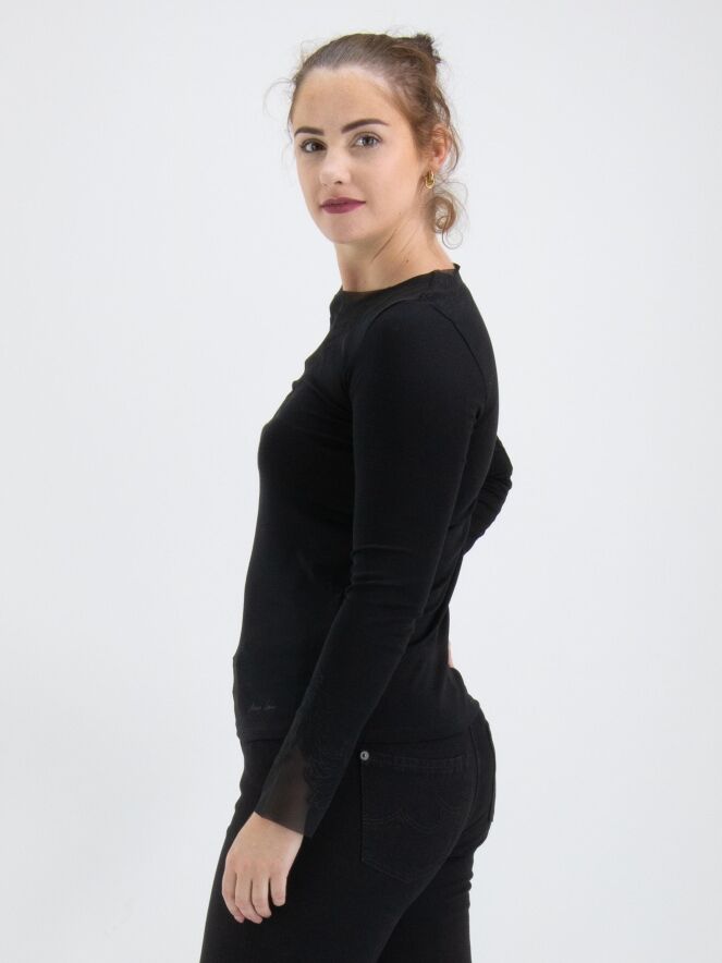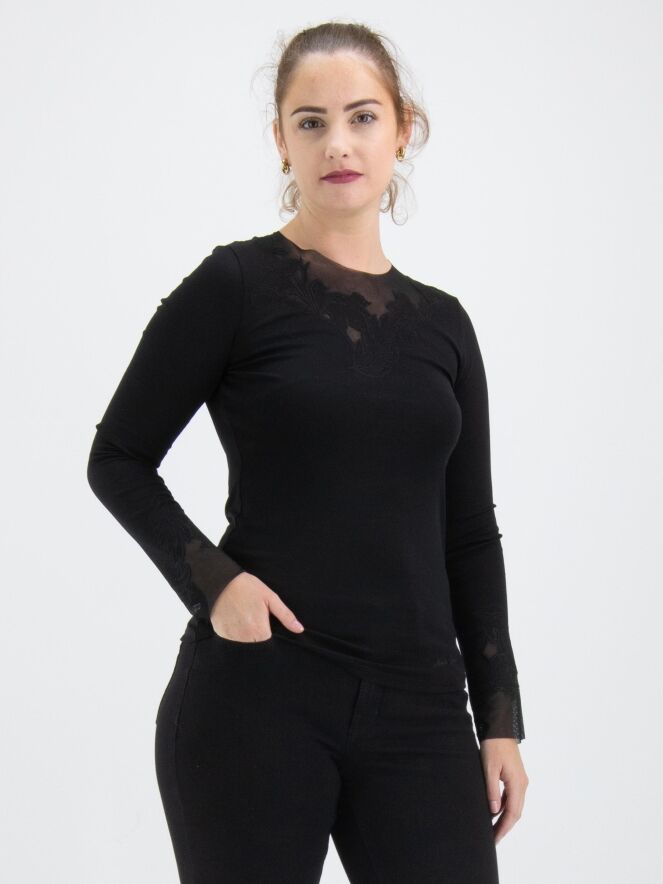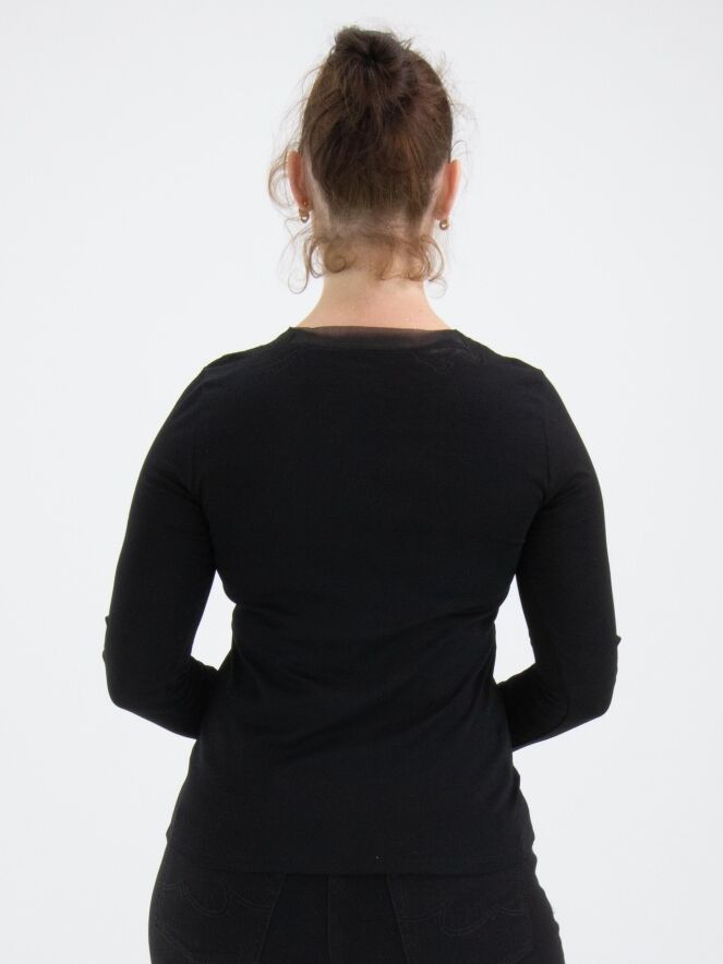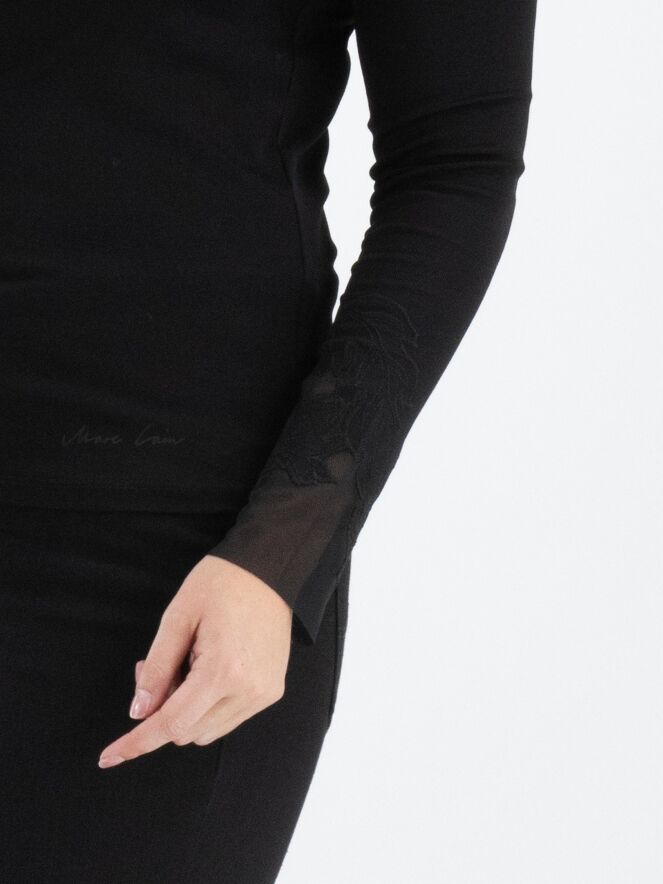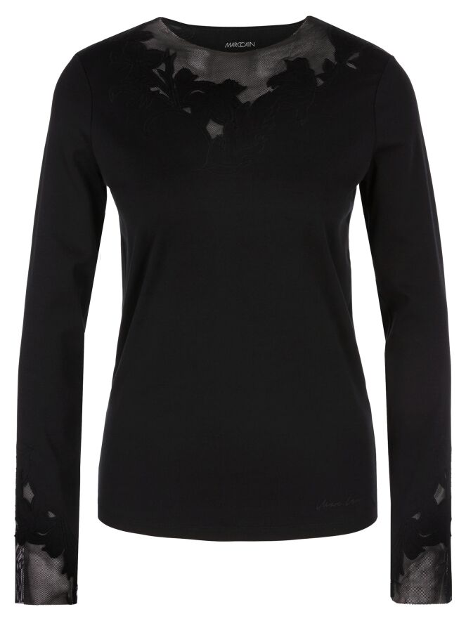 Ein Shirt von Marc Cain in Schwarz. Entlang des Randes des runden Halsausschnitts befindet sich ein Voile-Stoff mit einer Blattstruktur, der mit Biesen gestaltet wird. Dieses Detail findet sich auch an den Enden der langen Ärmel wieder. Dieses Shirt kann bei 30 Grad gewaschen werden.