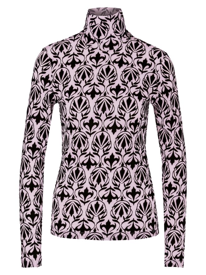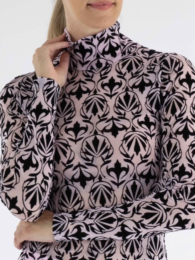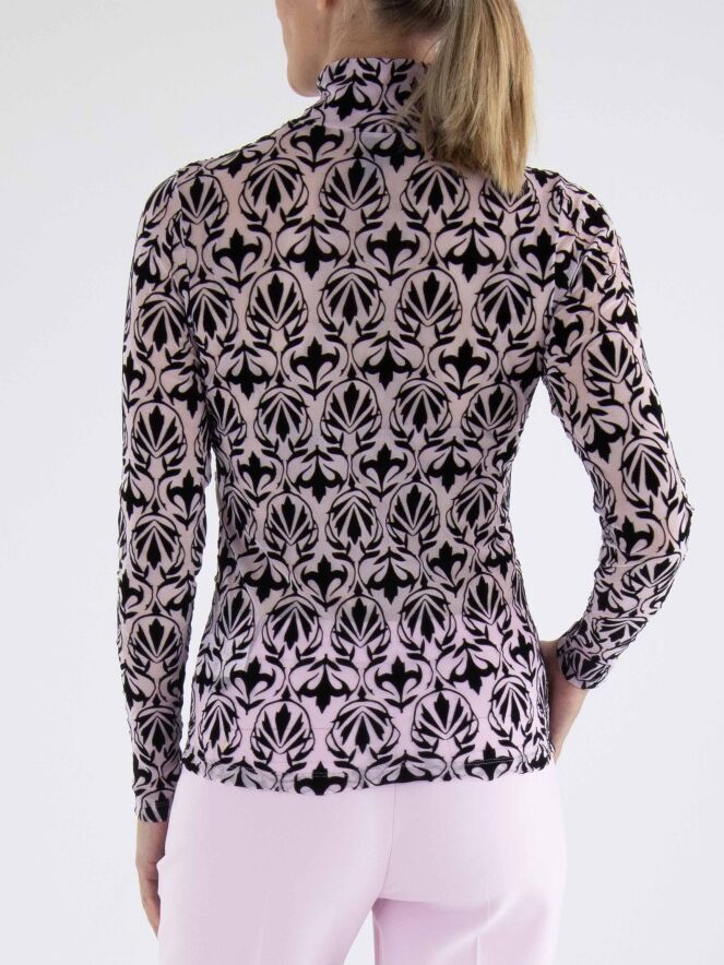 Ein transparentes Ausbrenner-Shirt von Marc Cain in einem großen Barockdruck mit den Farben Schwarz und Rosa. Die schwarzen Teile sind aus weichem Velours. Das Shirt hat lange Ärmel und einen Rollkragen. Dieses Shirt kann bei 30 Grad gewaschen werden.