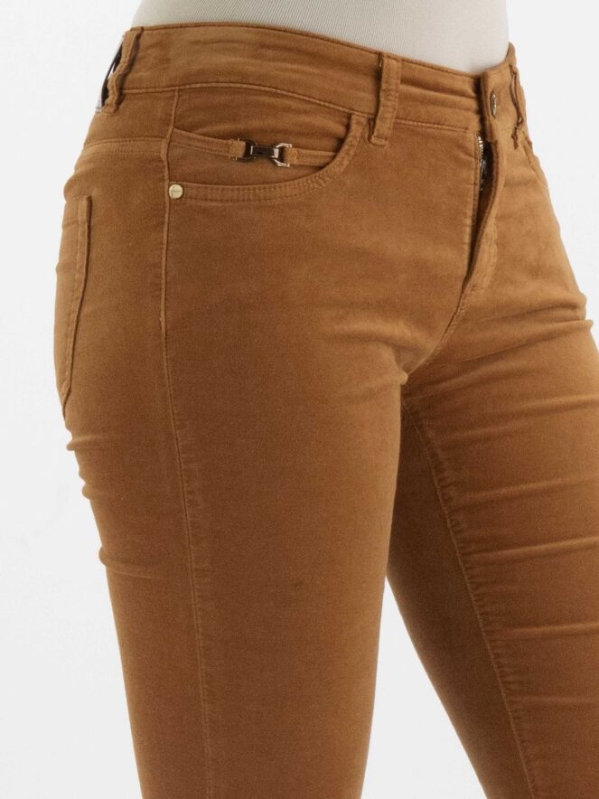 Eine Velours-Hose von Marc Cain in Cognacfarbe. An der rechten vorderen Tasche befindet sich eine Biese mit einem Metallstück. Diese Hose kann bei 30 Grad gewaschen werden.