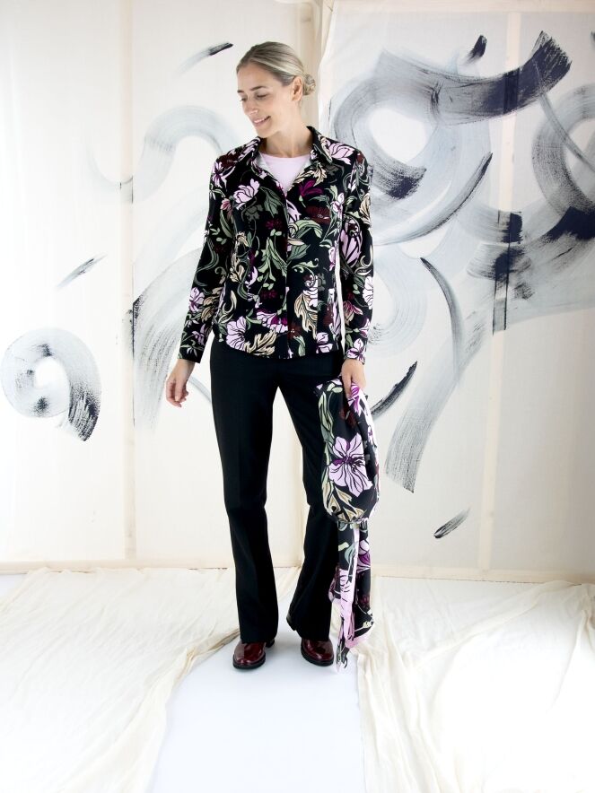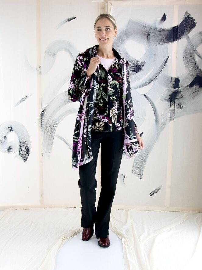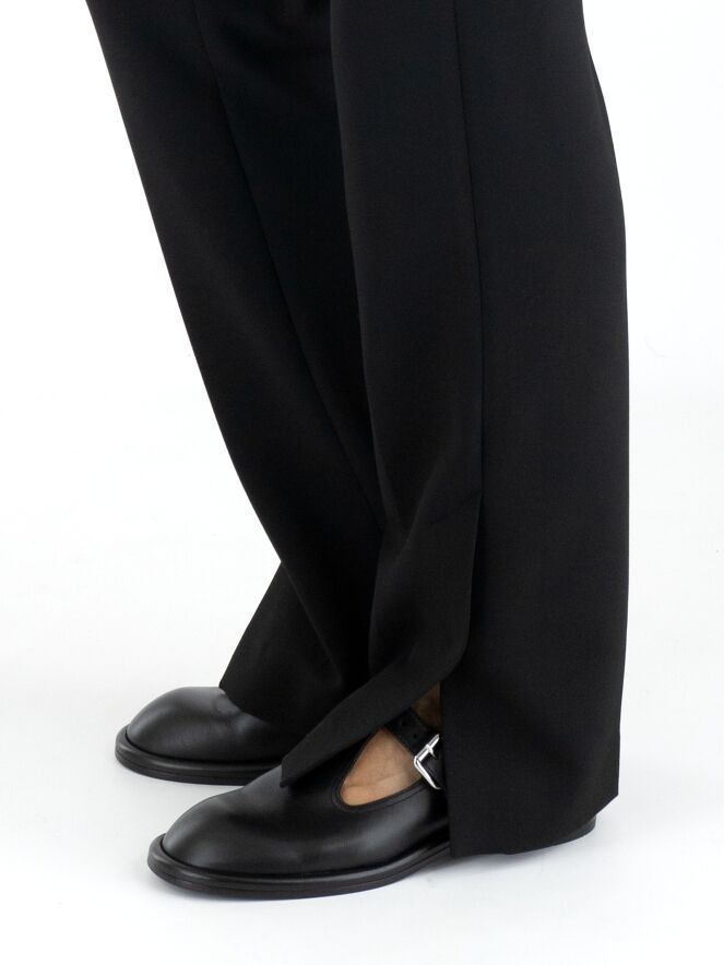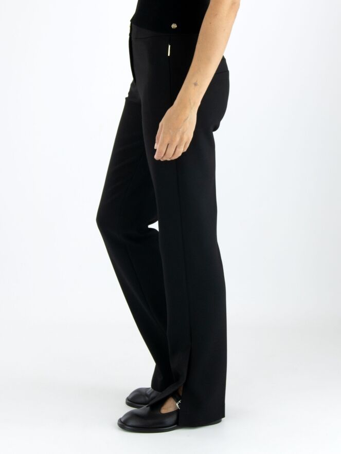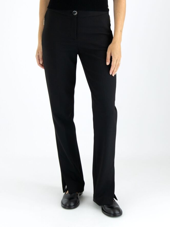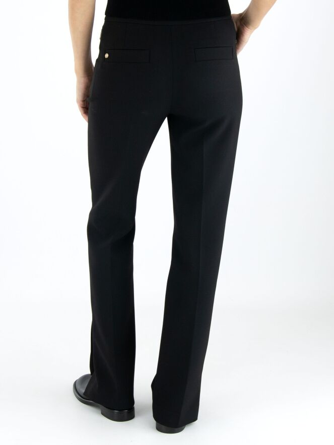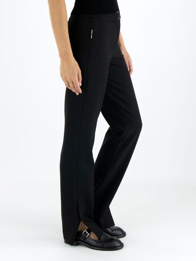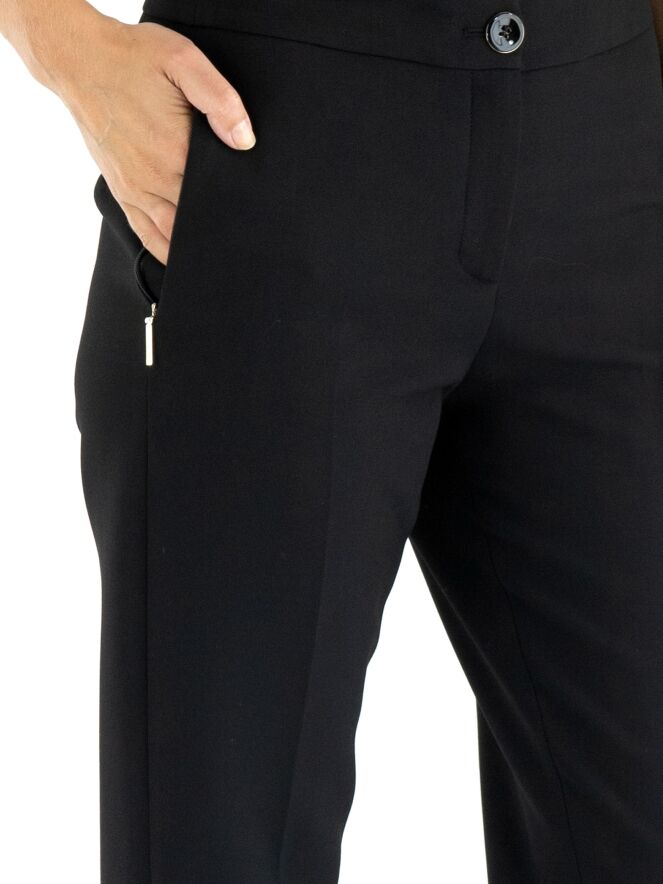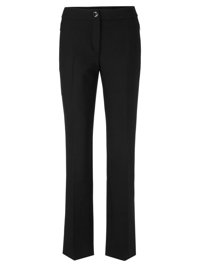 Eine Hose von Marc Cain in Schwarz. Die Eingrifftaschen haben einen Reißverschluss mit einem goldfarbenen Zipper. In der Mitte der Hosenbeine ist eine Bügelfalte. Am unteren Ende der Hosenbeine befinden sich an den Seiten lange Schlitze mit einem Knopf in der Mitte. Diese Hose kann bei 30 Grad gewaschen werden.