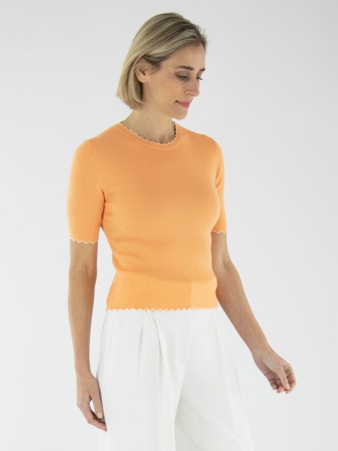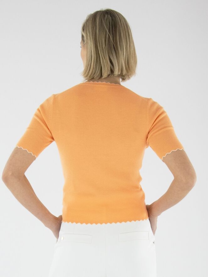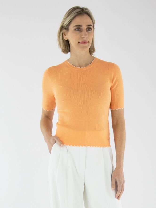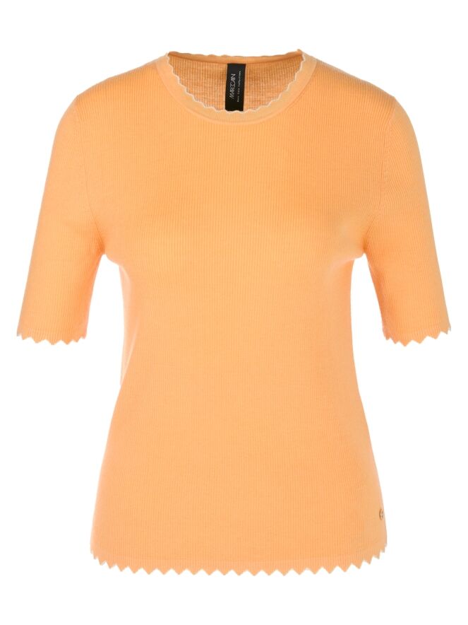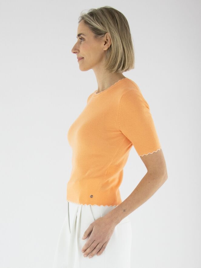 Ein Shirt von Marc Cain in Orange. Der Stoff ist fein gerippt. Der Rand des runden Ausschnitts, der kurzen Ärmel und des Saums ist in einem welligen Muster mit einer weißen Biese gestaltet. Dieses Shirt sollte von Hand gewaschen werden.