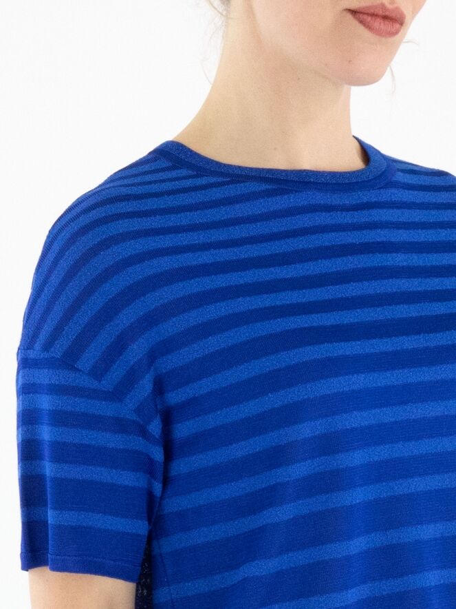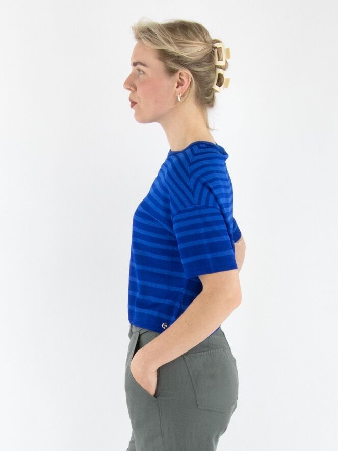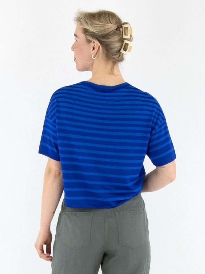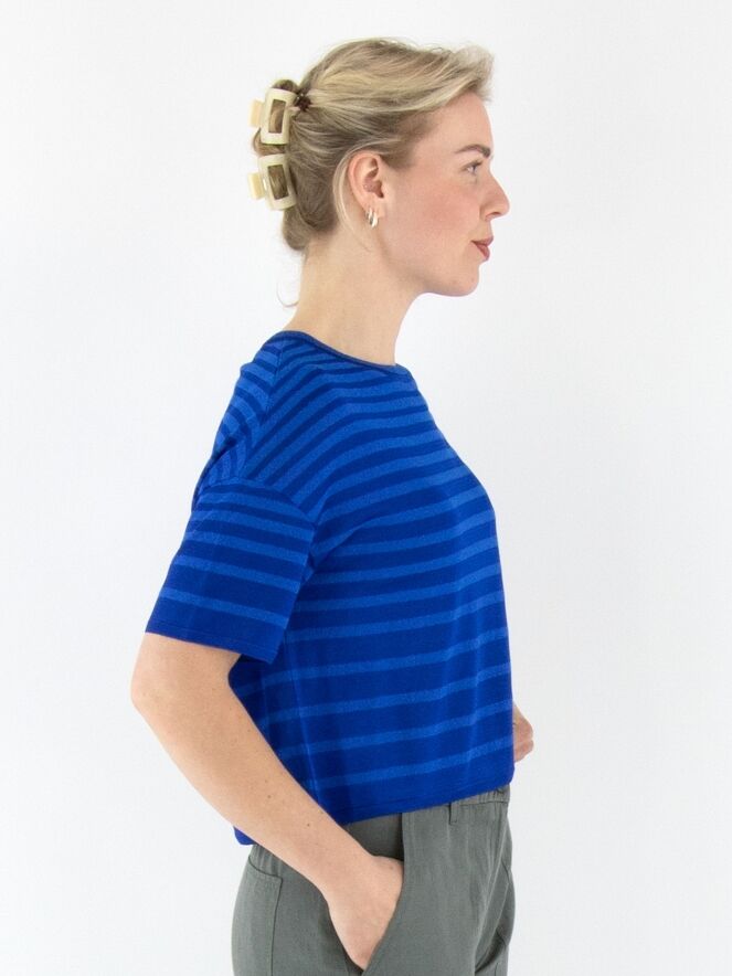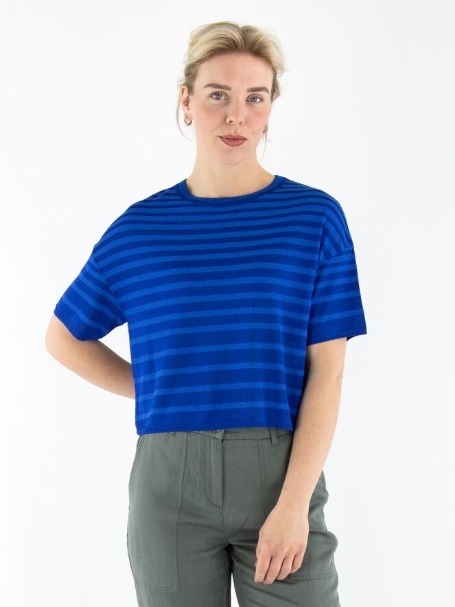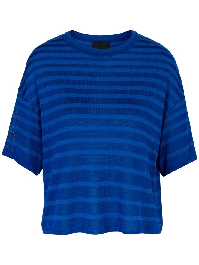 Ein kurzes Shirt mit einem Streifenmuster in zwei Nuancen Kobaltblau. Das Shirt ist leicht transparent und hat einen runden Ausschnitt und kurze Ärmel. Dieses Shirt kann bei 30 Grad gewaschen werden.