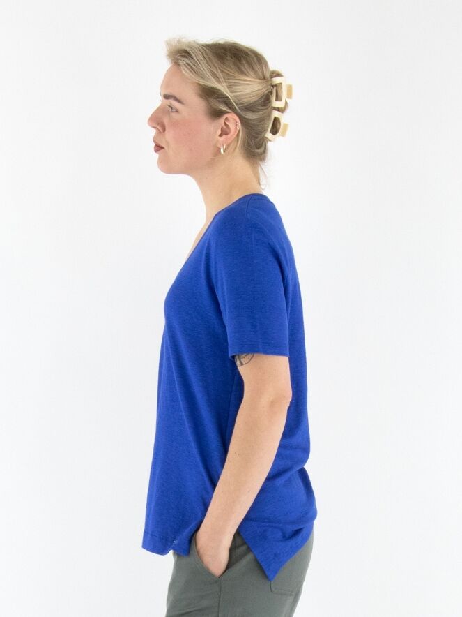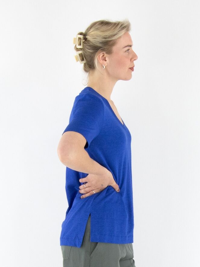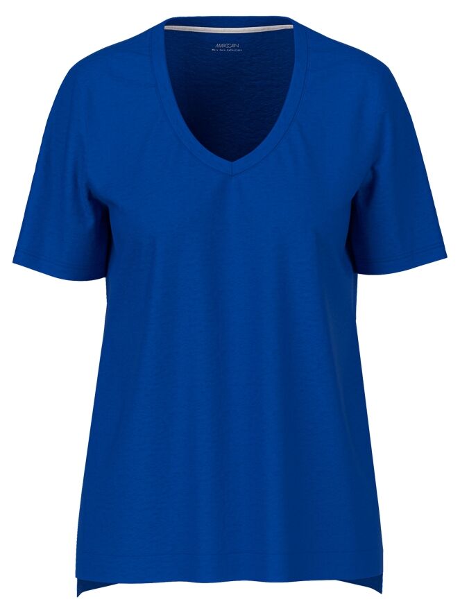 Ein Shirt von Marc Cain in Kobaltblau. Das Shirt hat einen V-Ausschnitt und an beiden Seiten unten einen kurzen Schlitz. Dieses Shirt kann bei 30 Grad gewaschen werden.